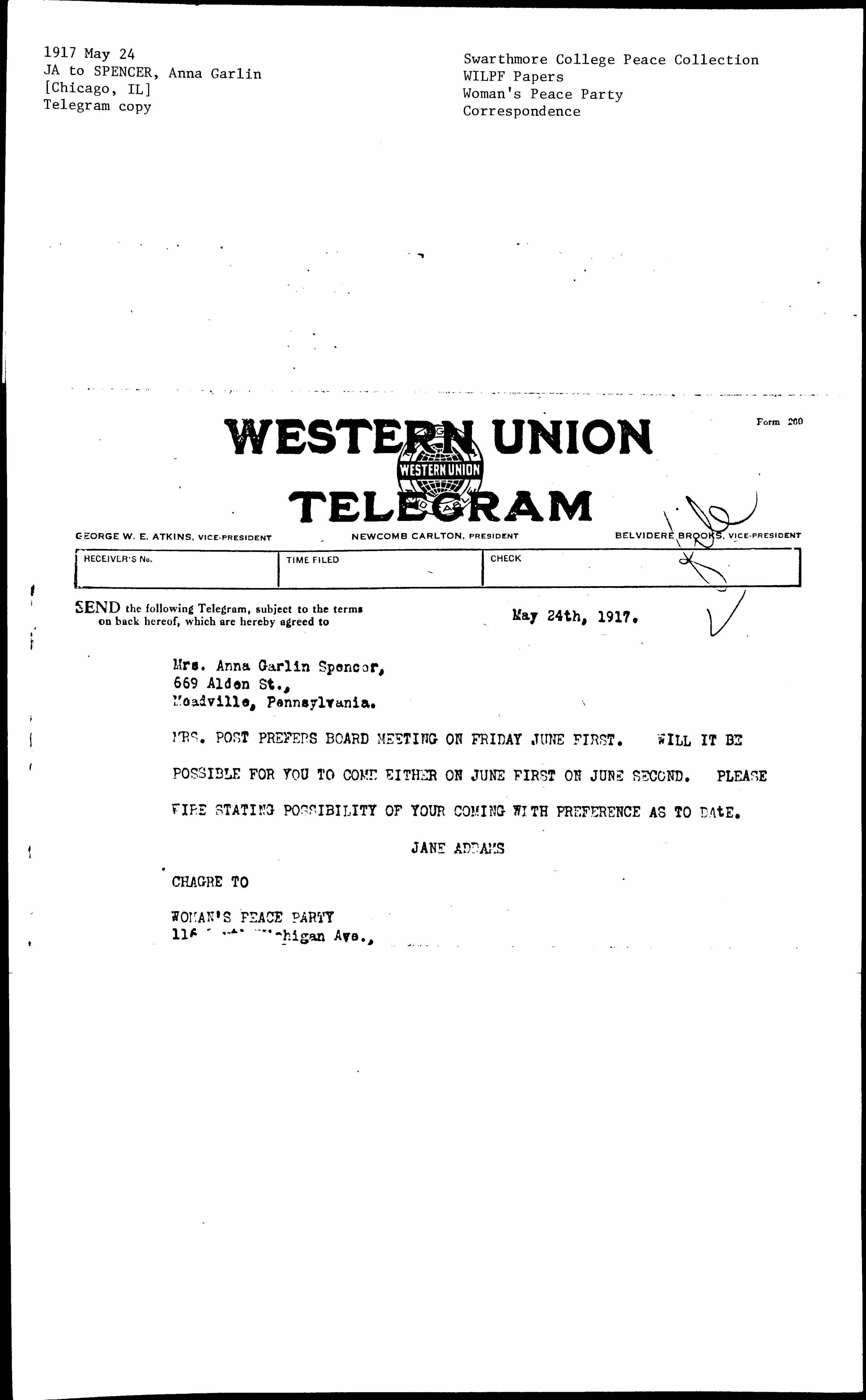 MRS. POST PREFERS BOARD MEETING ON FRIDAY JUNE FIRST. WILL IT BE POSSIBLE FOR YOU TO COME EITHER ON JUNE FIRST [OR] JUNE SECOND. PLEASE WIRE STATING POSSIBILITY OF YOUR COMING WITH PREFERENCE AS TO DATE.