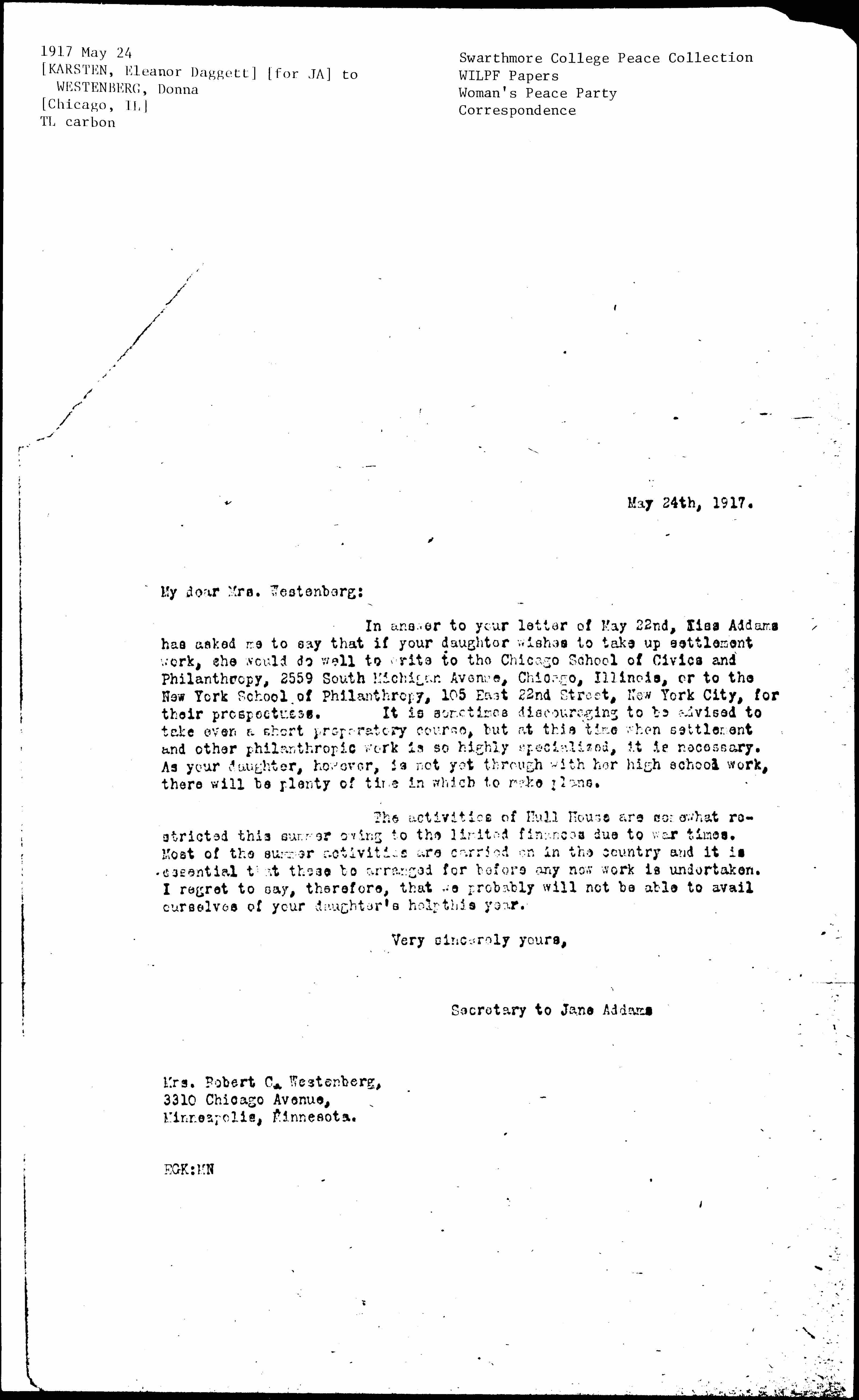 In answer to your letter of May 22nd, Miss Addams has asked me to say that if your daughter wishes to take up settlement work, she would do well to write to the Chicago School of Civics and Philanthropy, 2559 South Michigan Avenue, Chicago, Illinois, or to the New York School of Philanthropy, 105 East 22nd Street, New York City, for their prospectuses. It is sometimes discouraging to be advised to take even a short preparatory course, but at this time when settlement and other philanthropic work is so highly specialized, it is necessary. As your daughter, however, is not yet through with her high school work, there will be plenty of time in which to make plans.