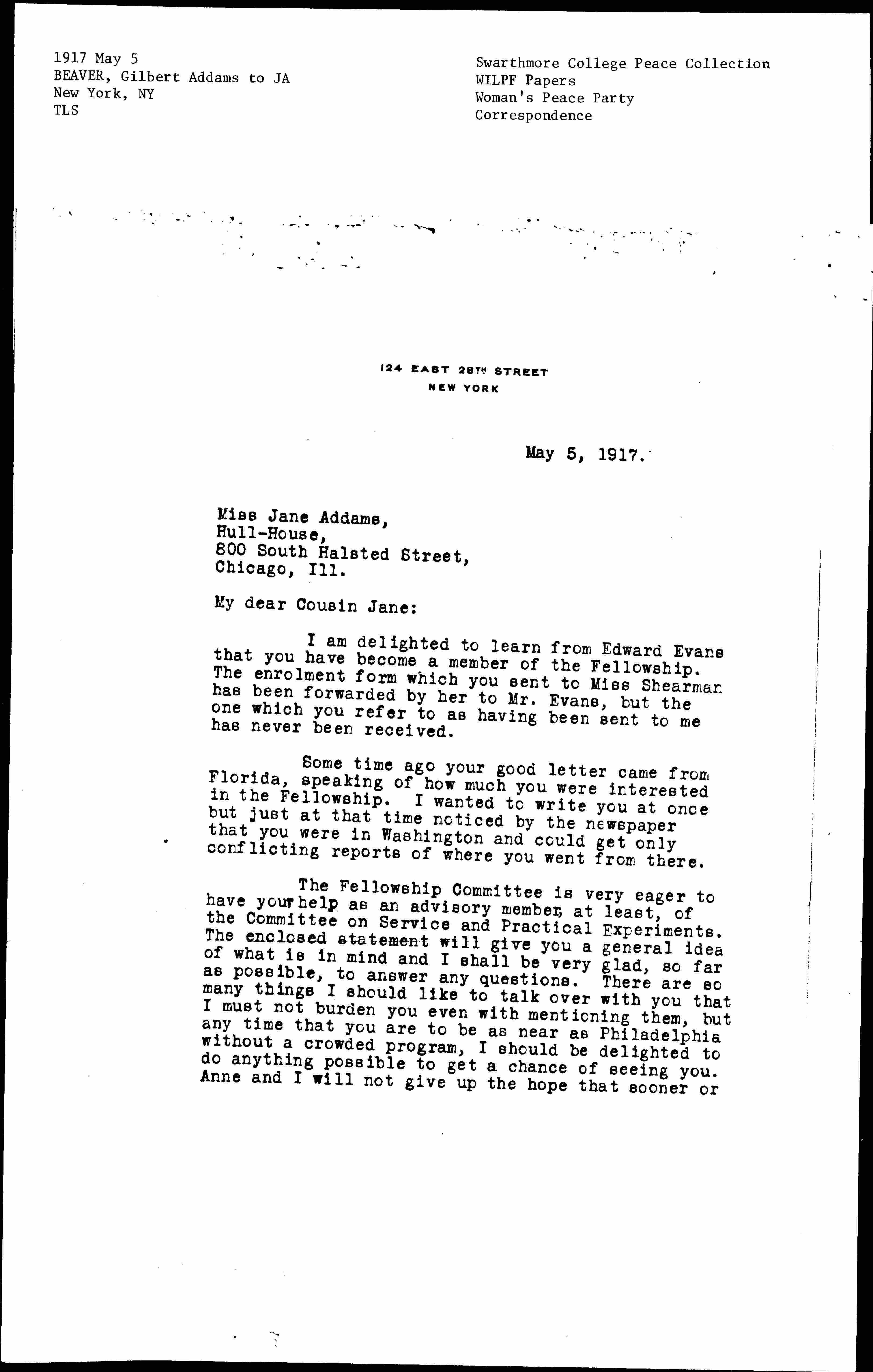I am delighted to learn from Edward Evans that you have become a member of the Fellowship. The [enrollment] form which you sent to Miss Shearman has been forwarded by her to Mr. Evans, but the one which you refer to as having been sent to me has never been received.