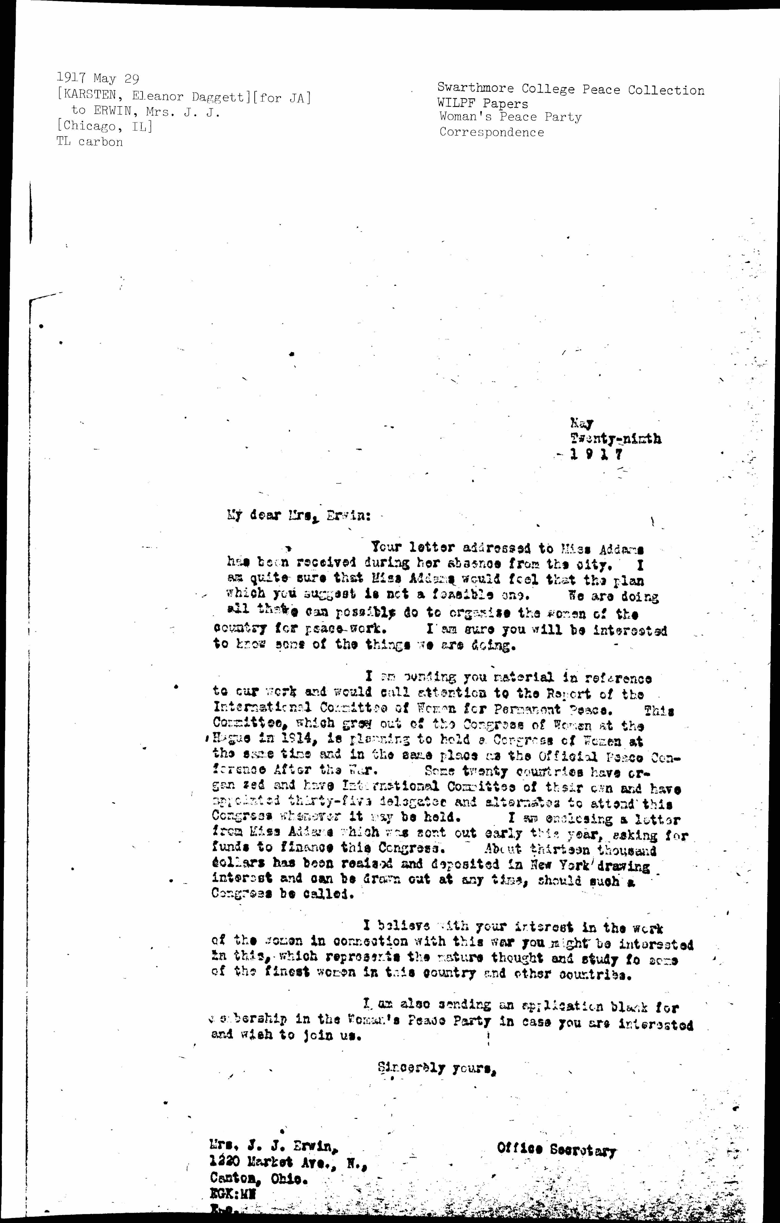 I am sending you material in reference to our work and would call attention to the Report of the International Committee of Women for Permanent Peace. This Committee, which grew out of the Congress of Women at The Hague in 1914, is planning to hold a Congress of Women at the same time and in the same place as the Official Peace Conference After the War. Some twenty countries have organized and have International [Committees] of their own and have appointed thirty-five delegates and alternates to attend this Congress whenever it may be held. I am enclosing a letter from Miss Addams which was sent out early this year, asking for funds to finance this Congress. About thirteen thousand dollars has been [raised] and deposited in New York drawing interest and can be drawn out at any time, should such a Congress be called.