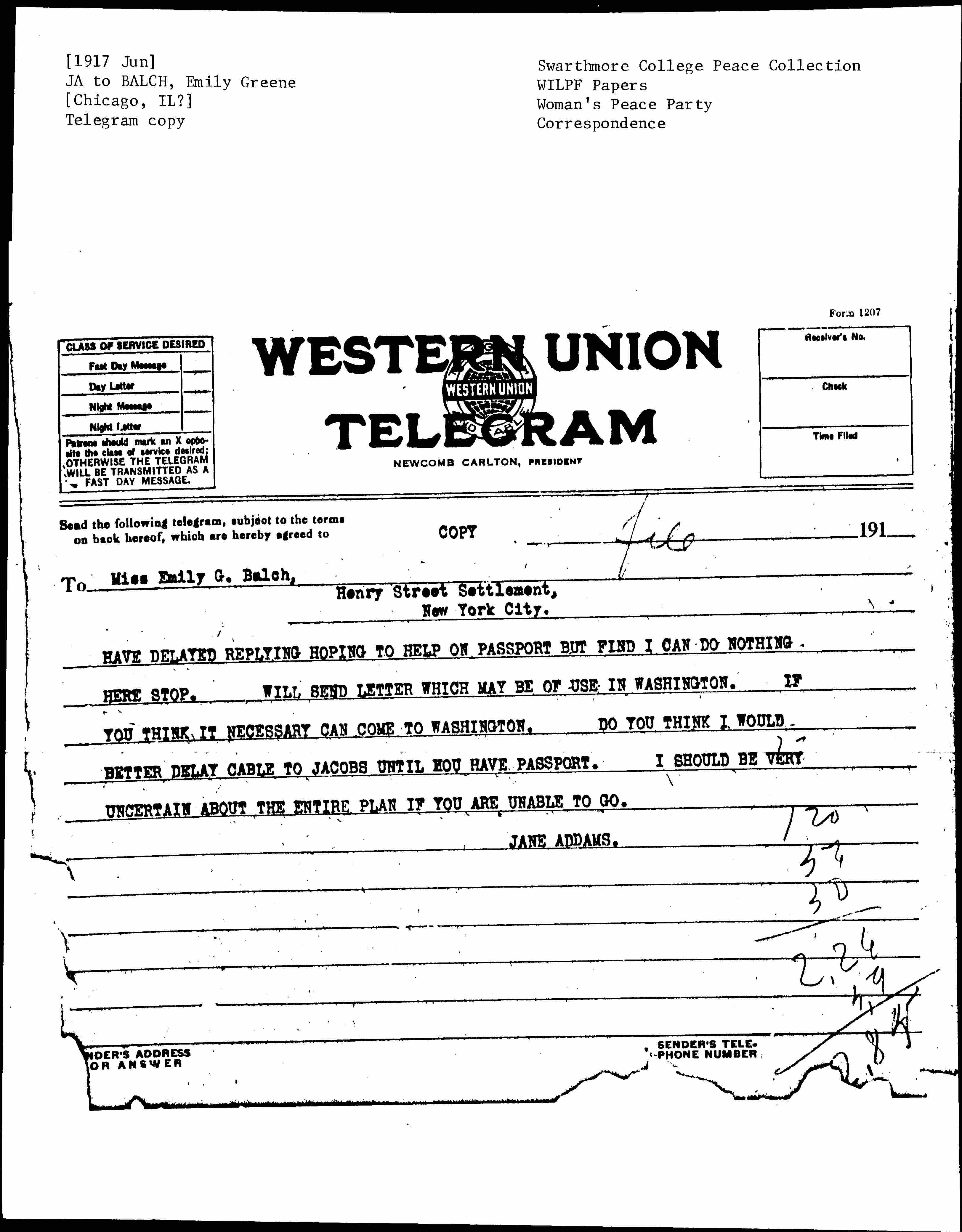 HAVE DELAYED REPLYING HOPING TO HELP ON PASSPORT BUT FIND I CAN DO NOTHING HERE. WILL SEND LETTER WHICH MAY BE OF USE IN WASHINGTON. IF YOU THINK IT NECESSARY CAN COME TO WASHINGTON. DO YOU THINK I WOULD BETTER DELAY CABLE TO JACOBS UNTIL YOU HAVE PASSPORT. I SHOULD BE VERY UNCERTAIN ABOUT THE ENTIRE PLAN IF YOU ARE UNABLE TO GO.
