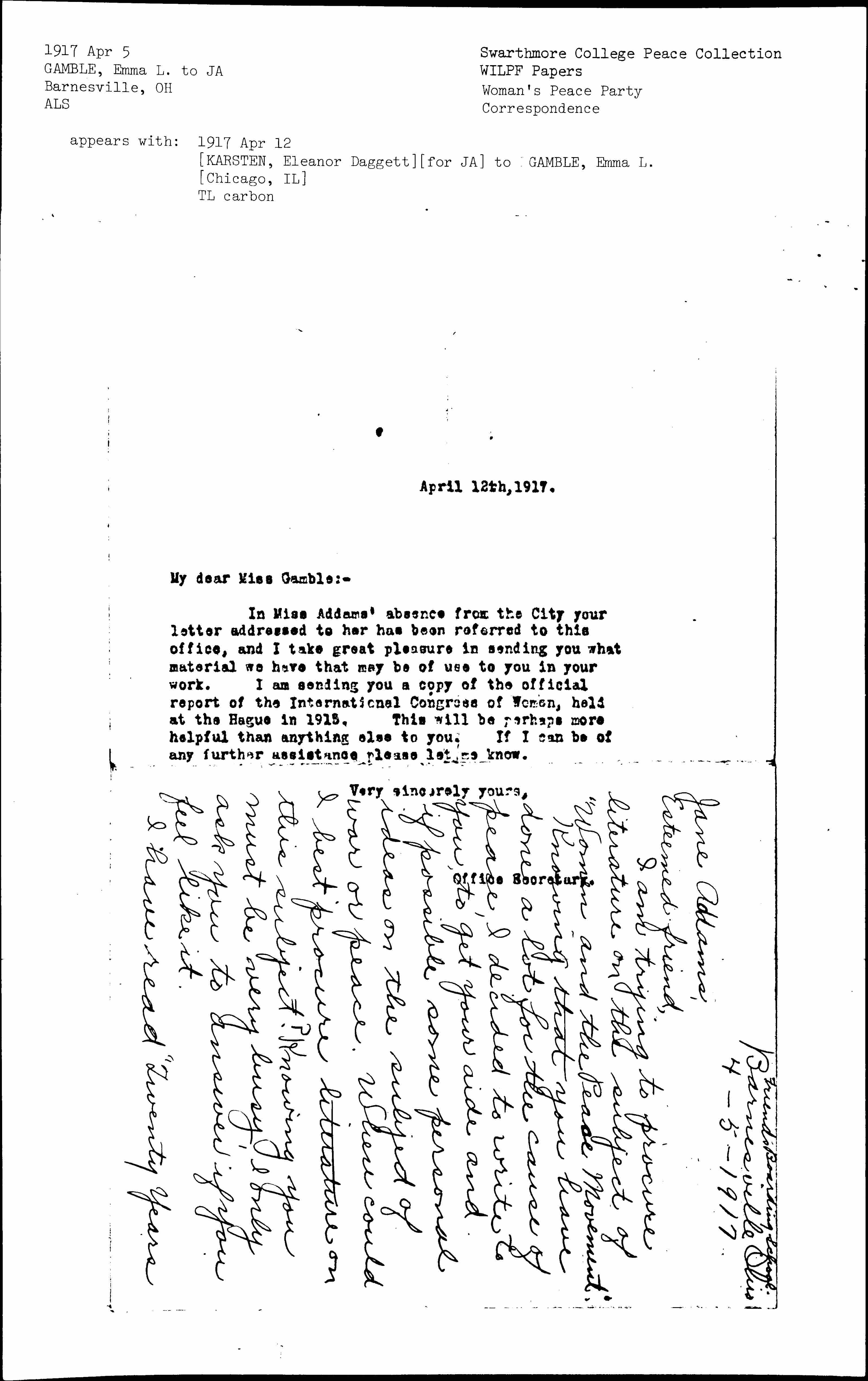 In Miss Addams' absence from the City your letter addressed to her has been referred to this office, and I take great pleasure in sending you what material we have that may be of use to you in your work. I am sending you a copy of the official report of the International Congress of Women, held at The Hague in 1915. This will be perhaps more helpful than anything else to you. If I can be of any further assistance please let me know.
