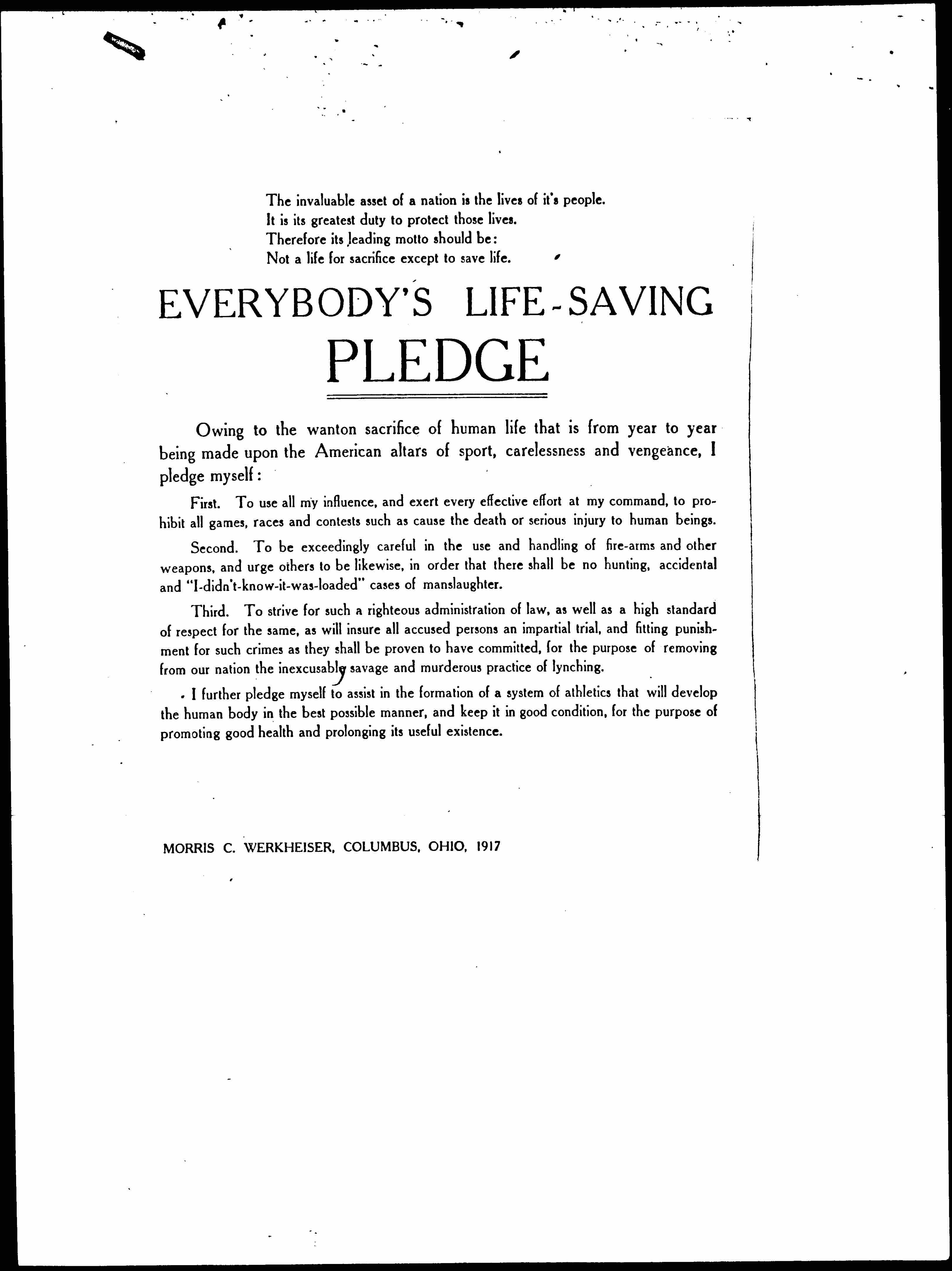 Owing to the wanton sacrifice of human life that is from year to year being made upon the American altars of sport, carelessness and vengeance, I pledge myself: