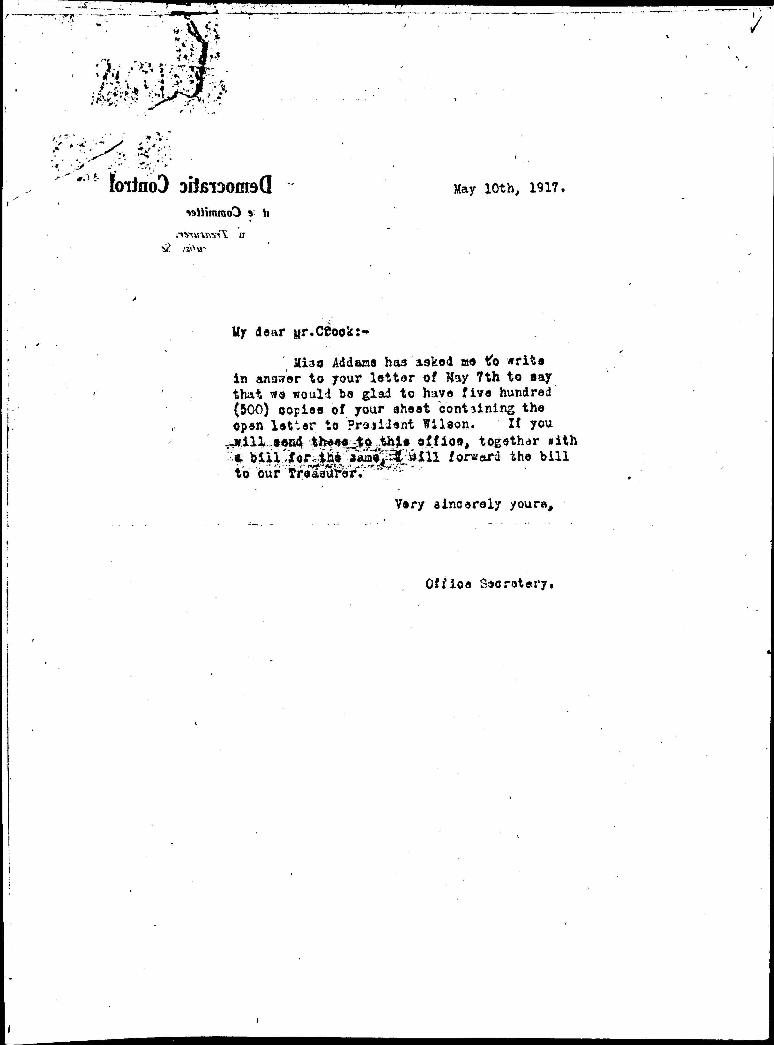 Miss Addams has asked me to write in answer to your letter of May 7th to say that we would be glad to have five hundred (500) copies of your sheet containing the open letter to President Wilson. If you will send these to this office, together with a bill for the same, I will forward the bill to our Treasurer.