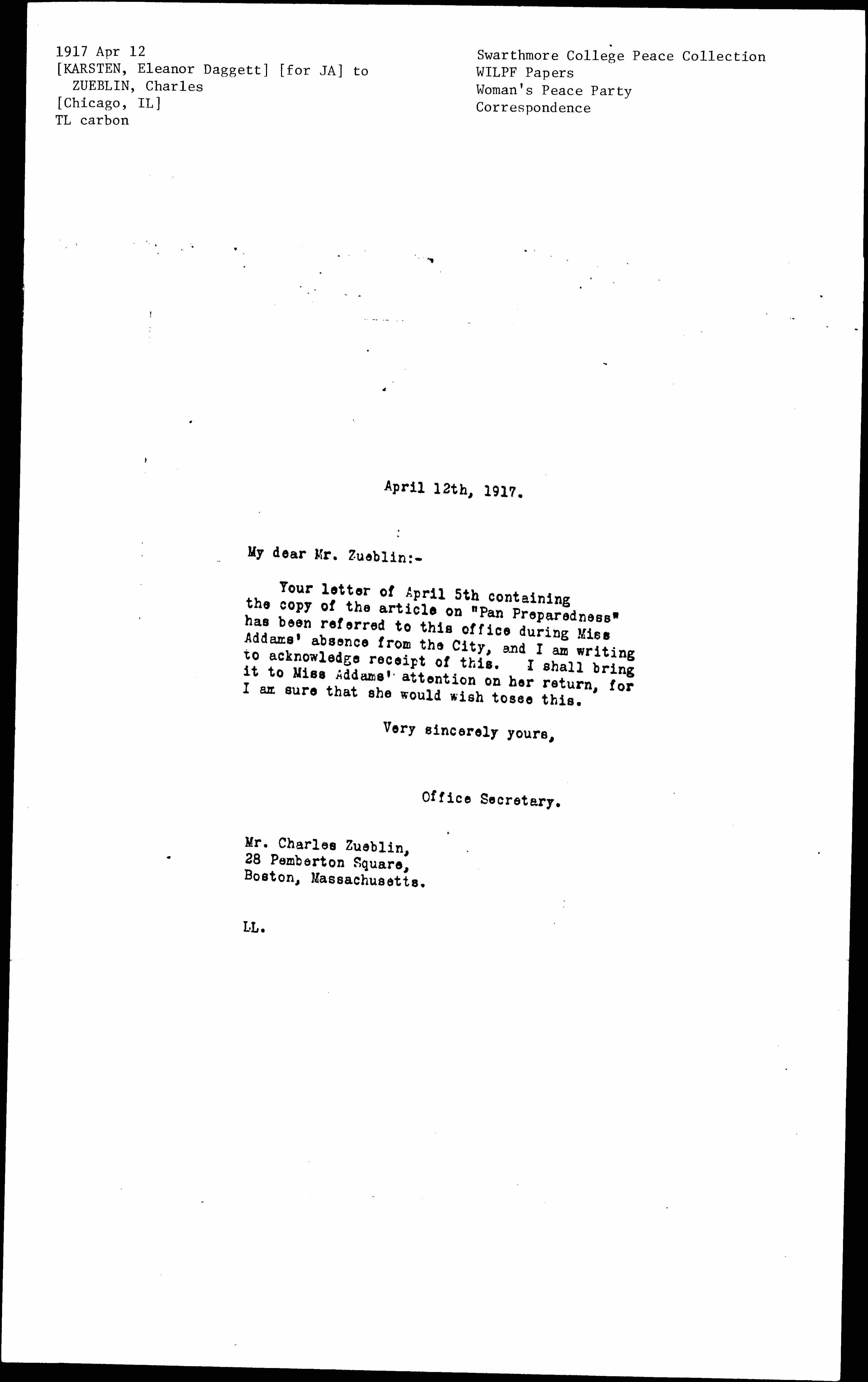 Your letter of April 5th containing the copy of the article on "Pan Preparedness" has been referred to this office during Miss Addams' absence from the City, and I am writing to acknowledge receipt of this. I shall bring it to Miss Addams' attention on her return, for I am sure that she would wish to see this.