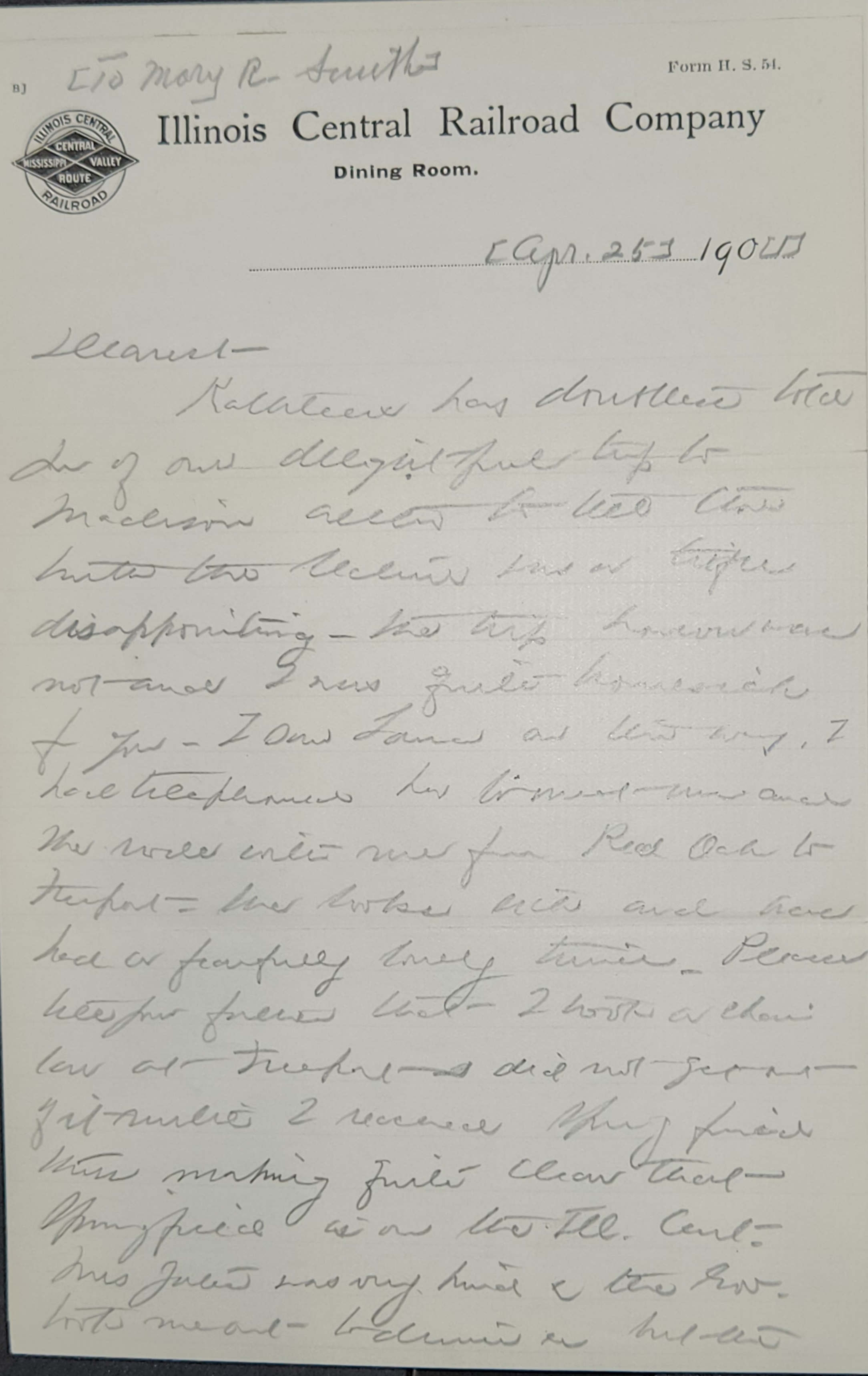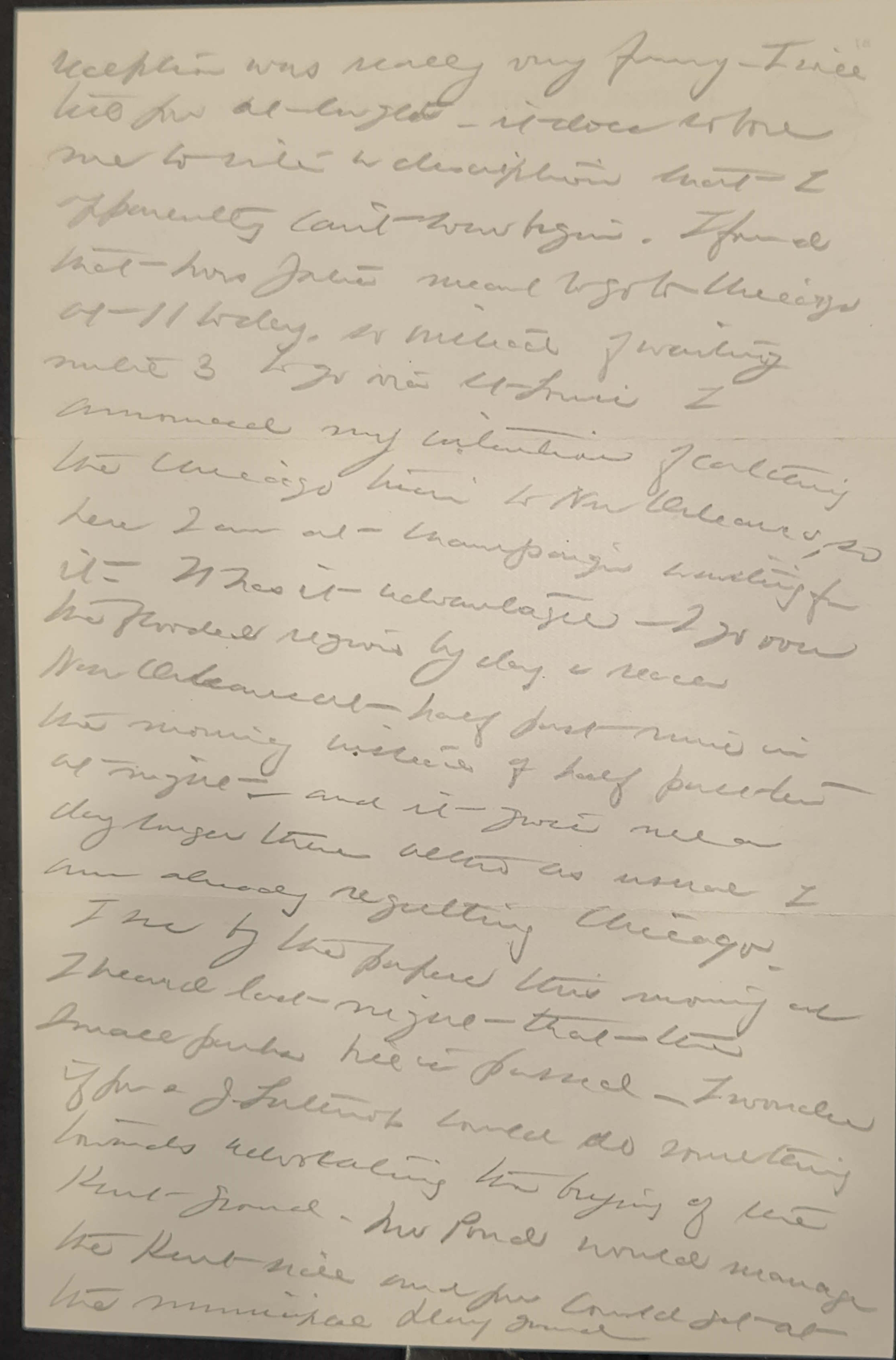 Kathleen has doubtless told you of our delightful trip to Madison [although] to tell the truth the lecture was a trifle disappointing -- the trip however was not and I was quite homesick for you. I saw Laura on the way. I had telephoned her to meet me and she rode with me from Red Oak to Freeport. She looks sick and [has] had a fearfully lonely time. Please tell your father that I took a chair car at Freeport and did not get out of it until I reached Springfield thus making quite clear that Springfield is on the Ill. Cent. Mrs Yates was very kind & the Gov. took me out to dinner [etc] but the [page 2] reception was really very funny. I will tell you at length -- it does so bore me to write a description that I apparently can't even begin. I found that Mrs Yates meant to go to Chicago at 11 today, so instead of waiting until 3 to go via St Louis I announced my intention of catching the Chicago train to New Orleans, so here I am at Champaign waiting for it. It has [its] advantage -- I go over the flooded regions by day & reach New Orleans at half past nine in the morning instead of half past ten at night --and it gives me a day longer there [although] as usual I am already regretting Chicago.