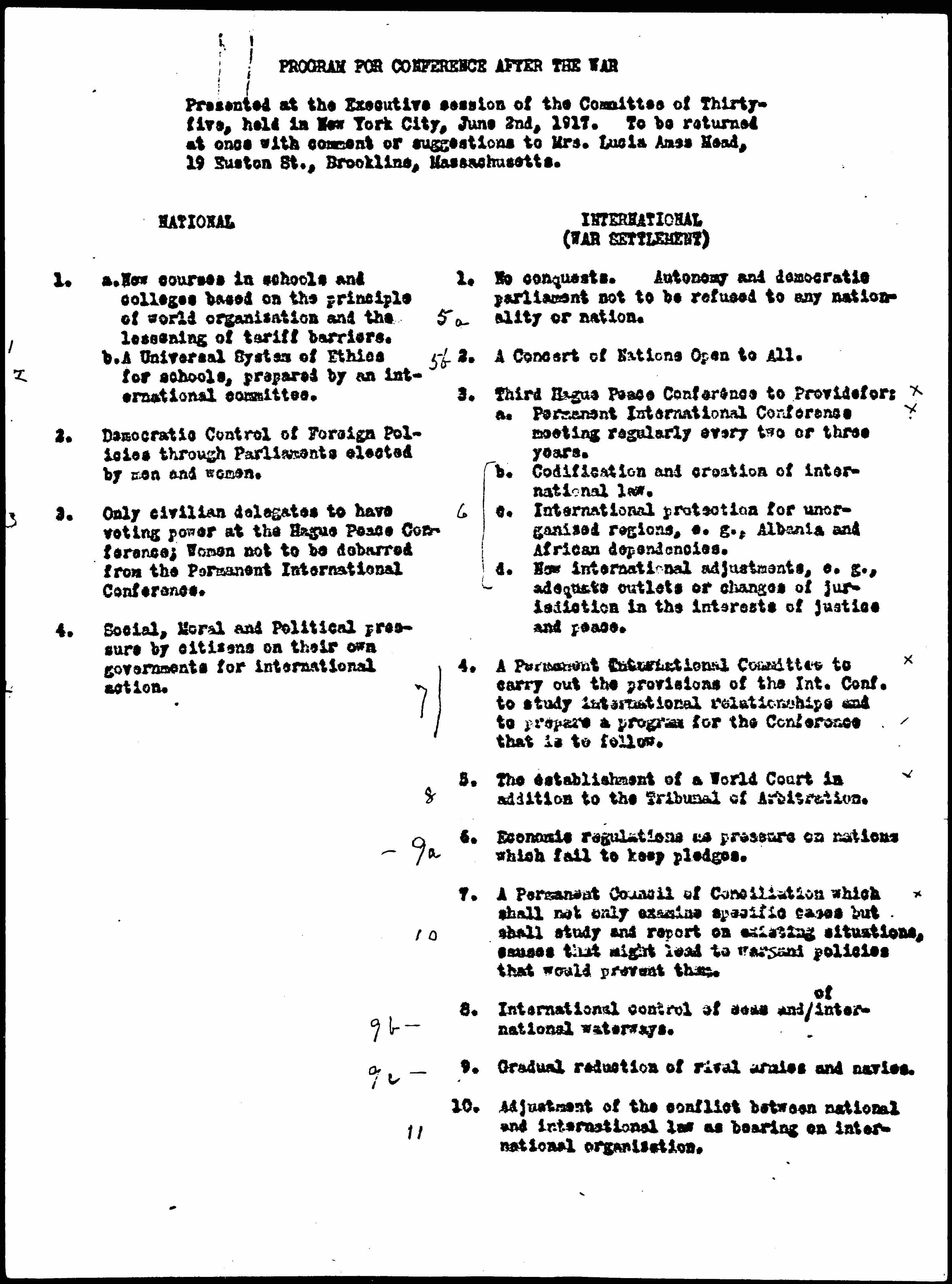 Presented at the Executive session of the Committee of Thirty-five, held in New York City, June 2nd, 1917. To be returned at once with comment or suggestions to Mrs. Lucia Ames Mead, 19 Euston St., Brookline, Massachusetts.