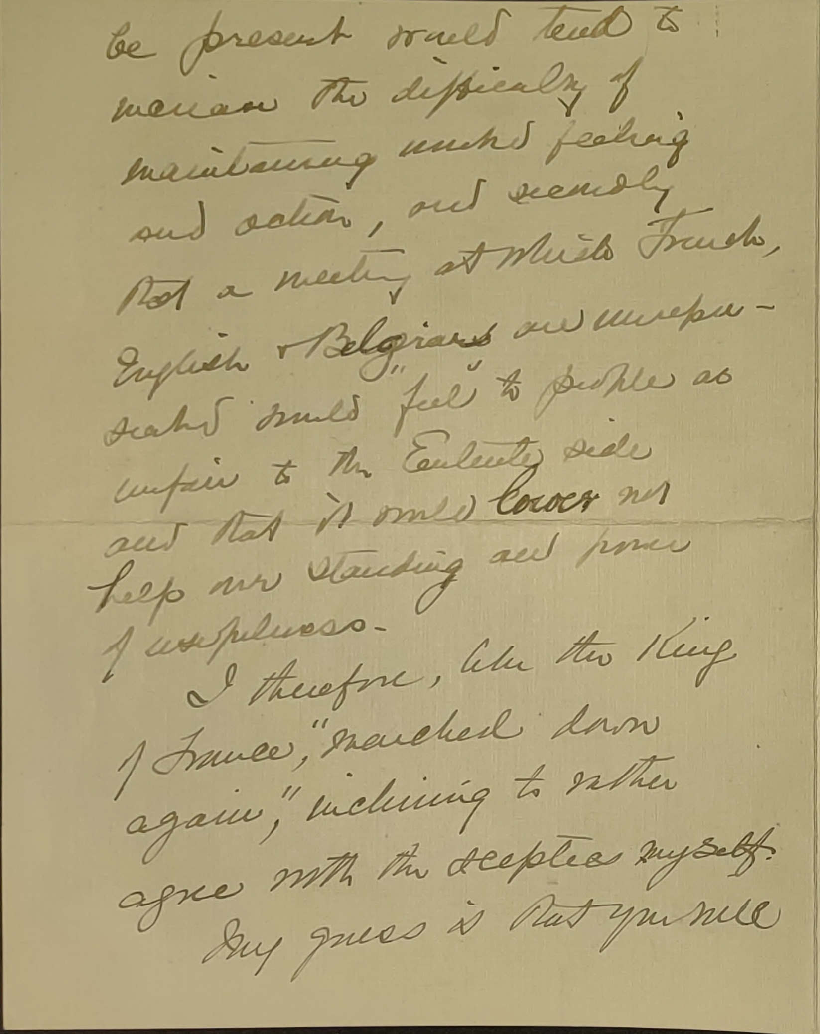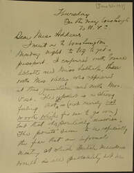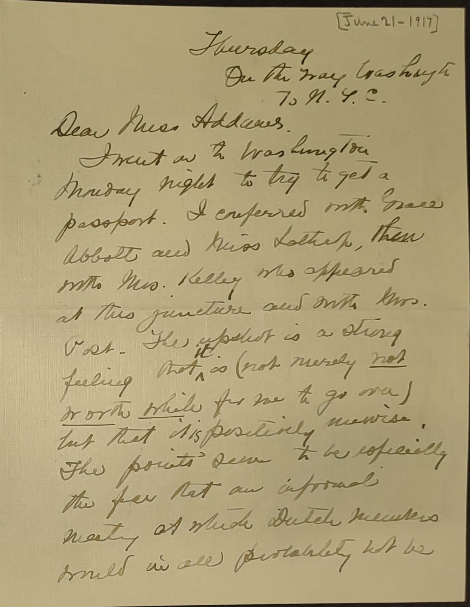 I went on to Washington Monday night to try to get a passport. I conferred with Grace Abbott and Miss Lathrop, then with Mrs. Kelley who appeared at this juncture and with Mrs. Post. The upshot is a strong feeling that ↑it↓ is (not merely not worth while for me to go over) but that it is positively unwise. The points seem to be especially the fear that an informal meeting at which Dutch members would in all probability not be [page 2] present would tend to increase the difficulty of maintaining, [such a] feeling and action, and secondly that a meeting at which French, English & Belgians are unrepresented would "feel" to people as unfair to the Entente side and that it would lower not help our standing and [power?] of usefulness.