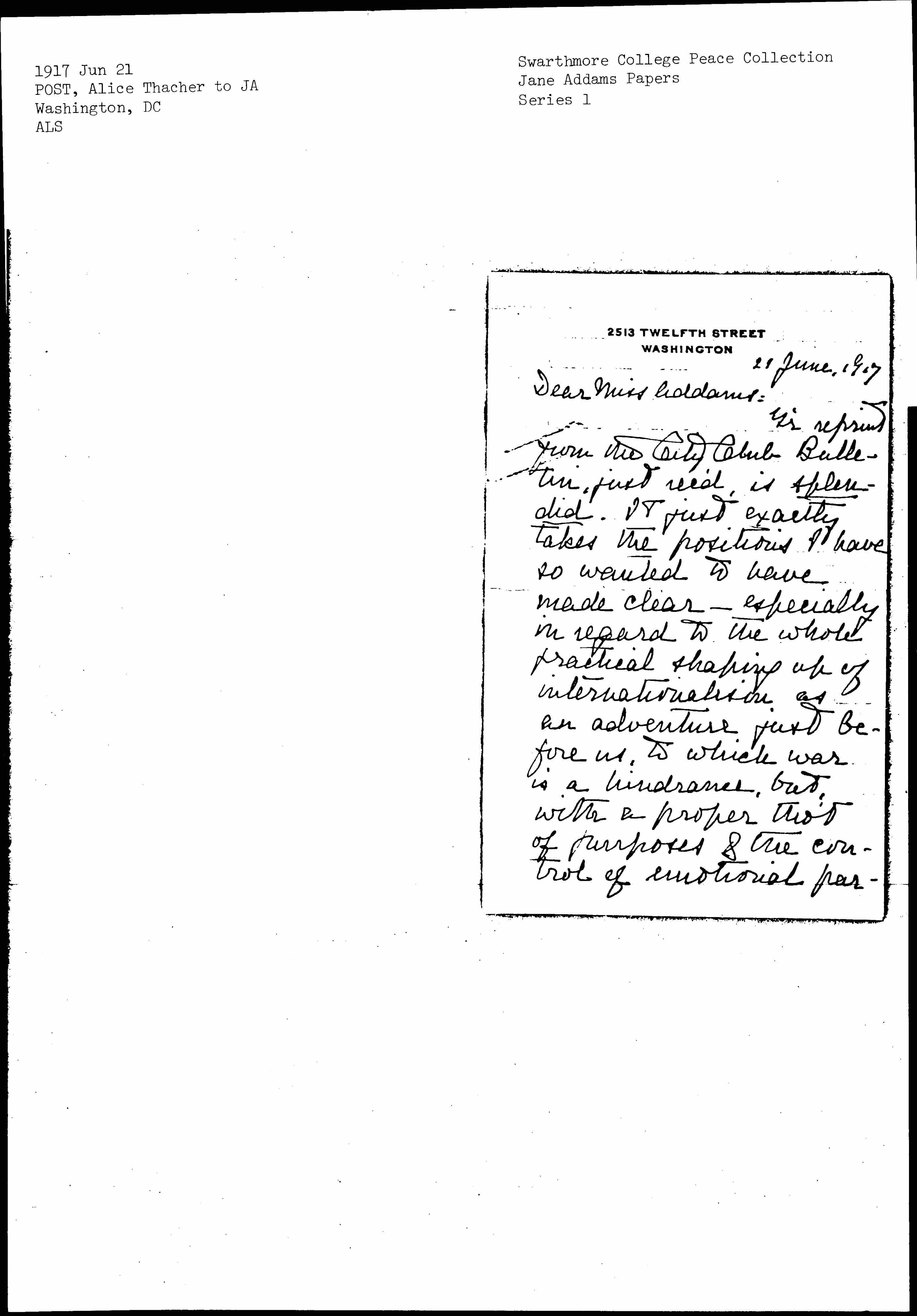 Y'r reprint from the City Club Bulletin, just rec'd, is splendid. It just exactly takes the positions I have so wanted to have made clear -- especially in regard to the whole practical shaping up of internationalism as an adventure just before us, to which war is a hindrance, but with a proper [thought] of purposes & the control of emotional partisanship, [page 2] not an insuperable hindrance.