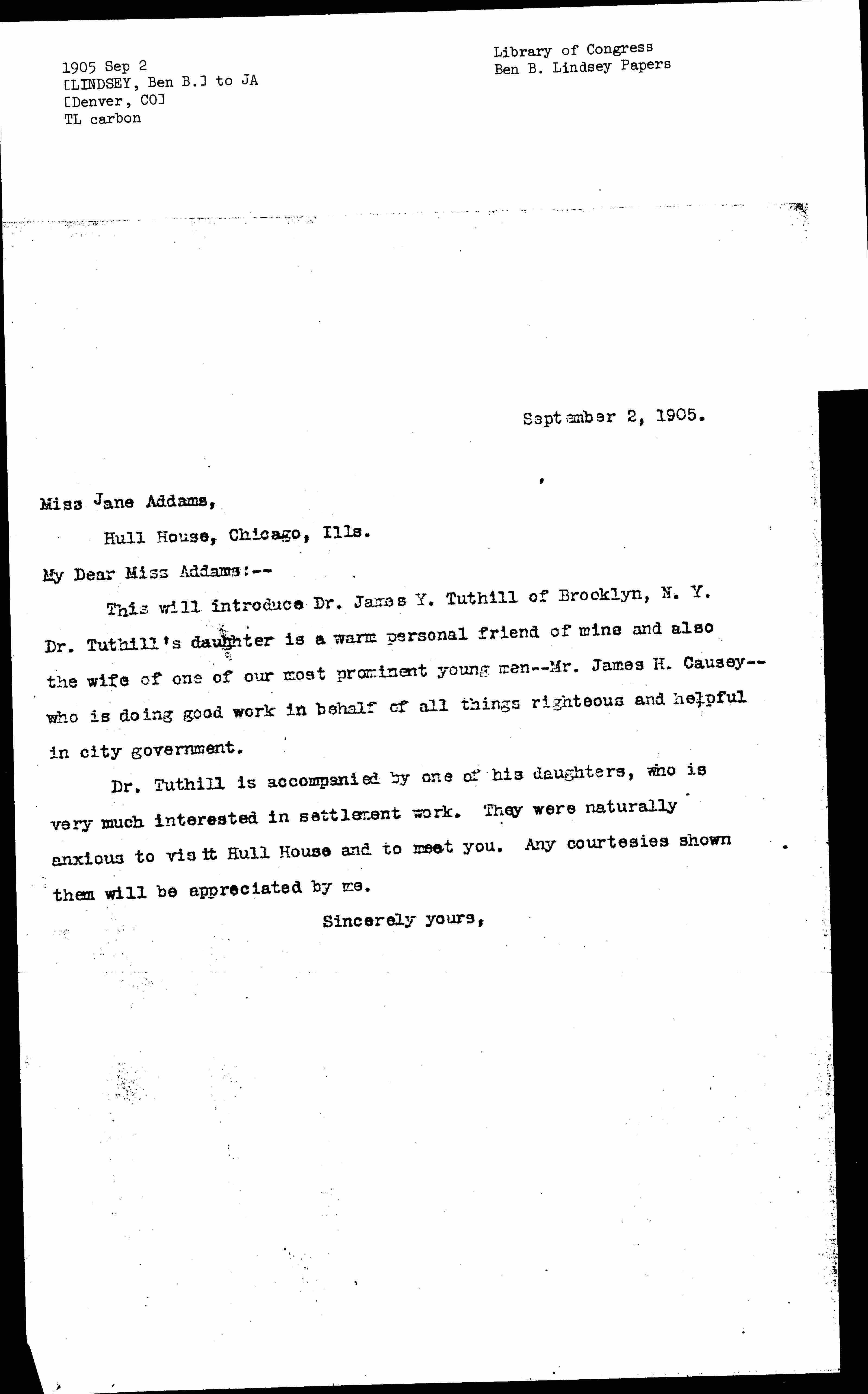 Dr. Tuthill is accompanied by one of the daughters, who is very much interested in settlement work. They were naturally anxious to visit Hull House and to meet you. Any courtesies shown them will be appreciated by me.