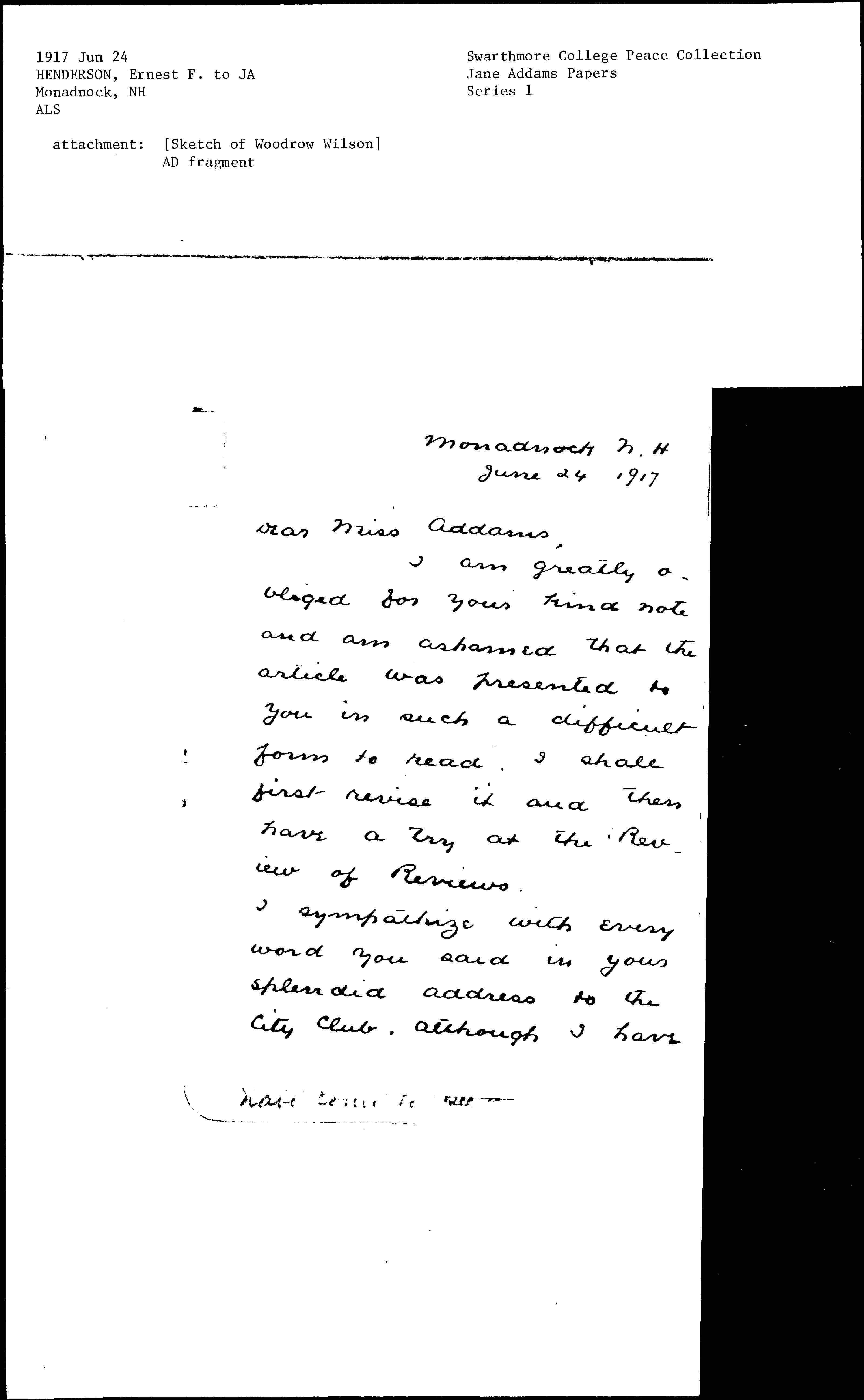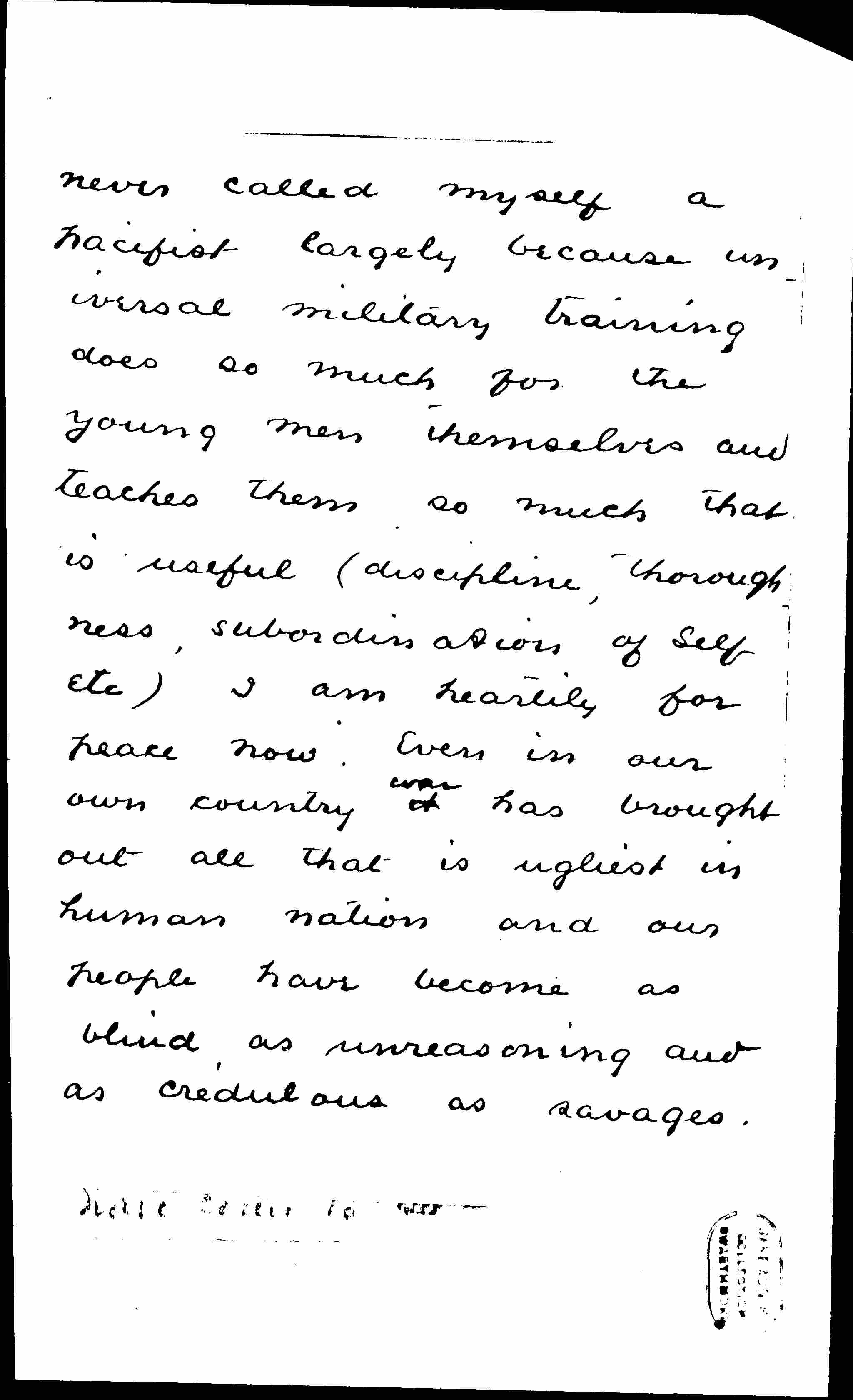 I sympathize with every word you said in your splendid address to the city club, although I have [page 2] never called myself a pacifist largely because universal military training does so much for the young men themselves and teaches them so much that is useful (discipline, thoroughness, subordination of self etc) I am heartily for peace now. Even in our own country it <war> has brought out all that is ugliest in human nation and our people have become as blind, as unreasoning and as credulous as savages. [page 3]