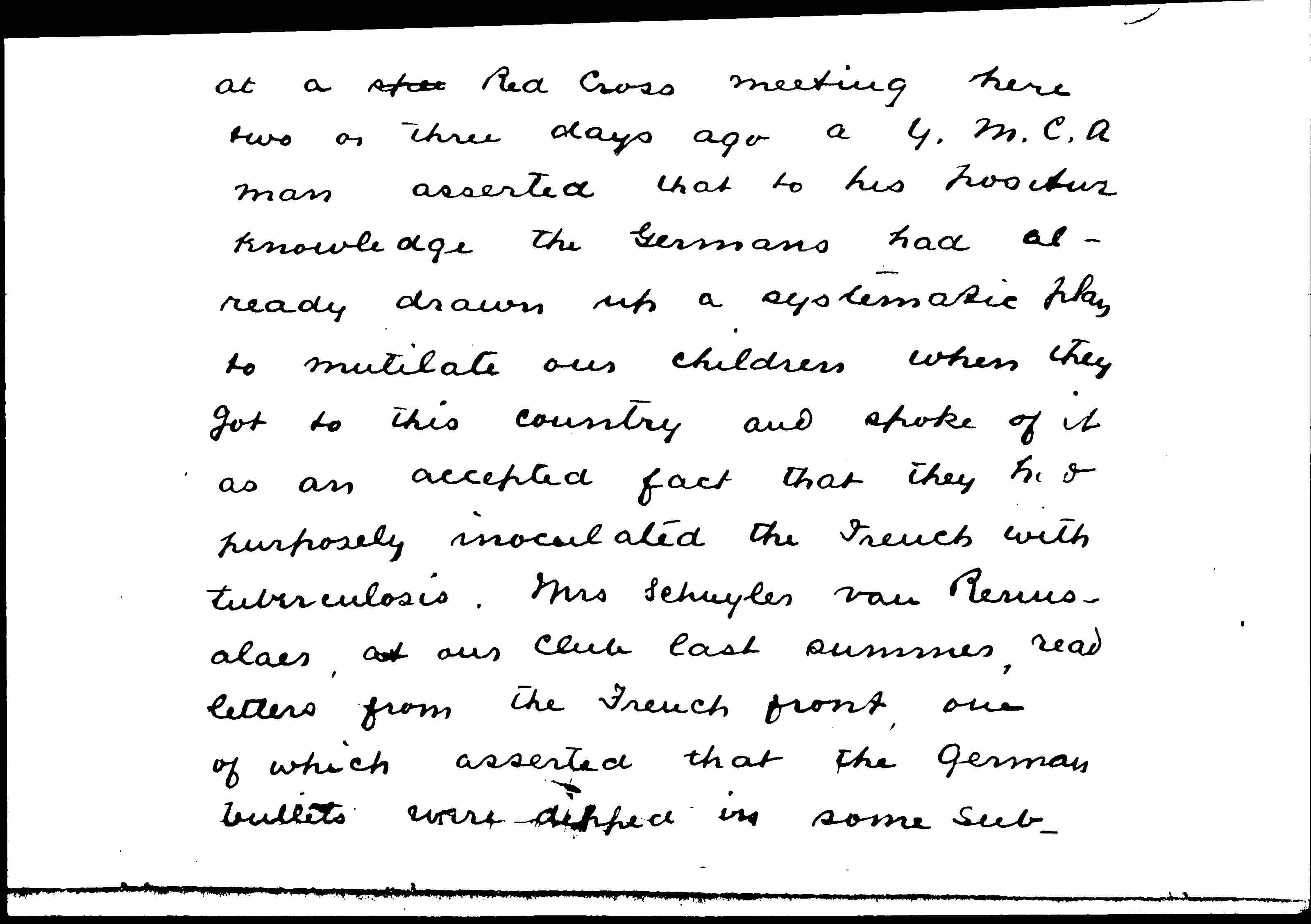 At a spee Red Cross meeting here two or three days ago a Y.M.C.A man asserted that to his positive knowledge the Germans had already drawn up a systematic plan to mutilate our children when they got to this country and spoke of it as an accepted fact that they had purposely inoculated the French with tuberculosis. Mrs. Schuyler van [Rensselaer], at our club last summer, read letters from the French front, one of which asserted that the German bullets were dipped in some substance [page 4] that induced the quick formation and spread of gangrene, and our educated people never wince at such statements.