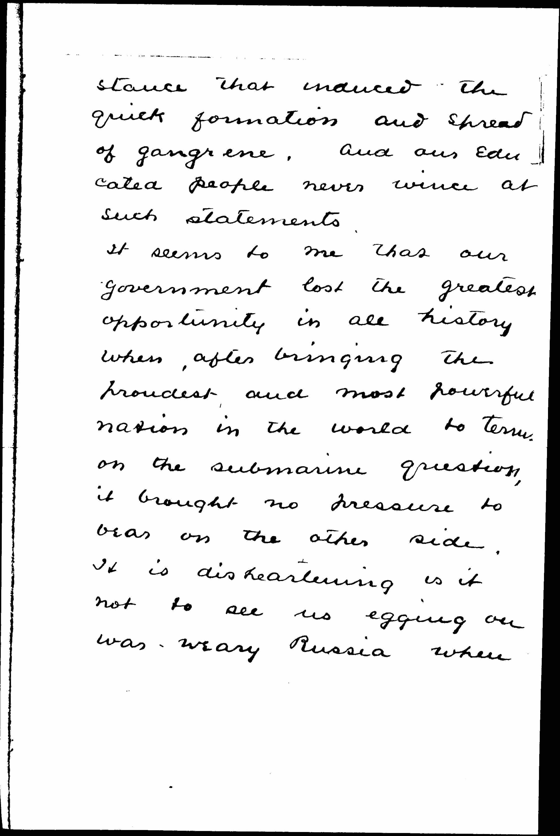 It seems to me that our government lost the greatest opportunity in all history when, after bringing the proudest and most powerful nation in the world to [terms] on the submarine question, it brought no pressure to bear on the other side. It is disheartening is it not to see us egging on war-weary Russia when [page 5] the terms are the very ones we ourselves have been advocating.