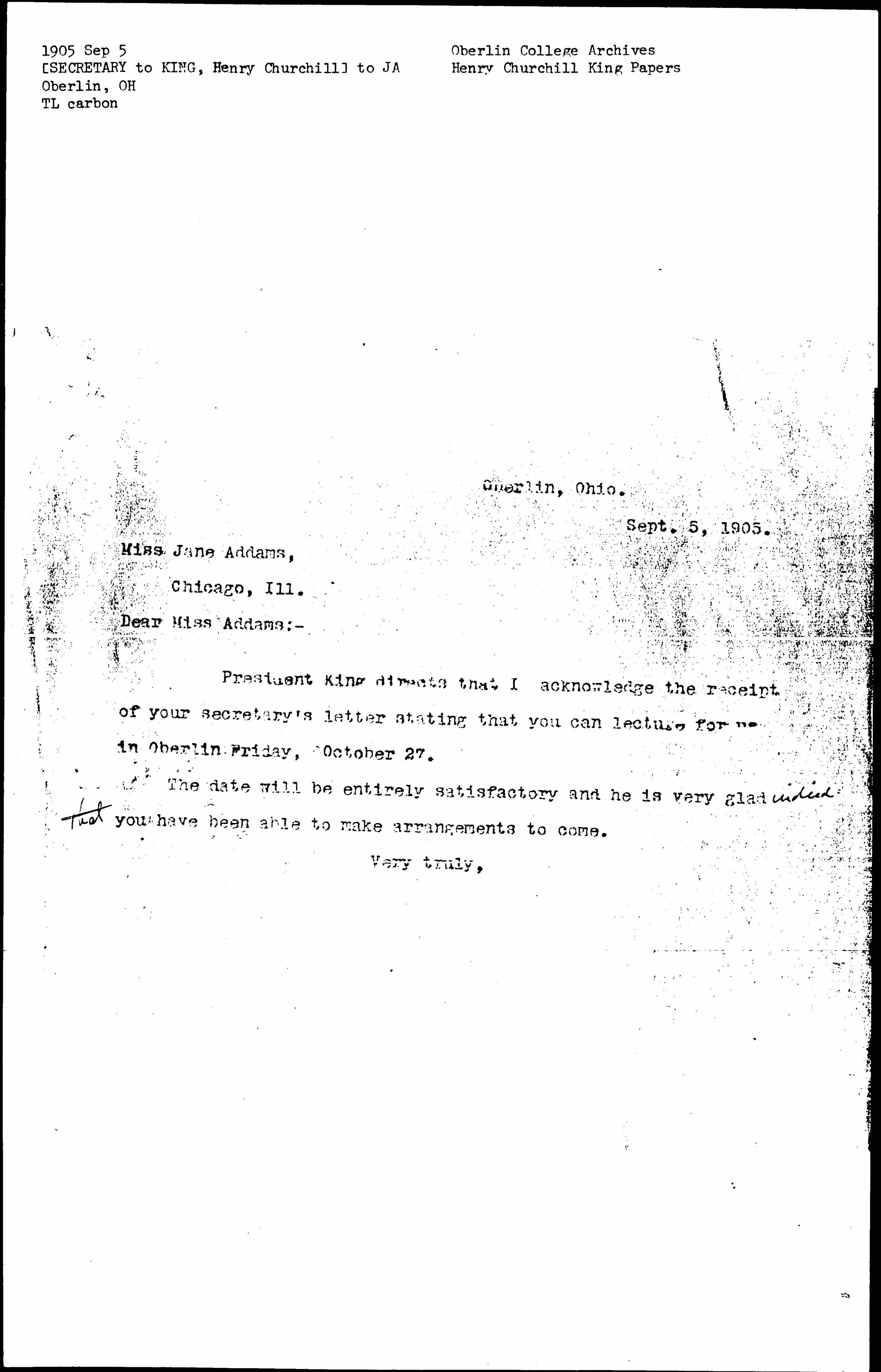 President King directs that I acknowledge the receipt of your secretary's letter stating that you can lecture for [us] in Oberlin Friday, October 27.