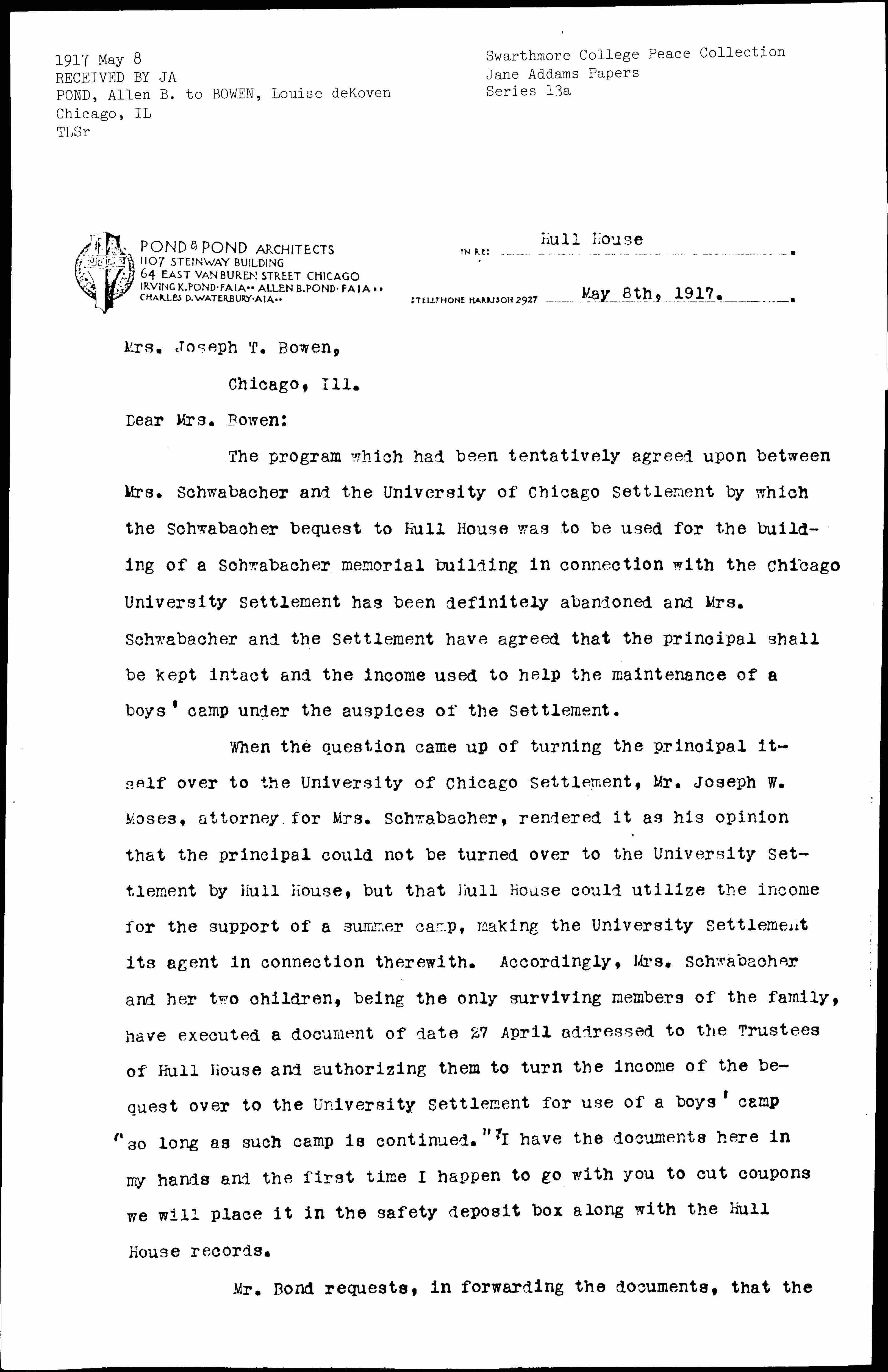 When the question came up of turning the principal itself over to the University of Chicago Settlement, Mr. Joseph W. Moses, attorney for Mrs. Schwabacher, rendered it as his opinion that the principal could not be turned over to the University Settlement by Hull House, but that Hull House could utilize the income for the support of a summer camp, making the University Settlement its agent in connection therewith. Accordingly, Mrs. Schwabacher and her two children, being the only surviving members of the family, have executed a document of date 27 April addressed to the Trustees of Hull House and authorizing them to turn the income of the bequest over to the University Settlement for use of a boys' camp "so long as such camp is continued." I have the documents here in my hands and the first time I happen to go with you to cut coupons we will place it in the safety deposit box along with the Hull House records.