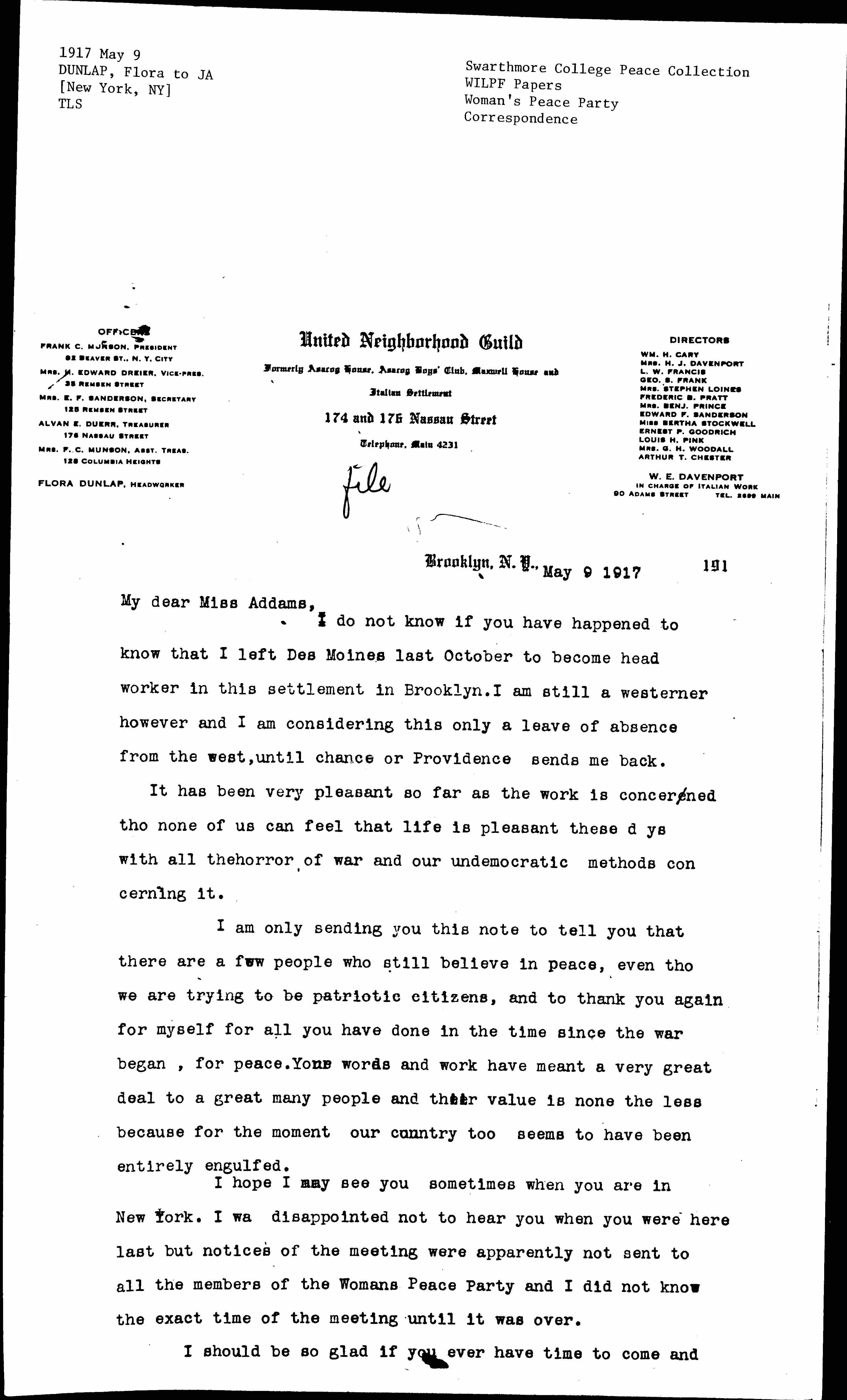I do not know if you have happened to know that I left Des Moines last October to become head worker in this settlement in Brooklyn. I am still a Westerner however and I am considering this only a leave of absence from the west, until chance or Providence sends me back.