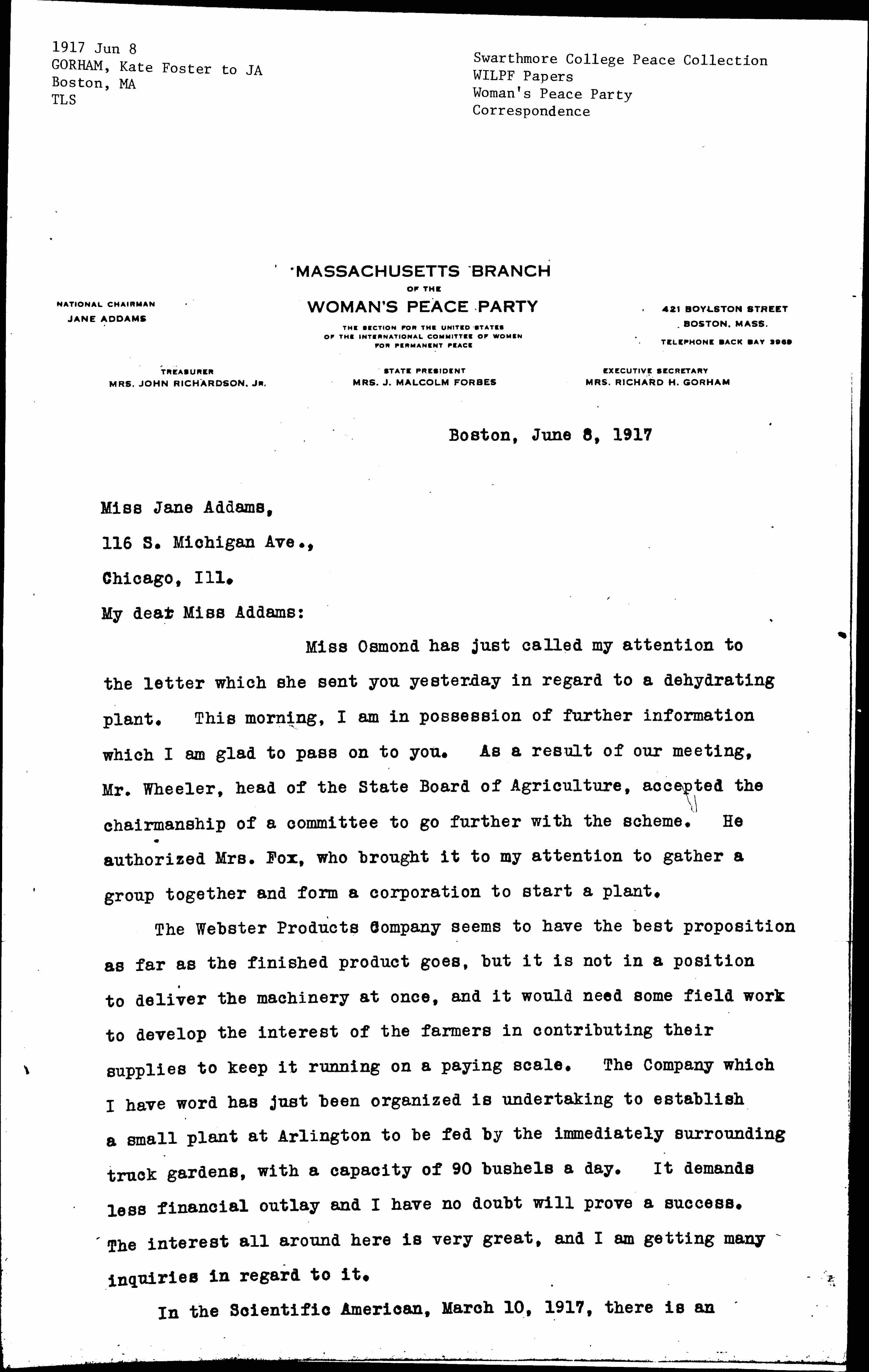 Miss Osmond has just called my attention to the letter which she sent you yesterday in regard to a dehydrating plant. This morning, I am in possession of further information which I am glad to pass on to you. As a result of our meeting, Mr. Wheeler, head of the State Board of Agriculture, accepted the chairmanship of a committee to go further with the scheme. He authorized Mrs. Fox, who brought it to my attention to gather a group together and form a cooperation to start a plant.