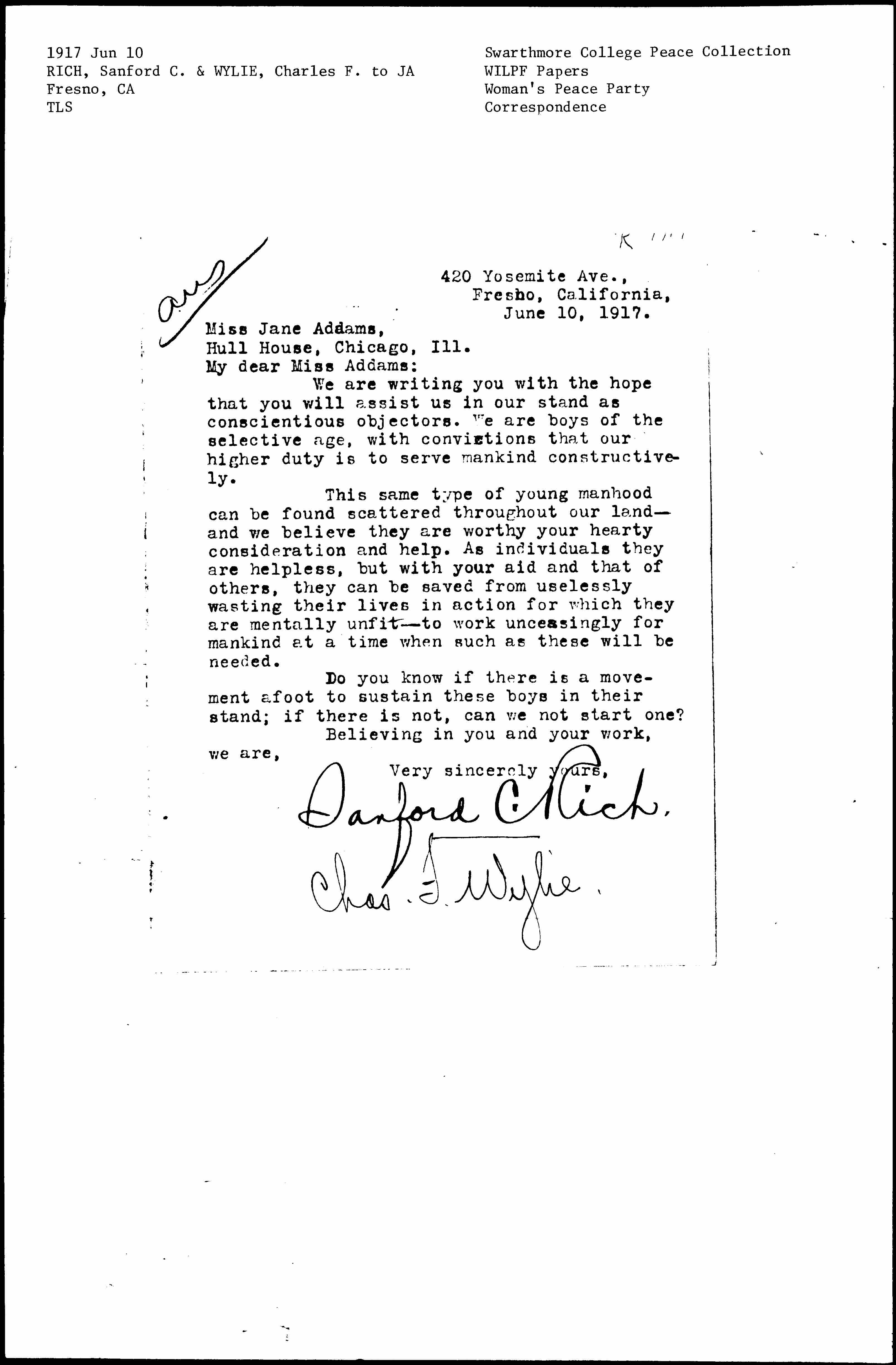 We are writing you with the hope that you will assist us in our stand as conscientious objectors. We are boys of the selective age, with convictions that our higher duty is to serve mankind constructively.