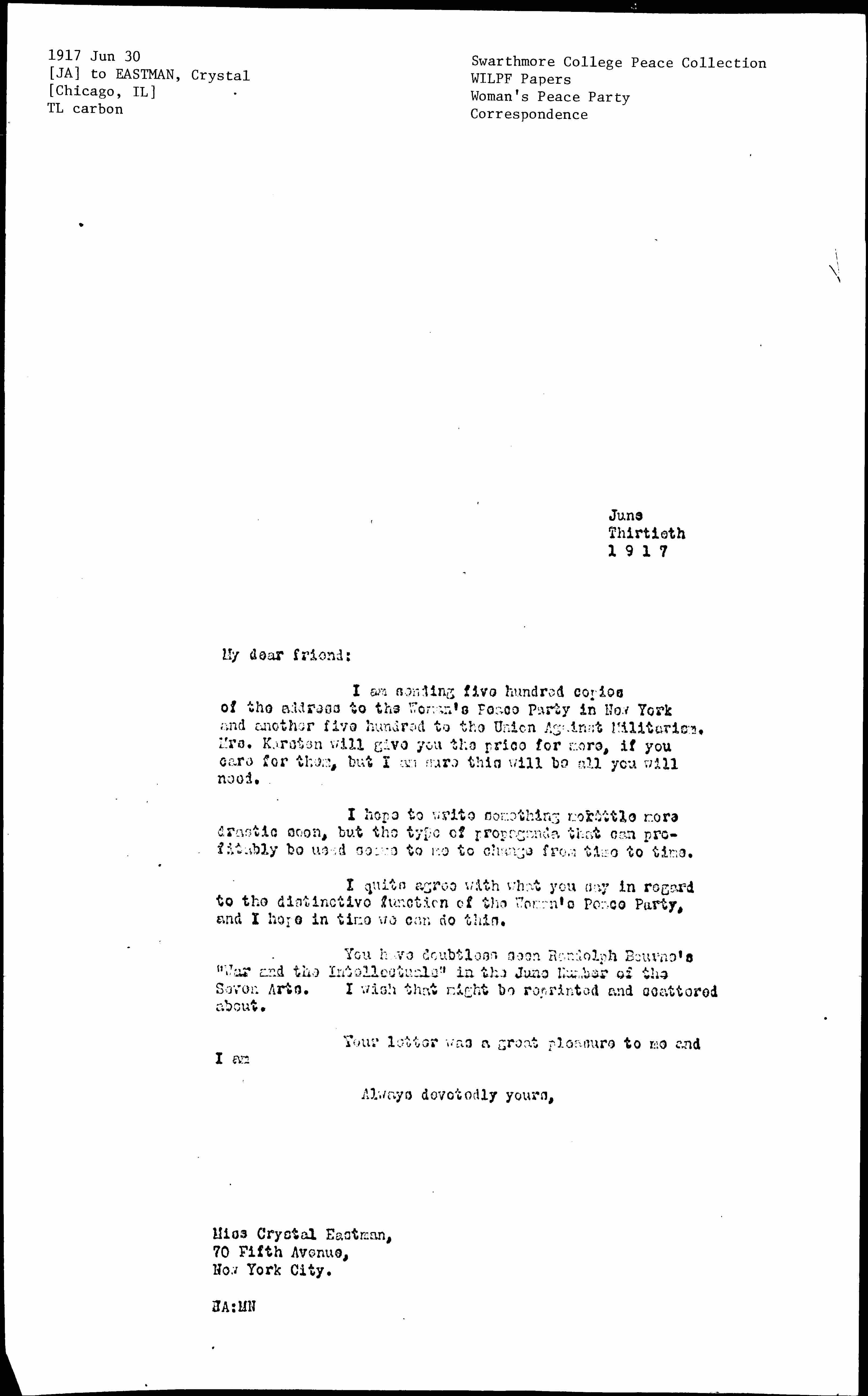 I am sending five hundred copies of the address to the Woman's Peace Party in New York and another five hundred to the Union against Militarism. Mrs. Karsten will give you the price for more, if you care for them, but I am sure this will be all you will need.