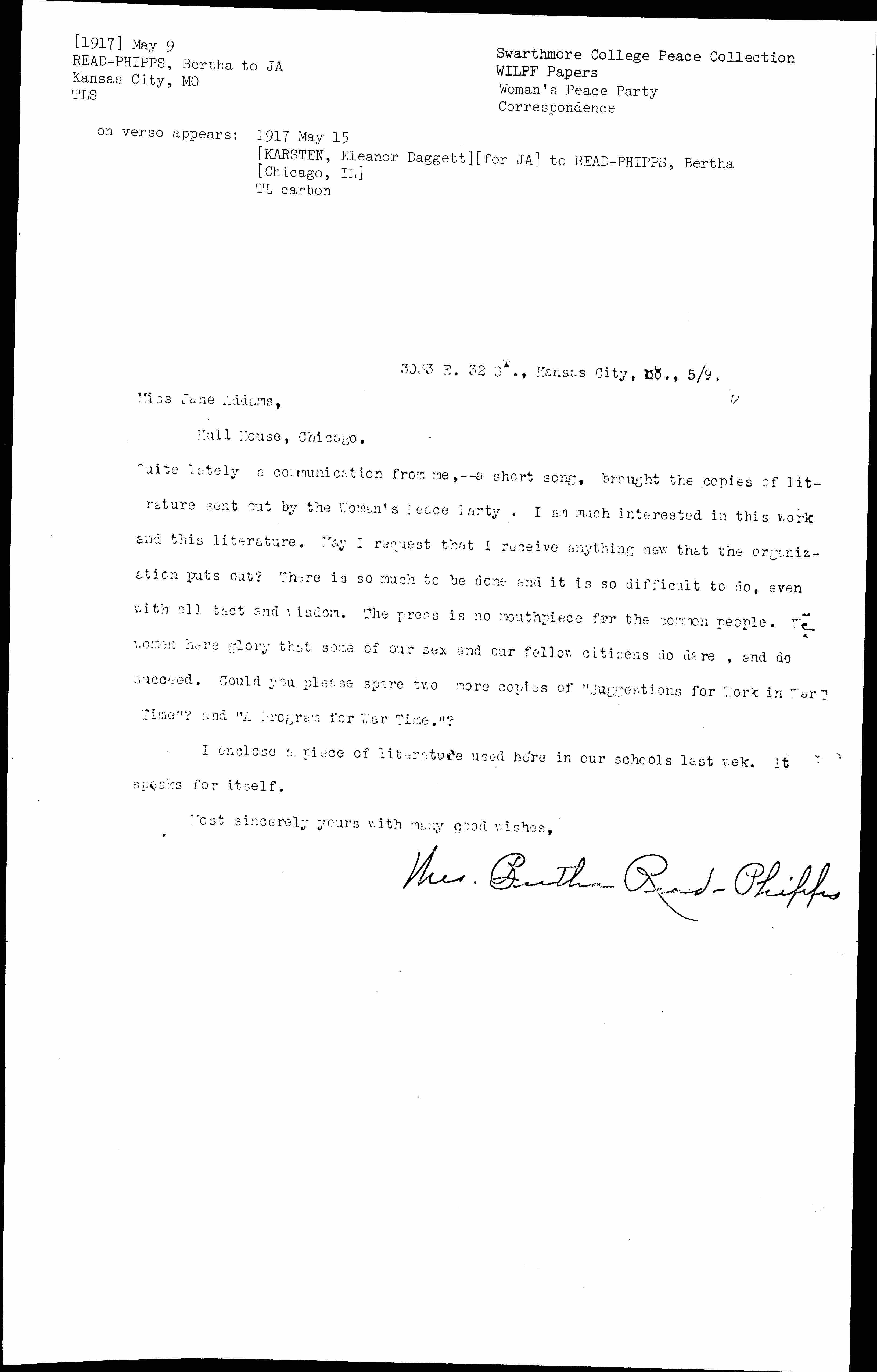 Quite lately a communication from me, -- a short song, brought the copies of literature sent out by the Woman's Peace Party. I am much interested in this work and this literature. May I request that I receive anything new that the organization puts out? There is so much to be done and it is so difficult to do, even with all tact and wisdom. The press is no mouthpiece for the common people. We women here glory that some of our sex and our fellow citizens do dare, and do succeed. Could you please spare two more copies of "Suggestions for Work in War Time"? and "A Program for War Time."?