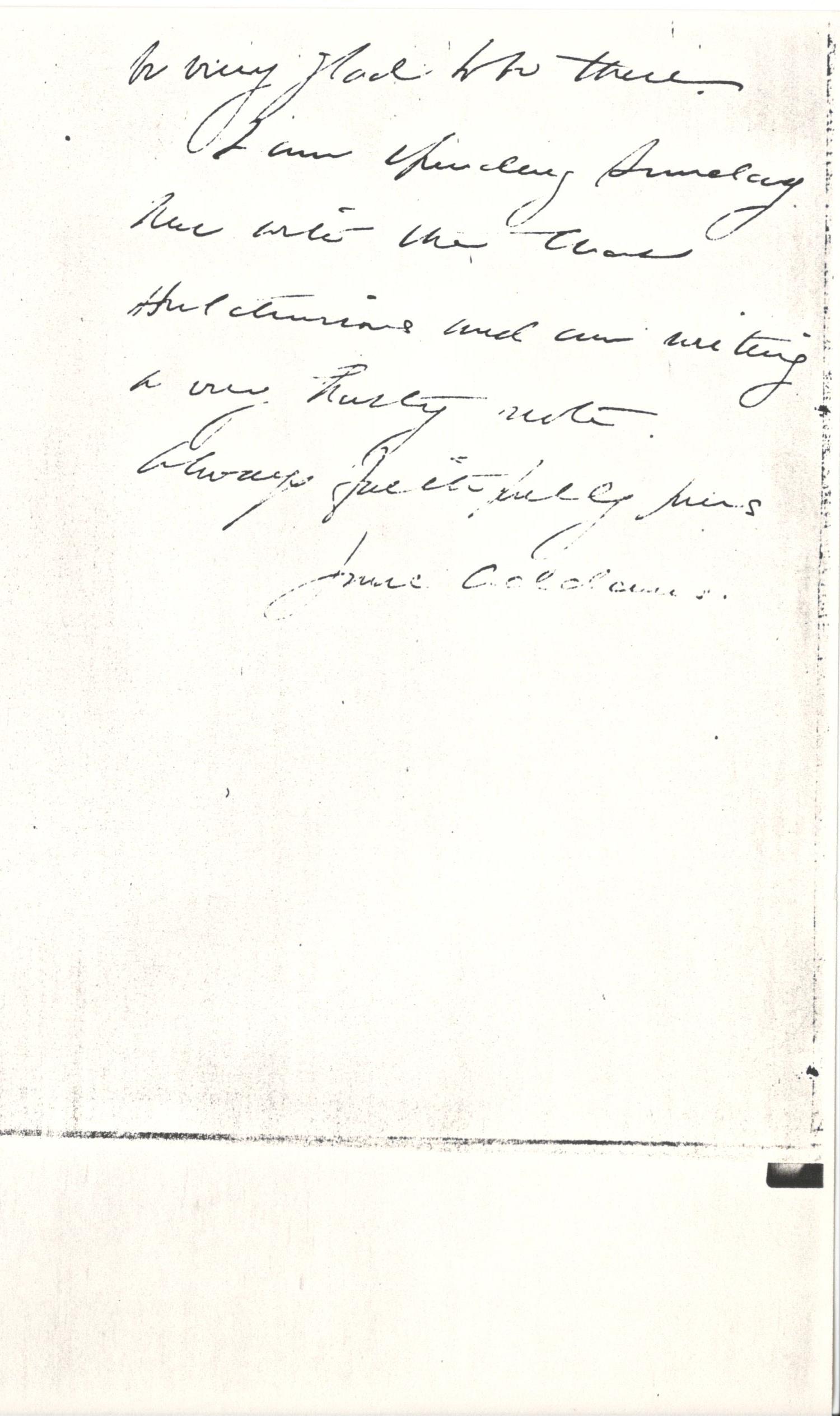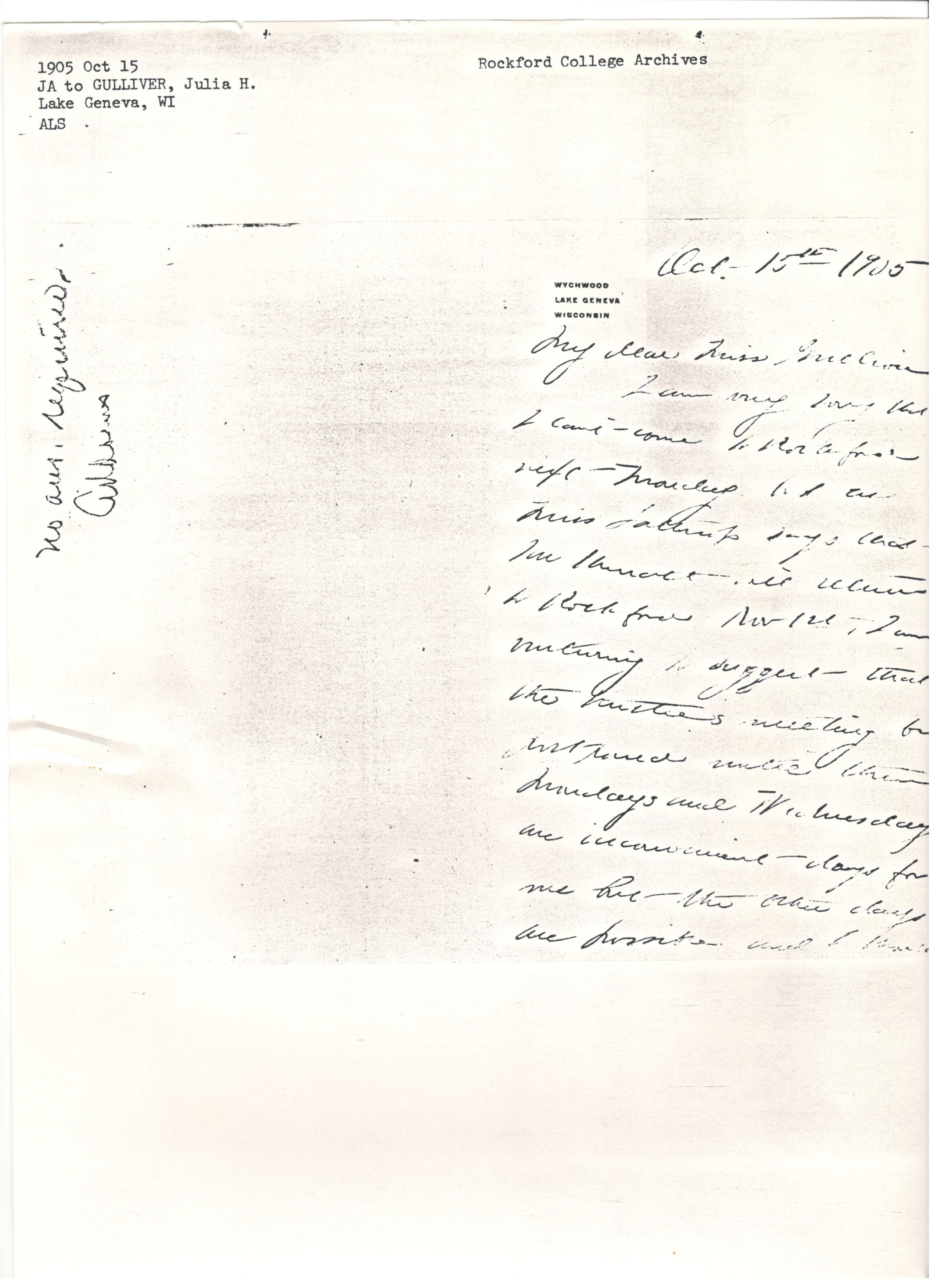 I am very sorry that I can't come to Rockford next Monday but as Miss Lathrop says that Mr [illegible] will return to Rockford Nov 1st, I am venturing [to] suggest that the trustees meeting be postponed until then. Mondays and Wednesdays are inconvenient days for me but the other days are possible and I [should?] [page 2] be very glad to be there.