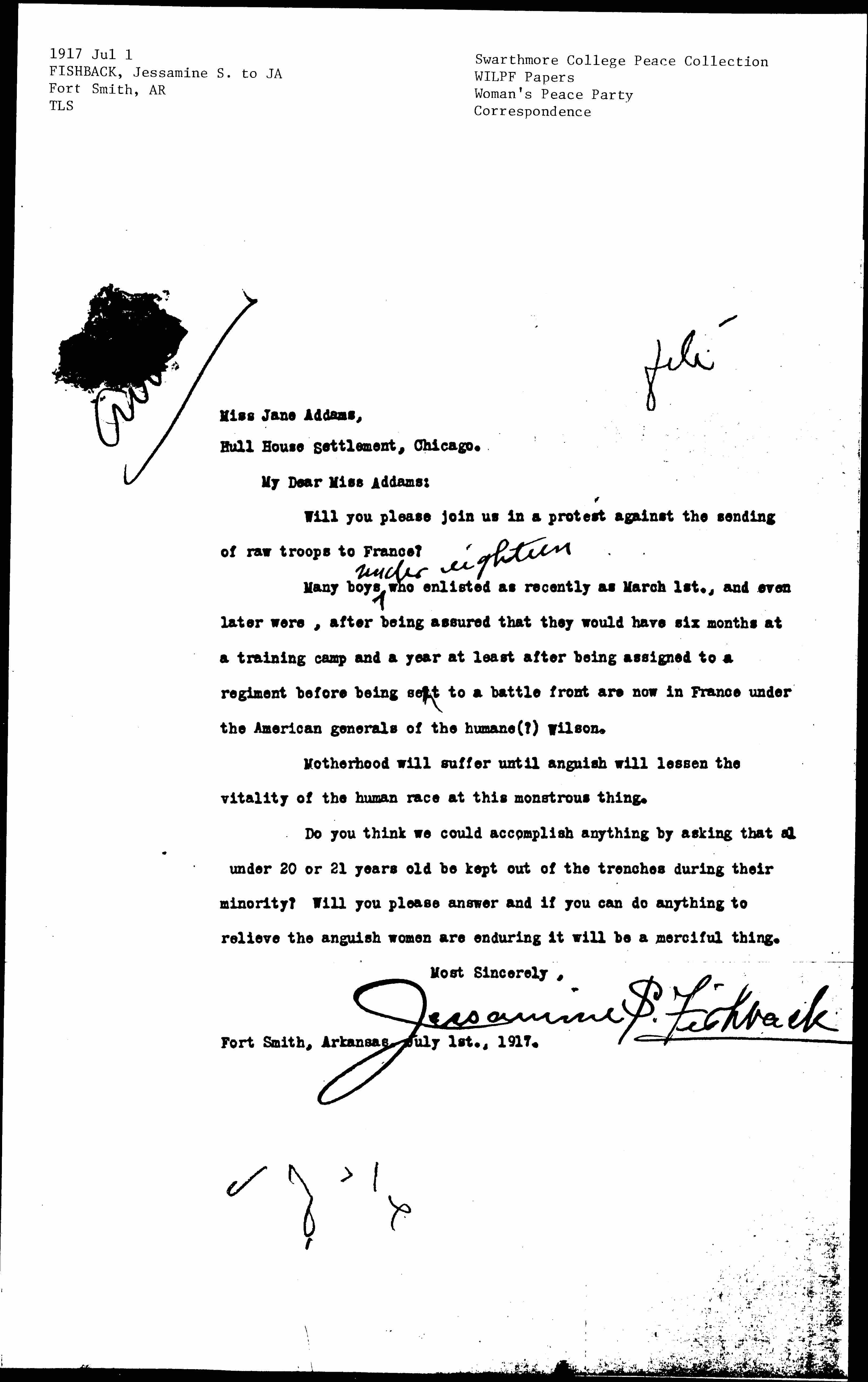 Do you think we could accomplish anything by asking that [all] under 20 or 21 years old be kept out of the trenches during their minority? Will you please answer and if you can do anything to relieve the anguish women are enduring it will be a merciful thing.