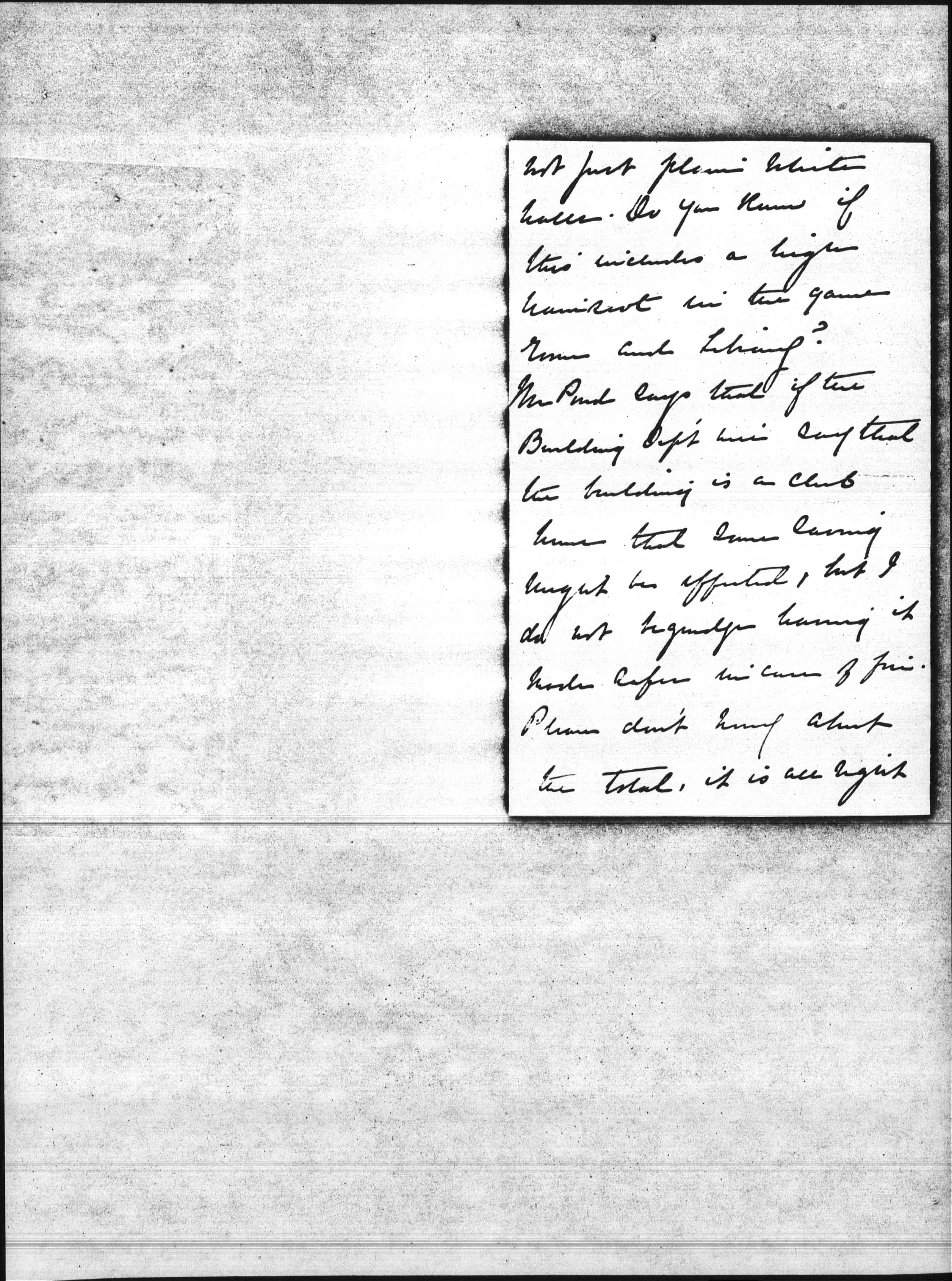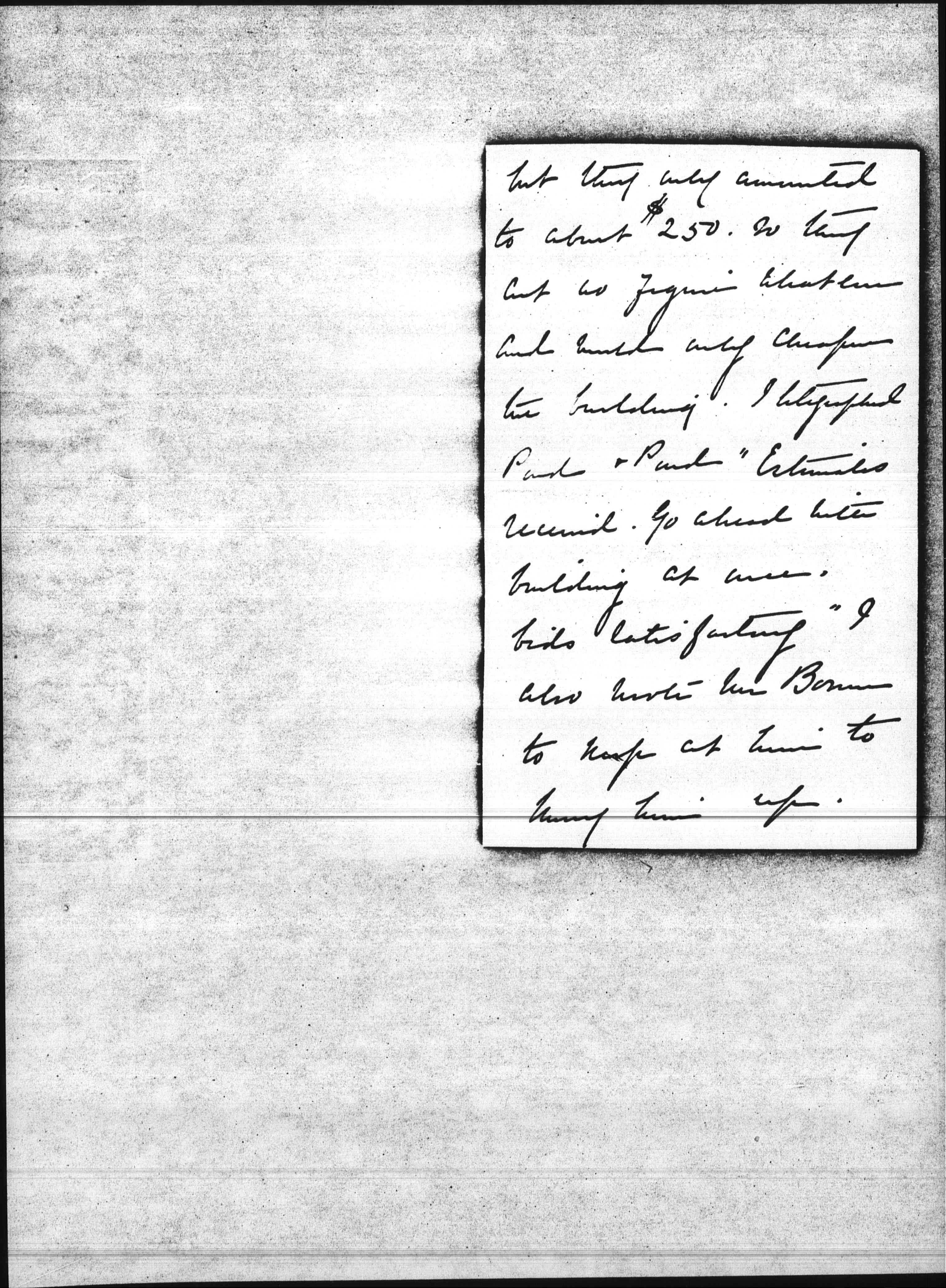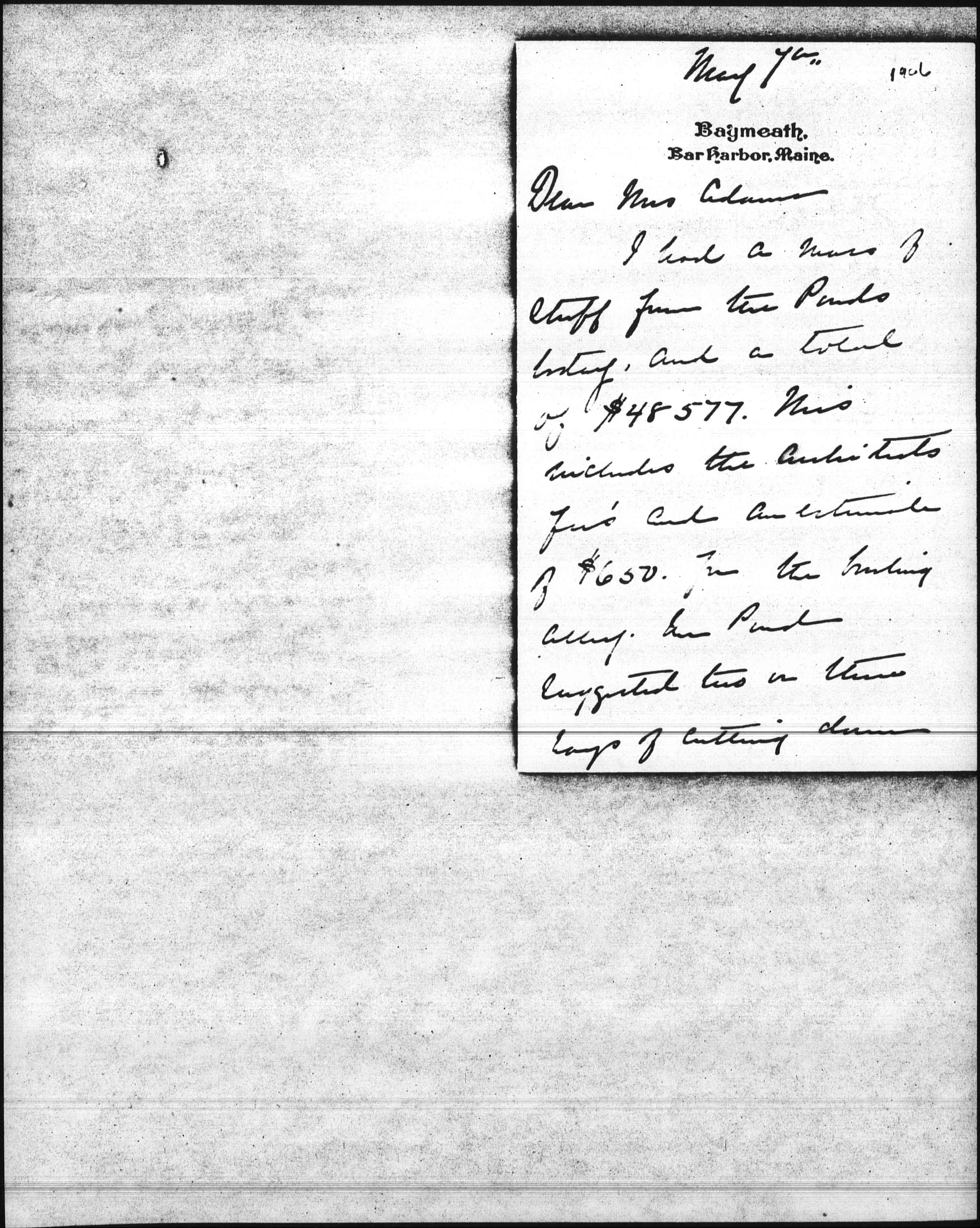 I had a mass of stuff from the Ponds today, and a total of $48577. This includes the architects fee's and an estimate of $650. for the building alley Mr Pond suggested two or three ways of cutting down [page 2] but they only amounted to about $250. So they cut no figures whatever and would only cheapen the building. I telegraphed Pond & Pond "Estimates received. Go ahead with building at once. bids satisfactory" I also wrote Mr. Bowen to keep at him to hurry him up. [page 3] I see he has only estimated Plumbing and Heating I do not see why he did not get bids for them. I suppose if I was on the spot I might go [over] the plans and possibly we might cut down a little bit from Mr Ponds letter & do not see that it would amount to much. He also has not made an estimate for [illegible] and [decorating] and he will have to have something [page 4] not just plain white halls. Do you know if this includes a high wainscot in the game room and Library? Mr Pond says that if the Building Dep't will say that the building is a club house that some saving might be [effected?], but I do not begrudge having it made safer in case of fire. Please don't worry about the total, it is all right [page 5] and I shall still have enough to keep away the wolf. So we'll go right ahead and do tell Mr Pond it must be furnished in the Hall. I am writing him this tonight.