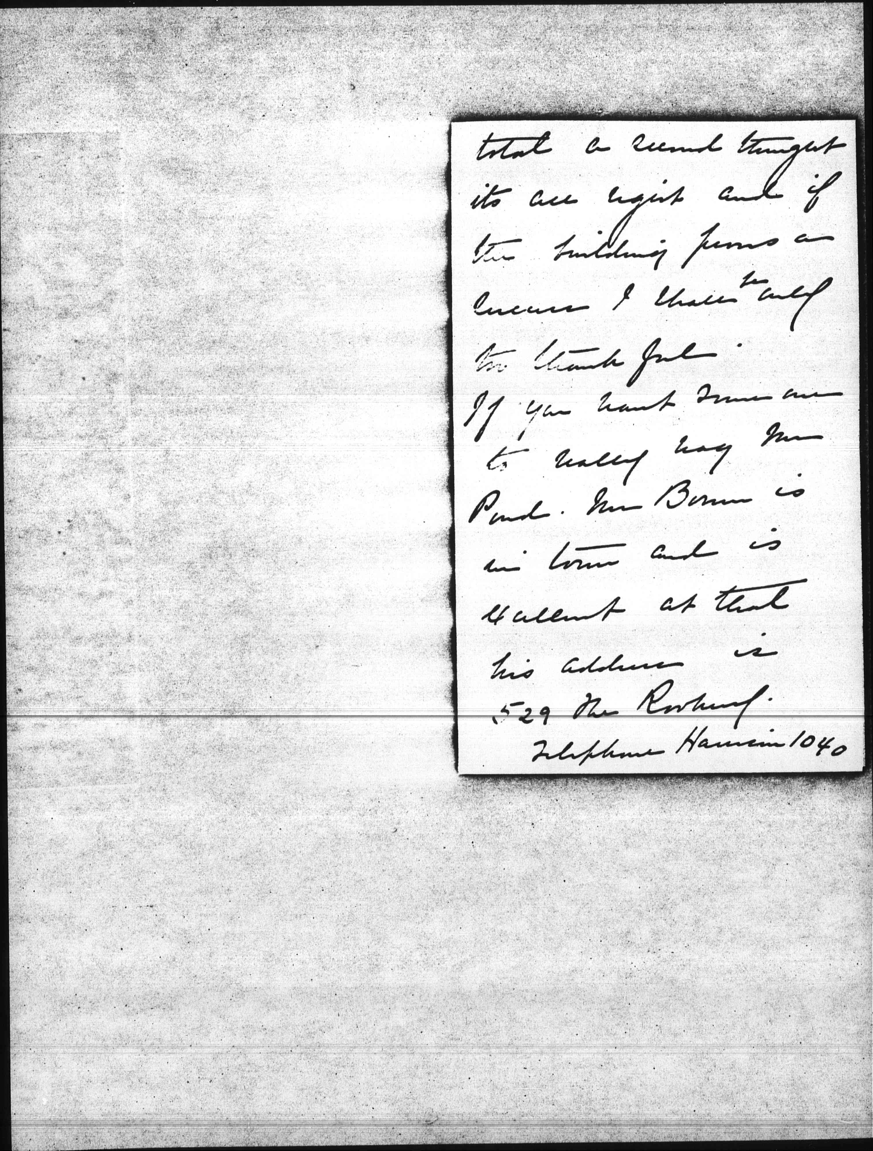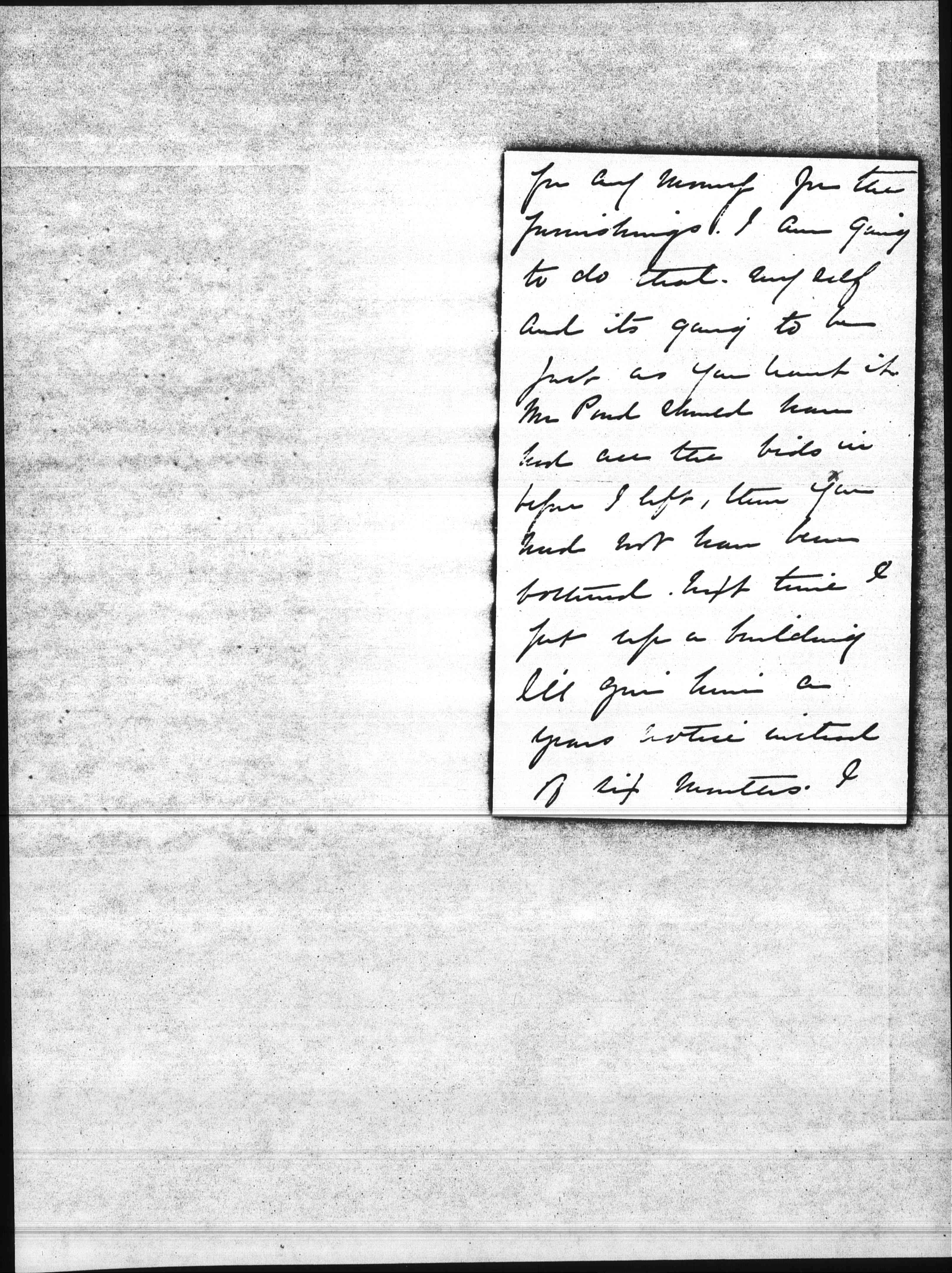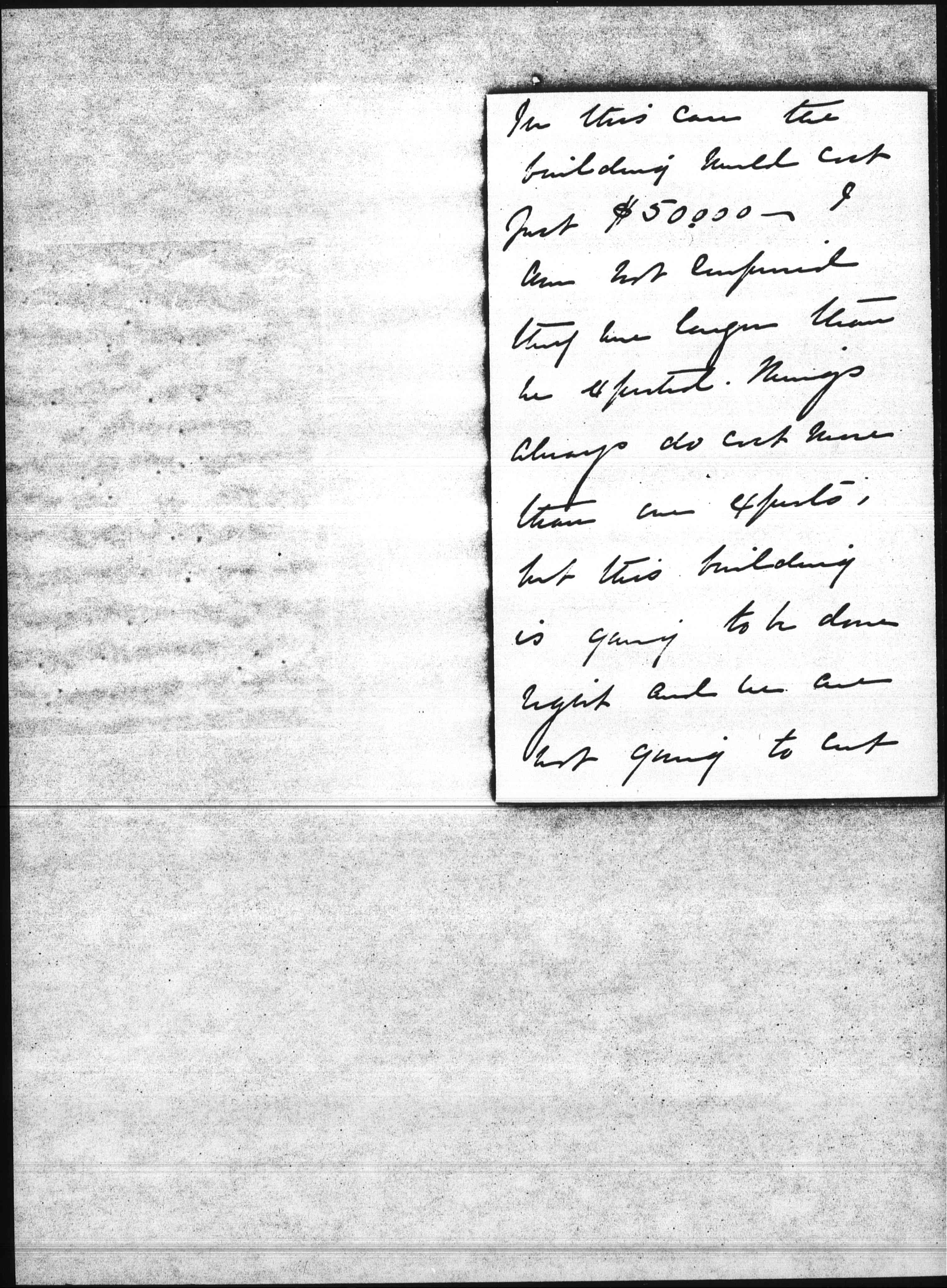 Your letter of May 4th just arrived and I note the bids are $47677. I wonder if this includes the Pond's Commission which I suppose must amount to about $2300. [page 2] In this case the building would cost just $50,000 – I am not surprised they were larger than he expected. Things always do cost more than one expects, but this building is going to be done right and we are not going to cut [page 3] down and have things not right and then in a year or two pull them all down. So unless you can see some thing that might just as will be left out, tell the Ponds to go ahead, no matter whether commission is included or not – and please you are not to ask anyone [page 4] for any money for the furnishings. I am going to do that myself and it's going to be just as you want it. Mr Pond should have had all the bids in before I left, then you need not have been bothered. Next time I put up a building I'll give him a years notice instead of six months. I [page 5] conclude he hasn't even begun yet and when you see him you might [express?] to him that I am in a towering rage and that he must pass the [illegible], if he puts on that little [illegible]. Can he [ought] to put on a [man] to push him. Please don't give the [sum] [page 6] total a second thought its all right and if the building proves a success I shall ↑be↓ only too thankful.