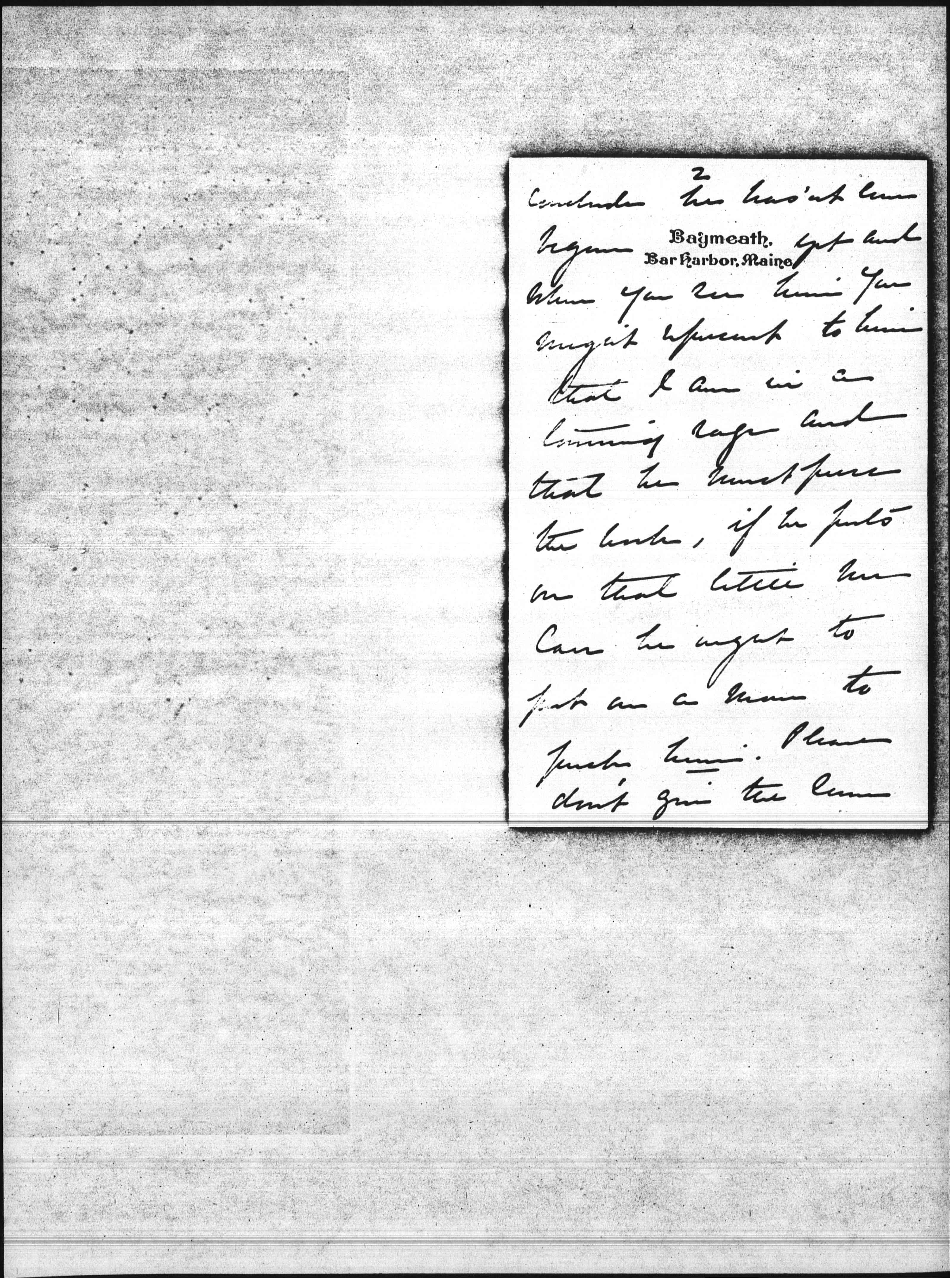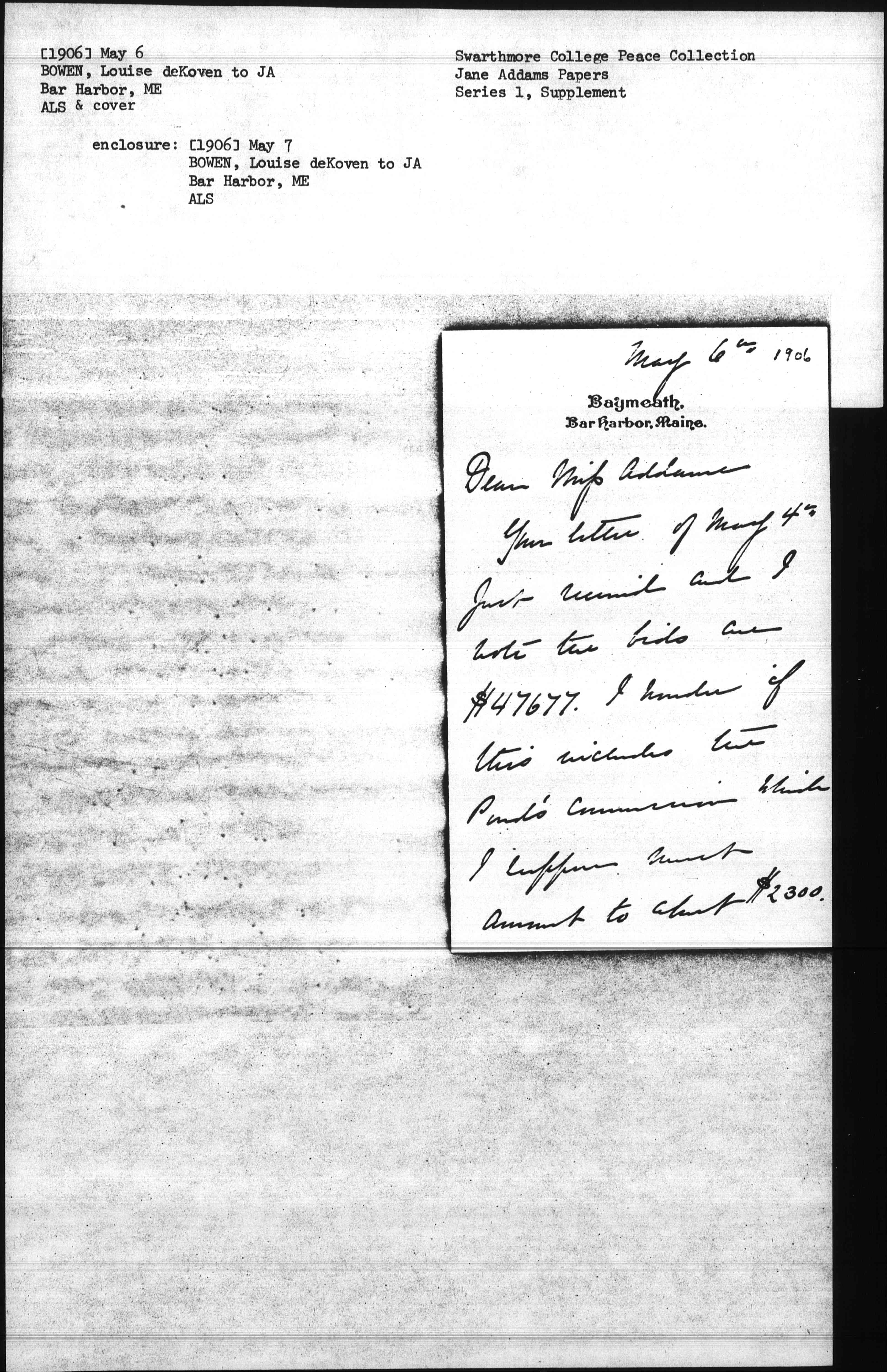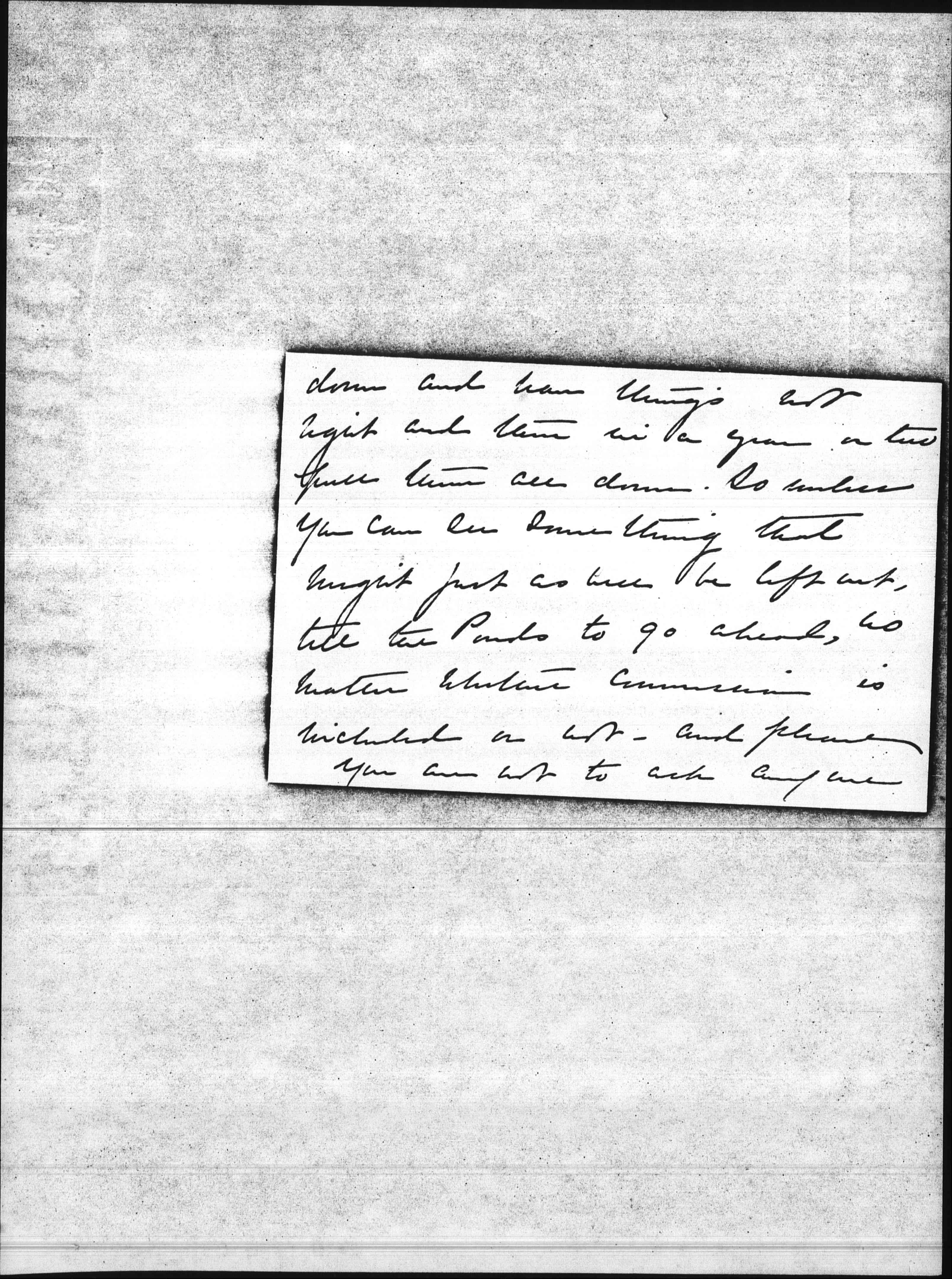 Your letter of May 4th just arrived and I note the bids are $47677. I wonder if this includes the Pond's Commission which I suppose must amount to about $2300. [page 2] In this case the building would cost just $50,000 – I am not surprised they were larger than he expected. Things always do cost more than one expects, but this building is going to be done right and we are not going to cut [page 3] down and have things not right and then in a year or two pull them all down. So unless you can see some thing that might just as will be left out, tell the Ponds to go ahead, no matter whether commission is included or not – and please you are not to ask anyone [page 4] for any money for the furnishings. I am going to do that myself and it's going to be just as you want it. Mr Pond should have had all the bids in before I left, then you need not have been bothered. Next time I put up a building I'll give him a years notice instead of six months. I [page 5] conclude he hasn't even begun yet and when you see him you might [express?] to him that I am in a towering rage and that he must pass the [illegible], if he puts on that little [illegible]. Can he [ought] to put on a [man] to push him. Please don't give the [sum] [page 6] total a second thought its all right and if the building proves a success I shall ↑be↓ only too thankful.