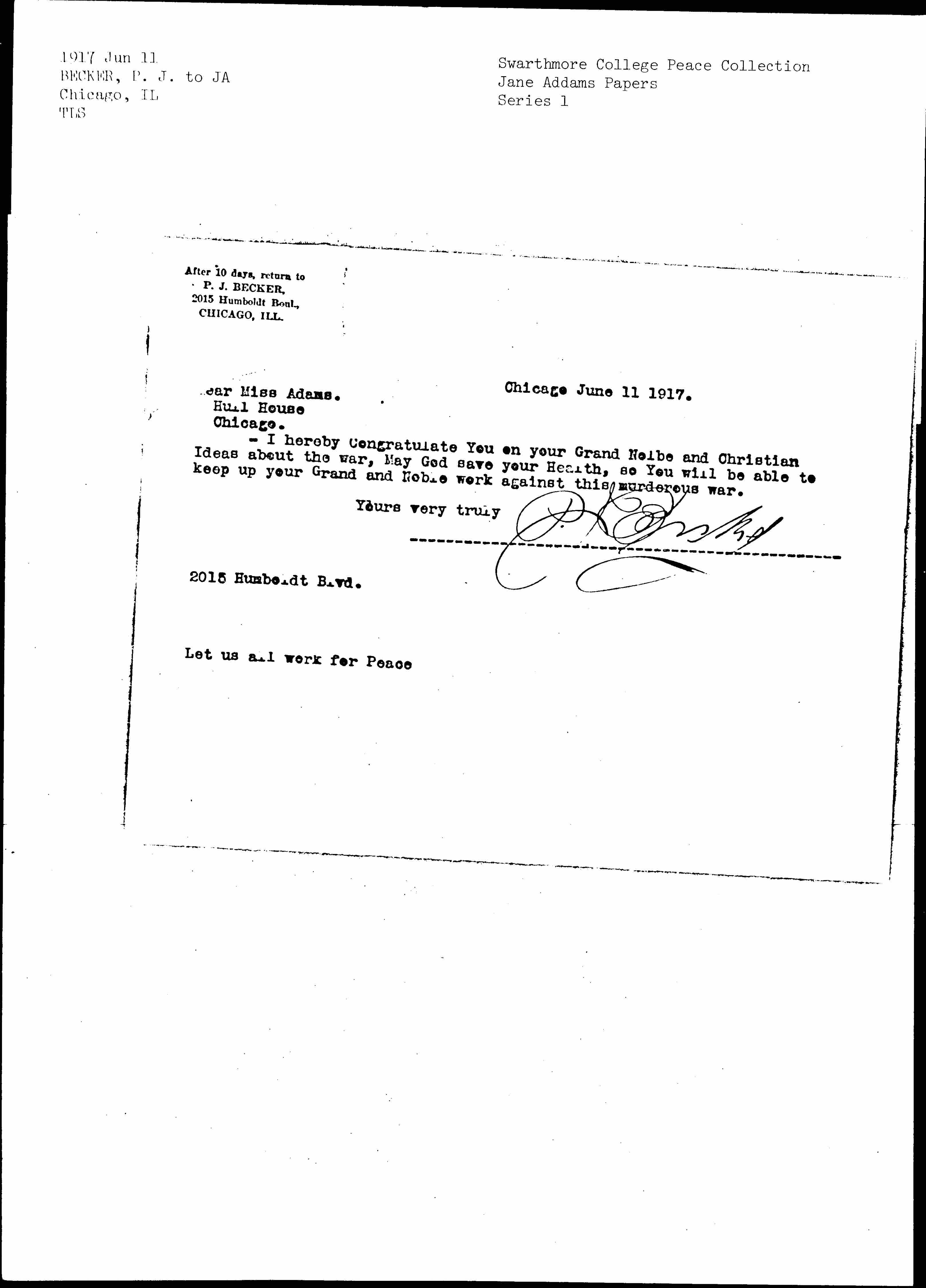 -- I hereby Congratulate You on your Grand Noble and Christian Ideas about the war, May God save your Health, so You will be able to keep up your Grand and Noble work against this murderous war.