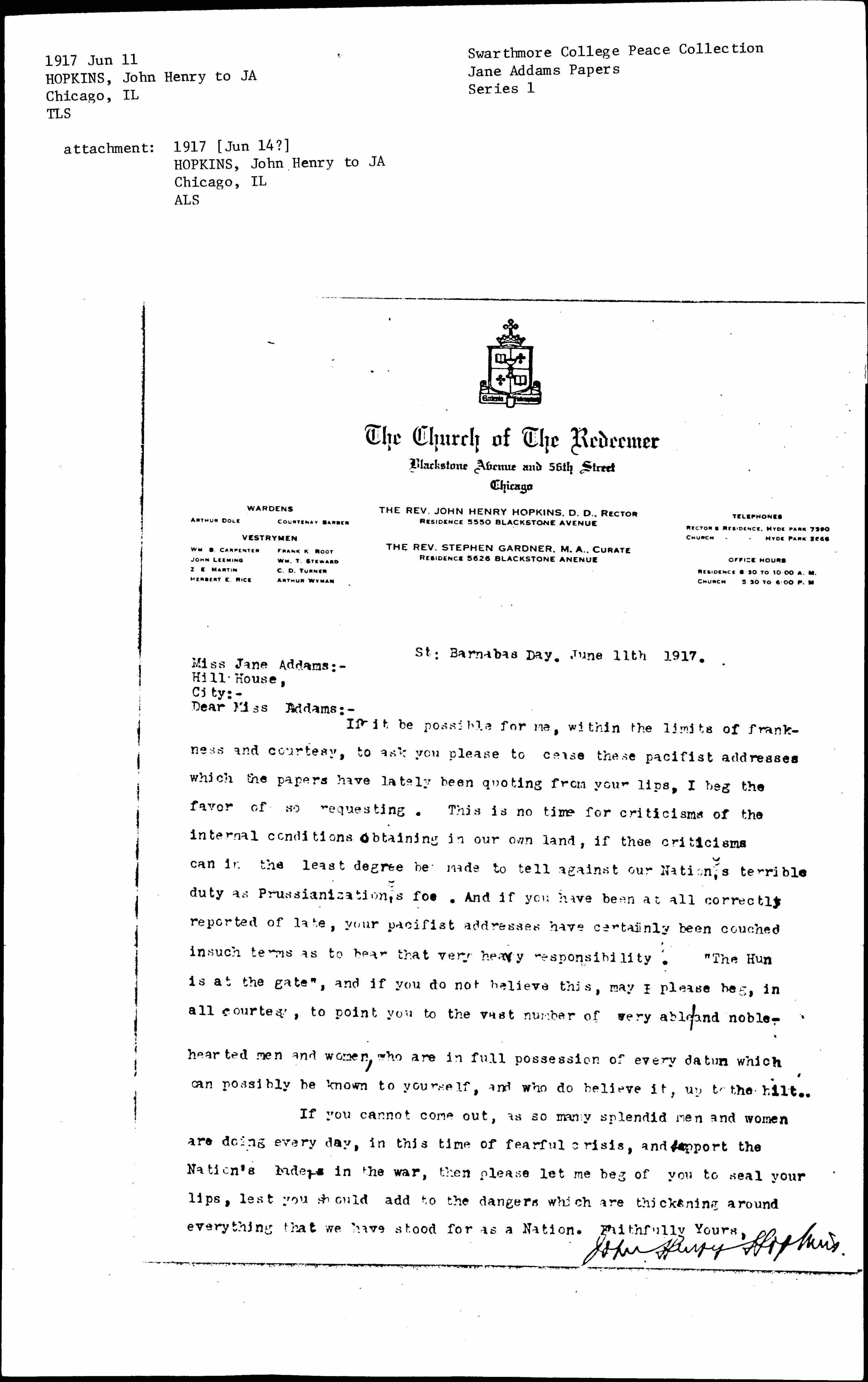 If it be possible for me, within the limits of frankness and courtesy, to ask you please to cease these pacifist addresses which the papers have lately been quoting from your lips, I beg the favor of so requesting. This is no time for criticisms of the internal conditions obtaining in our own land, if these criticisms can in the least degree be made to tell against our Nation's terrible duty as Prussianization's foe. And if you have been at all correctly reported of late, your pacifist addresses have certainly been couched in such terms as to bear that very heavy responsibility. "The Hun is at the gate", and if you do not believe this, may I please beg, in all courtesy, to point you to the vast number of very able and noble-hearted men and women, who are in full possession of every datum which can possibly be known to yourself, and who do believe it, up to the hilt.