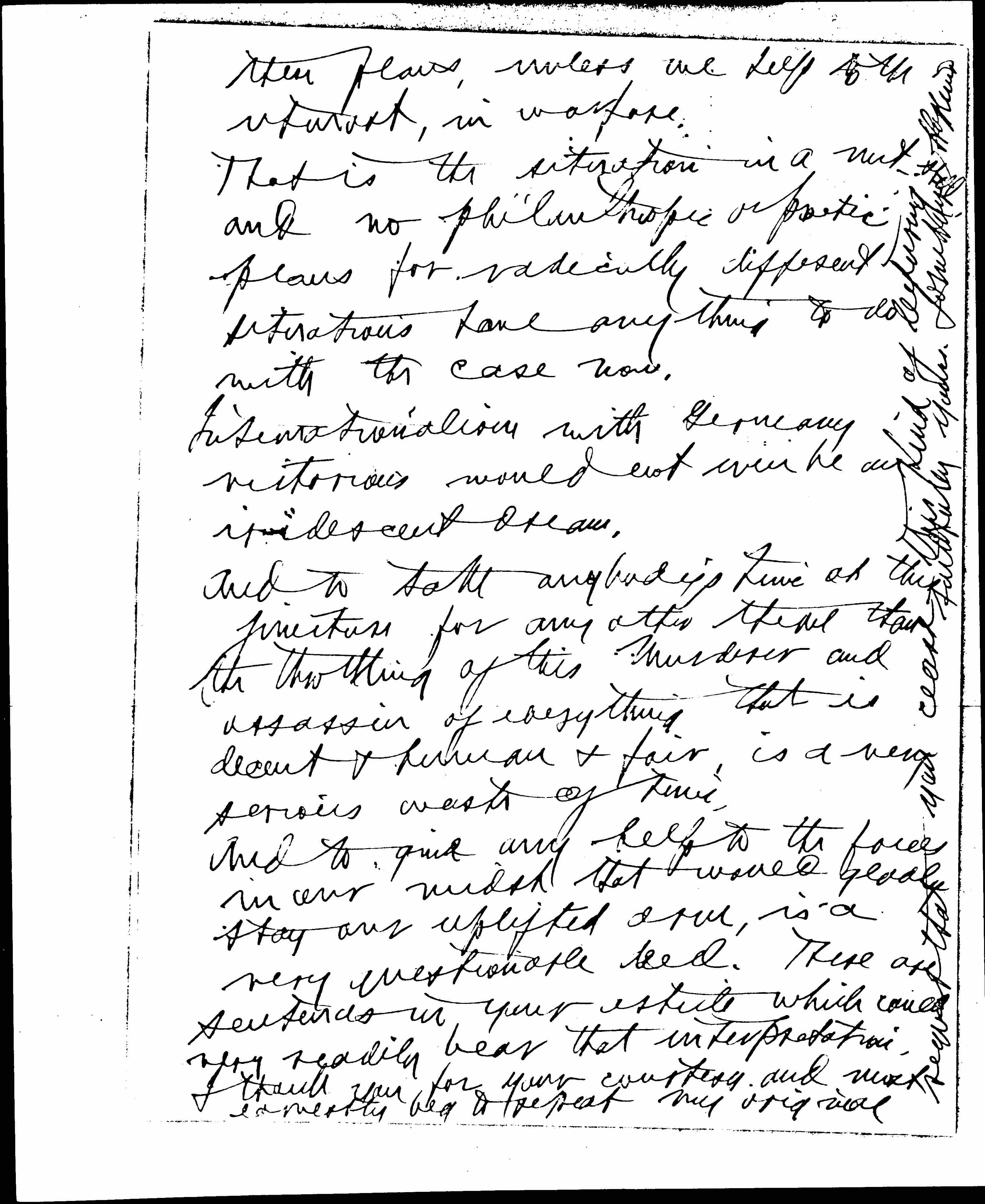 And to give any help to the forces in our midst that would gladly stay our uplifted arm, is a very questionable deed. There are sentences in your article which could very readily bear that interpretation. I thank you for your courtesy and must earnestly beg to repeat my original [written up the right margin] request that you cease this kind of lecturing!