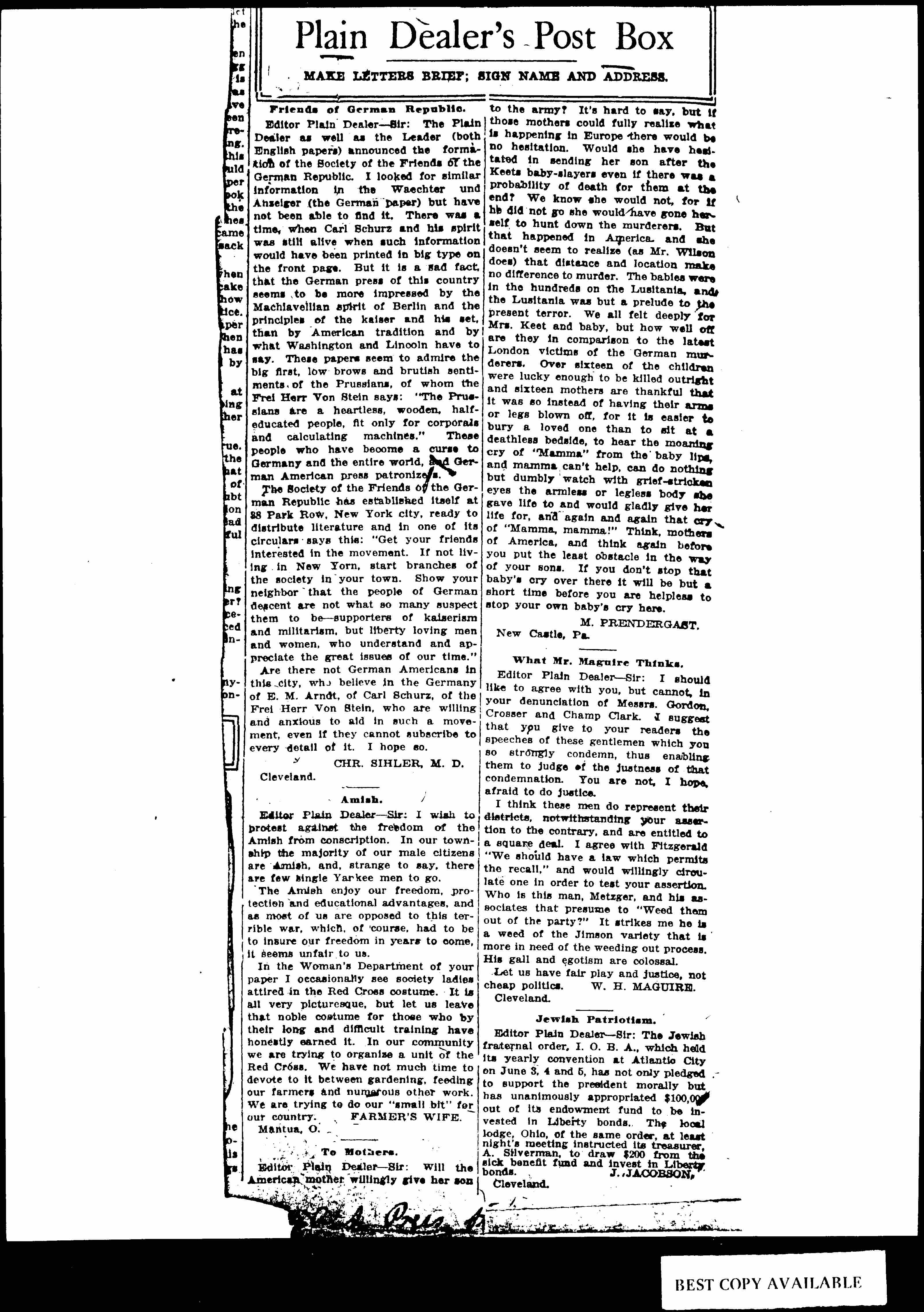 Editor Plain Dealer -- Sir: The Plain Dealer as well as the Leader (both English papers) announced the formation of the Society of the Friends of the German Republic. I looked for similar information in the Waechter und Anzeiger (the German paper) but have not been able to find it. There was a time, when Carl Schurz and his spirit was still alive when such information would have been printed in big type on the front page. But it is a sad fact, that the German press of this country seems to be more impressed by the Machiavellian spirit of Berlin and the principles of the kaiser and his set, than by American tradition and by what Washington and Lincoln have to say. These papers seem to admire the big first, low brows and brutish sentiments of the Prussians, of whom the Frei Herr Von Stein says: "The Prussians are a heartless, wooden, half-educated people, fit only for corporals and calculating machines." These people who have become a curse to Germany and the entire world, and German American press [patronizes].