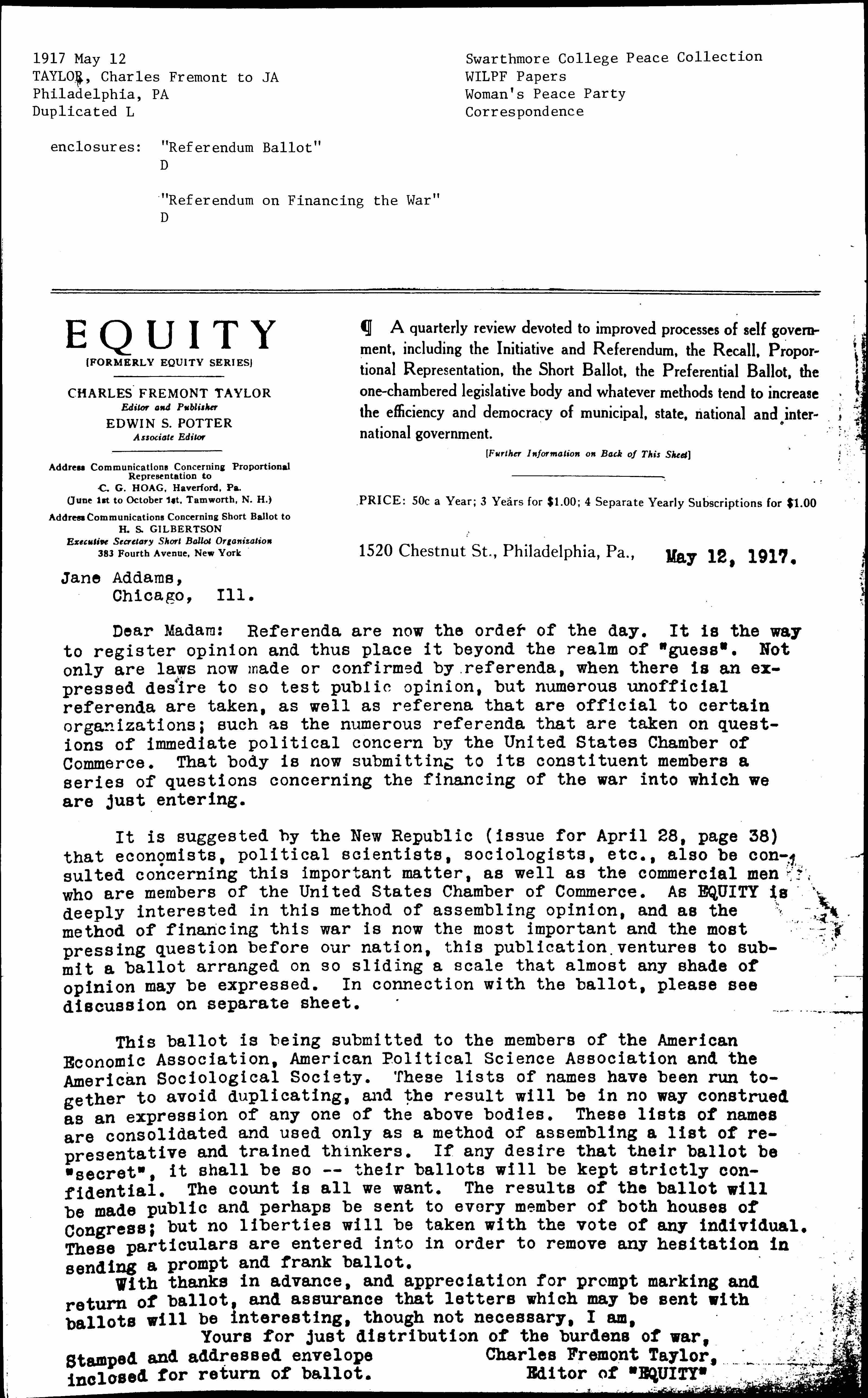 Dear Madam: Referenda are now the order of the day. It is the way to register opinion and thus place it beyond the realm of "guess". Not only are laws now made or confirmed by referenda, when there is an expressed desire to so test public opinion, but numerous unofficial referenda are taken, as well as [referenda] that are official to certain organizations; such as the numerous referenda that are taken on questions of immediate political concern by the United States Chamber of Commerce. That body is now submitting to its constituent members a series of questions concerning the financing of the war into which we are just entering.