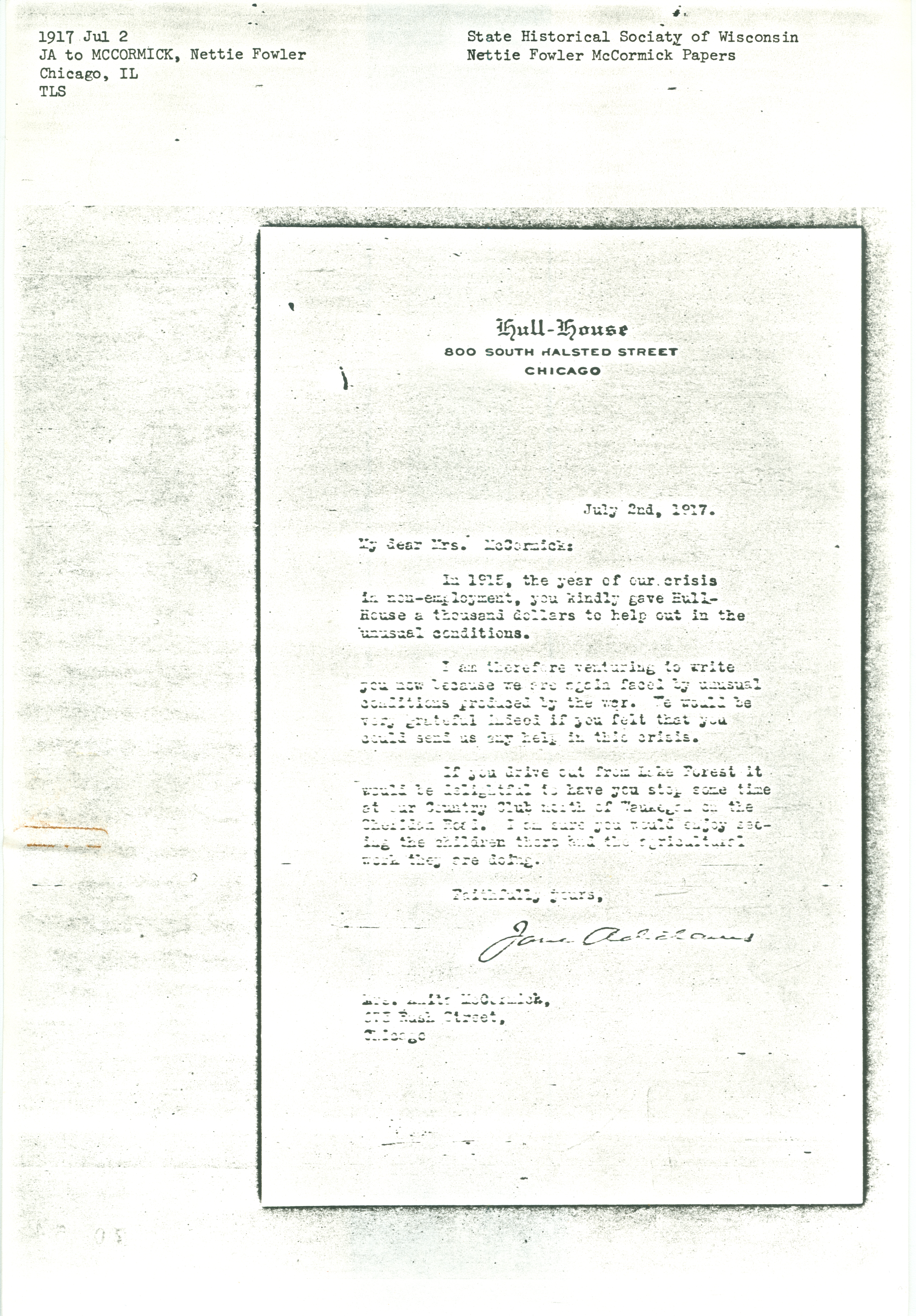 In 1915, the year of our crisis in non-employment, you kindly gave Hull-House a thousand dollars to help out in the unusual conditions.