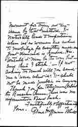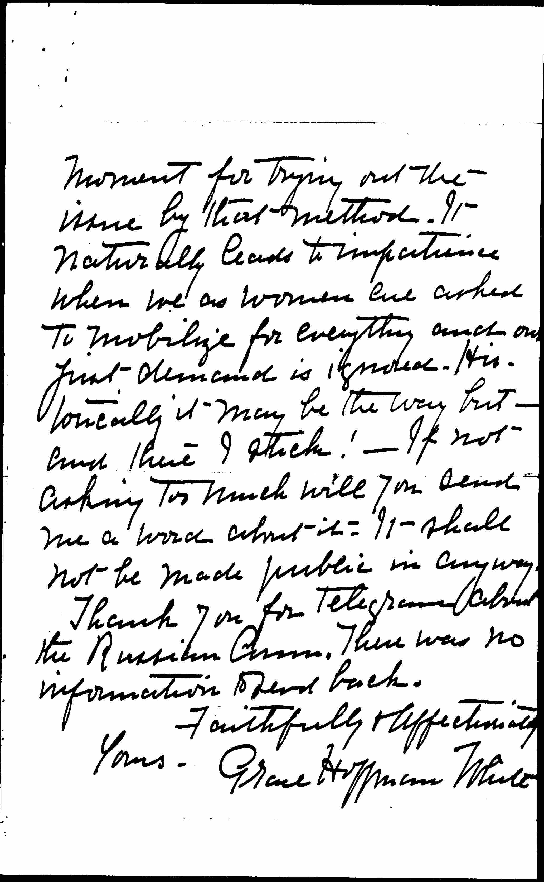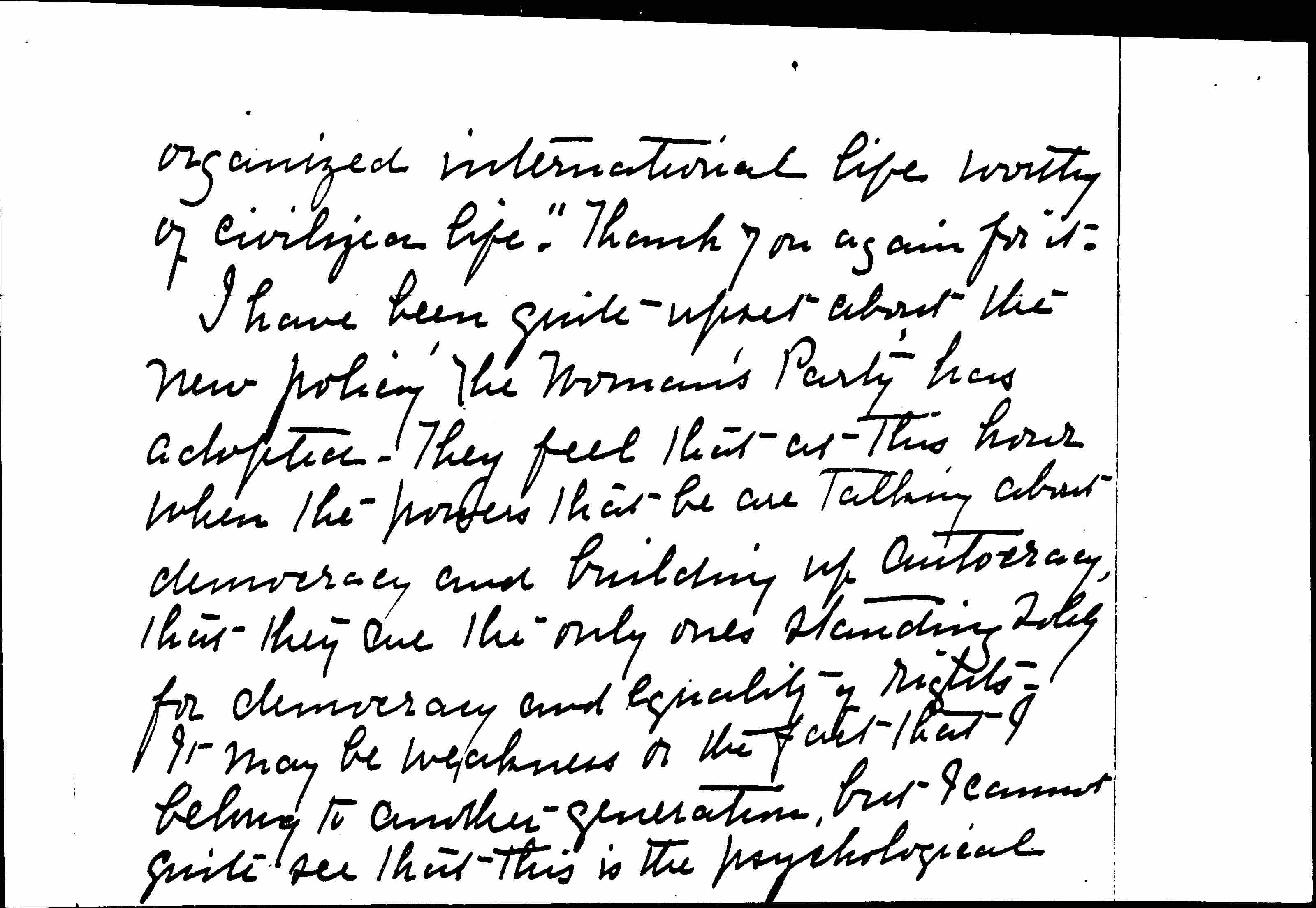 I have been quite upset about the new policy the Woman's Party has adopted. They feel that at this hour when the powers that be are talking about democracy and building up autocracy, that they are the only ones standing solely for democracy and equality of rights. It may be weakness or the fact that I belong to another generation, but I cannot quite see that this is the psychological [page 4] moment for trying out the issue by that method. It naturally leads to impatience when we as women are asked to mobilize for everything and our first demand is ignored. Historically it may be the way but -- and there I stick! -- If not asking too much will you send me a word about it. It shall not be made public in any way.