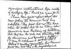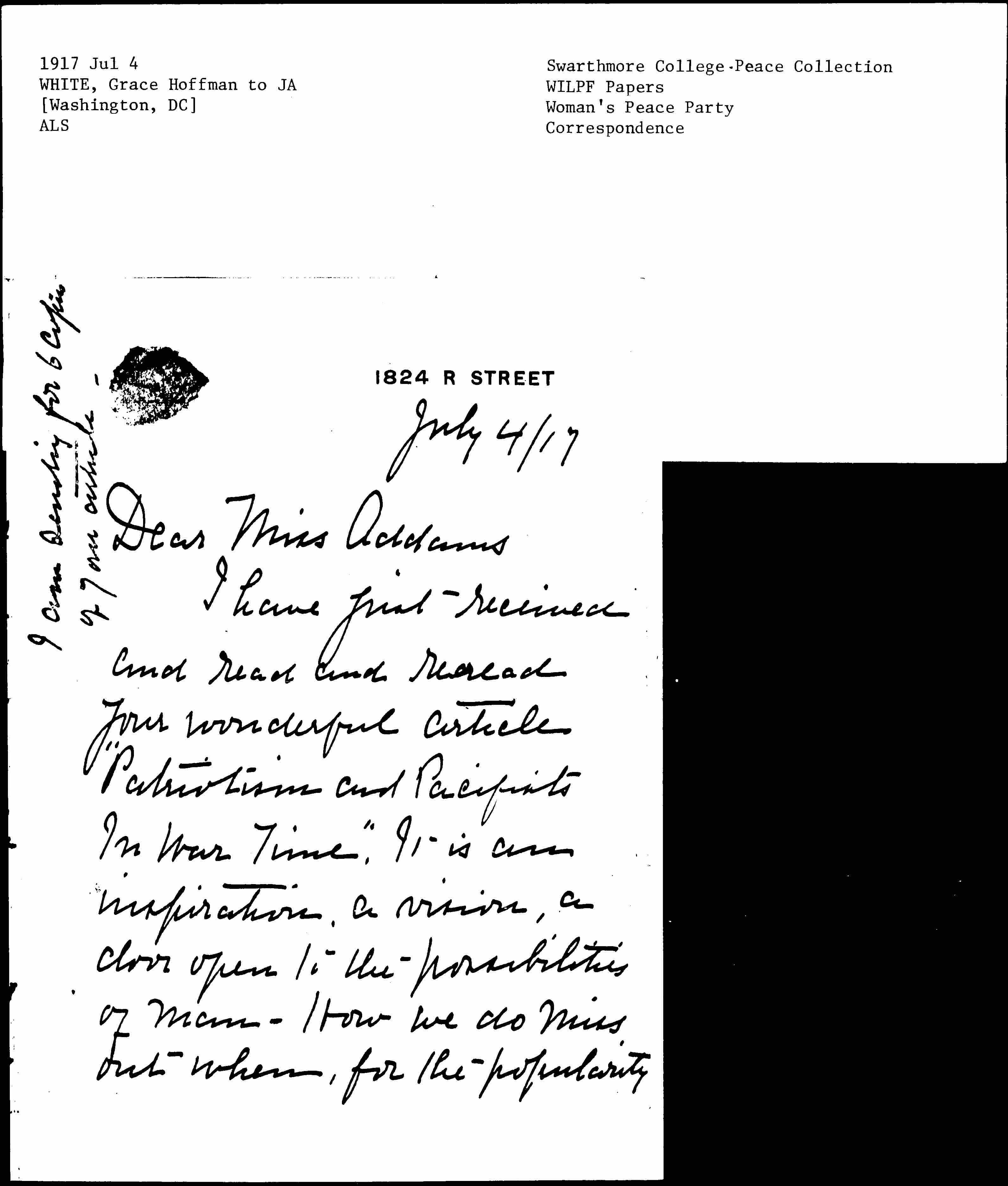 I have just received and read and reread your wonderful article "Patriotism and Pacifists In War Time." It is an inspiration, a vision, a door open to the possibilities of man -- How we do miss out when, for the popularity [page 2] of an hour, we refuse to make practical the vision for the people. This is the what America, I feel has done -- missed a great international opportunity. To me you are as one who holds a beacon which nothing can extinguish for it is the light of Truth. Only by this light may we reach <the> path of true patriotism that shall indeed "lead all nations of the earth into an [page 3] organized international life worthy of civilized life." Thank you again for it.
