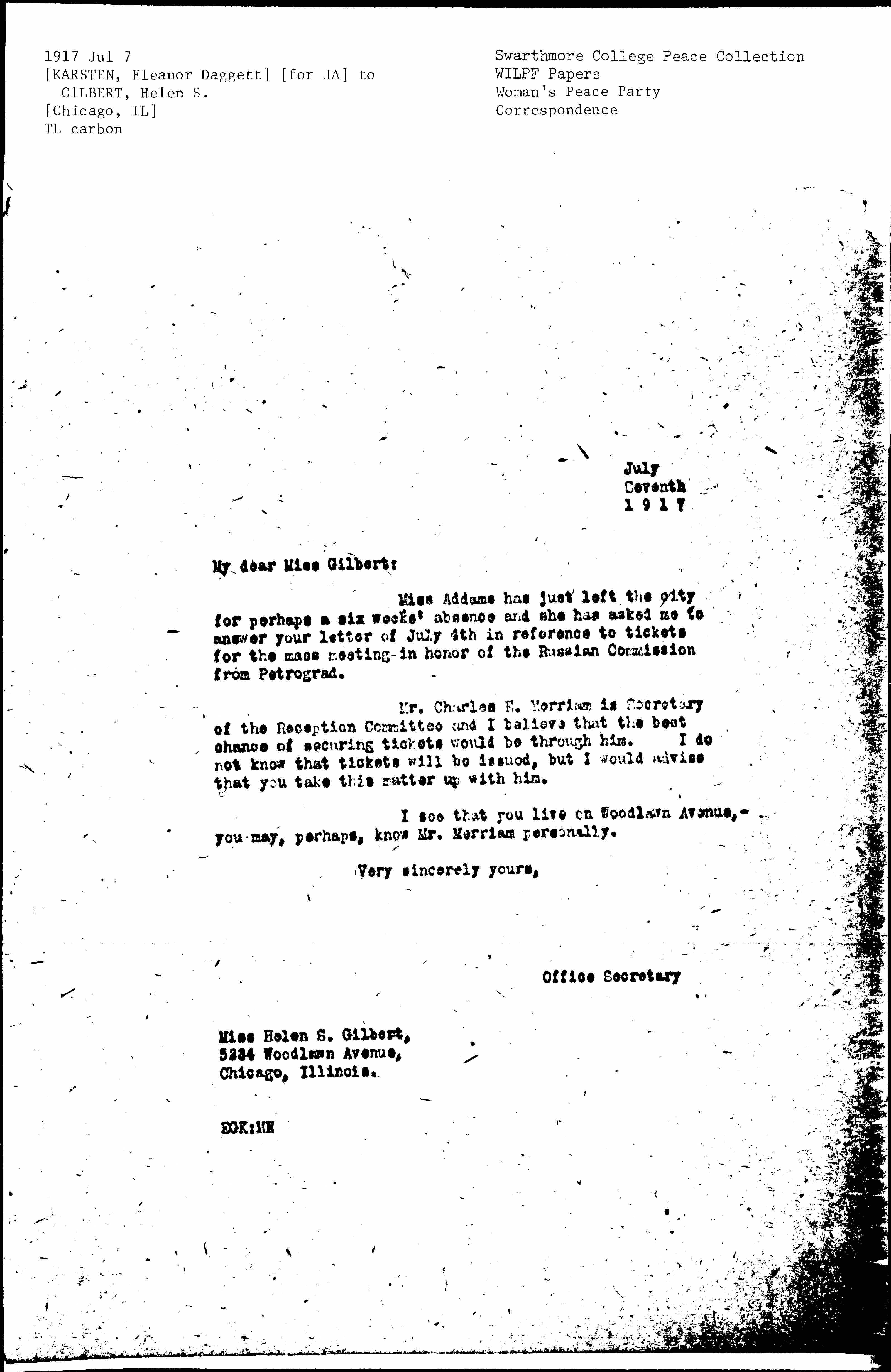 Miss Addams has just left the city for perhaps a six weeks' absence and she has asked me to answer your letter of July 4th in reference to tickets for the mass meeting in honor of the Russian Commission from Petrograd.
