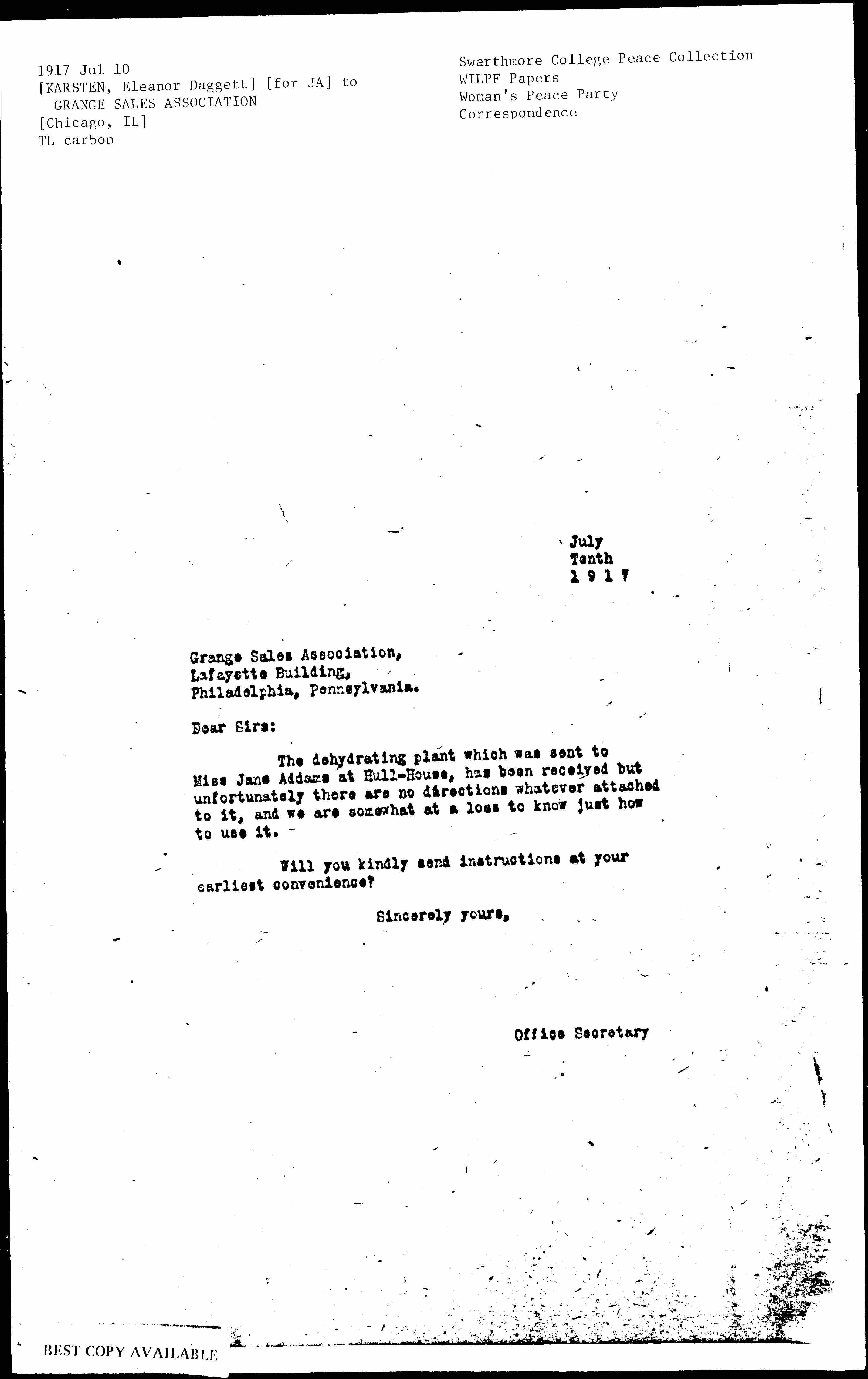 The dehydrating plant which was sent to Miss Jane Addams at Hull-House, has been received but unfortunately there are no directions whatever attached to it, and we are somewhat at a loss to know just how to use it.