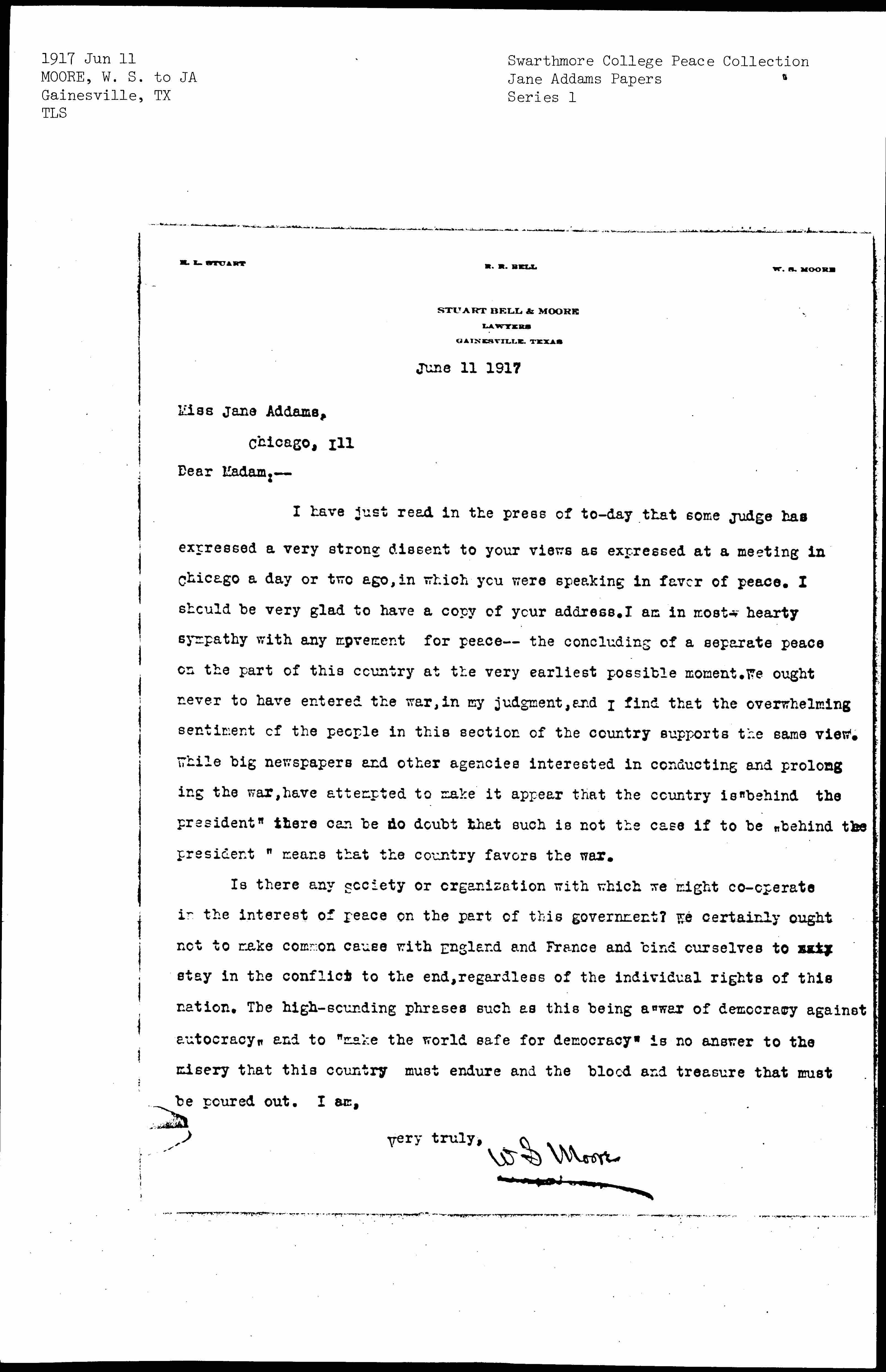 Is there any society or organization with which we might [cooperate] in the interest of peace on the part of this government? We certainly ought not to make common cause with England and France and bind ourselves to [illegible] stay in the conflict to the end, regardless of the individual rights of this nation. The high-sounding phrases such as this being a "war of democracy against autocracy" and to "make the world safe for democracy" is no answer to the misery that this country must endure and the blood and treasure that must be poured out. I am,