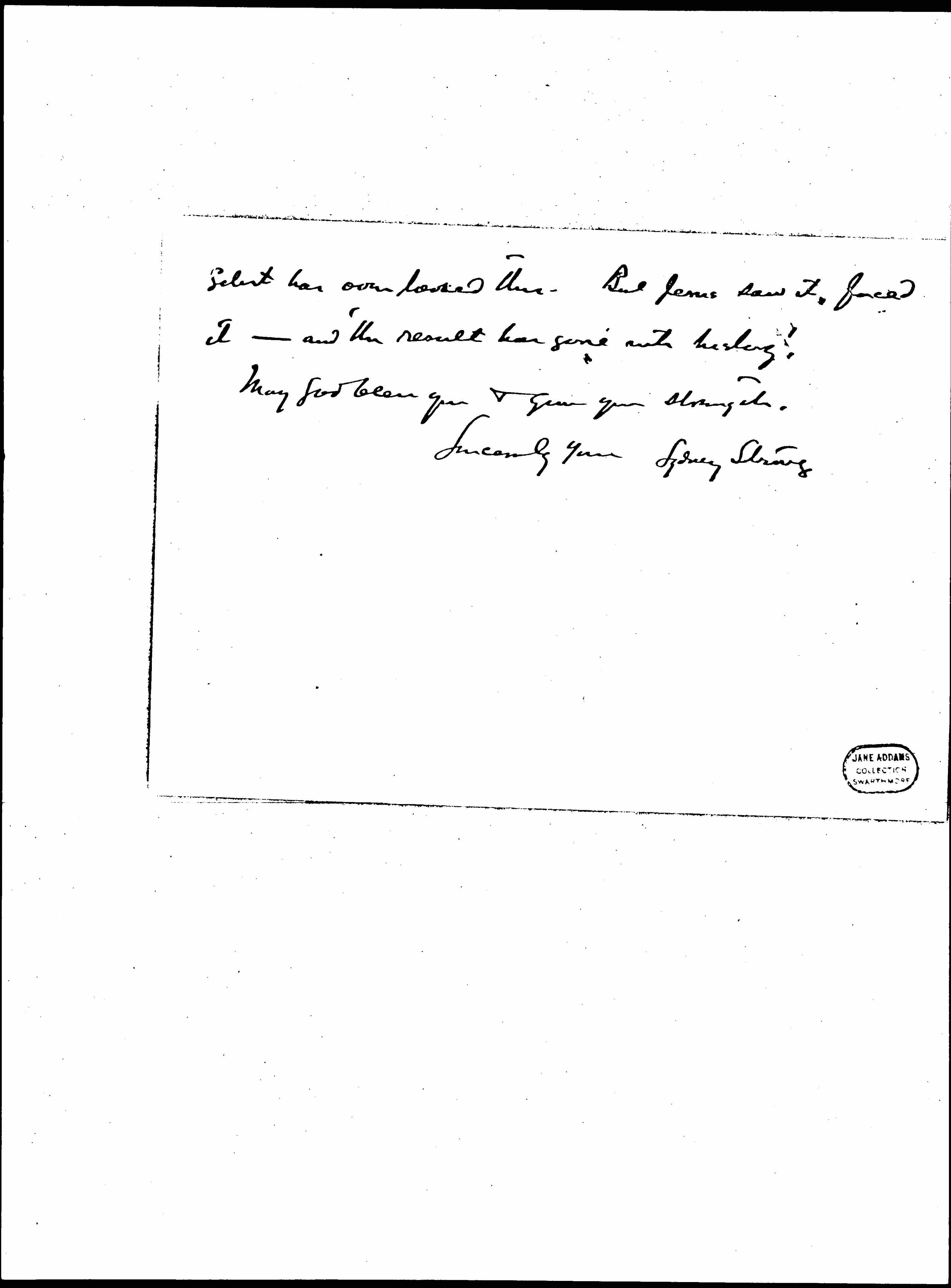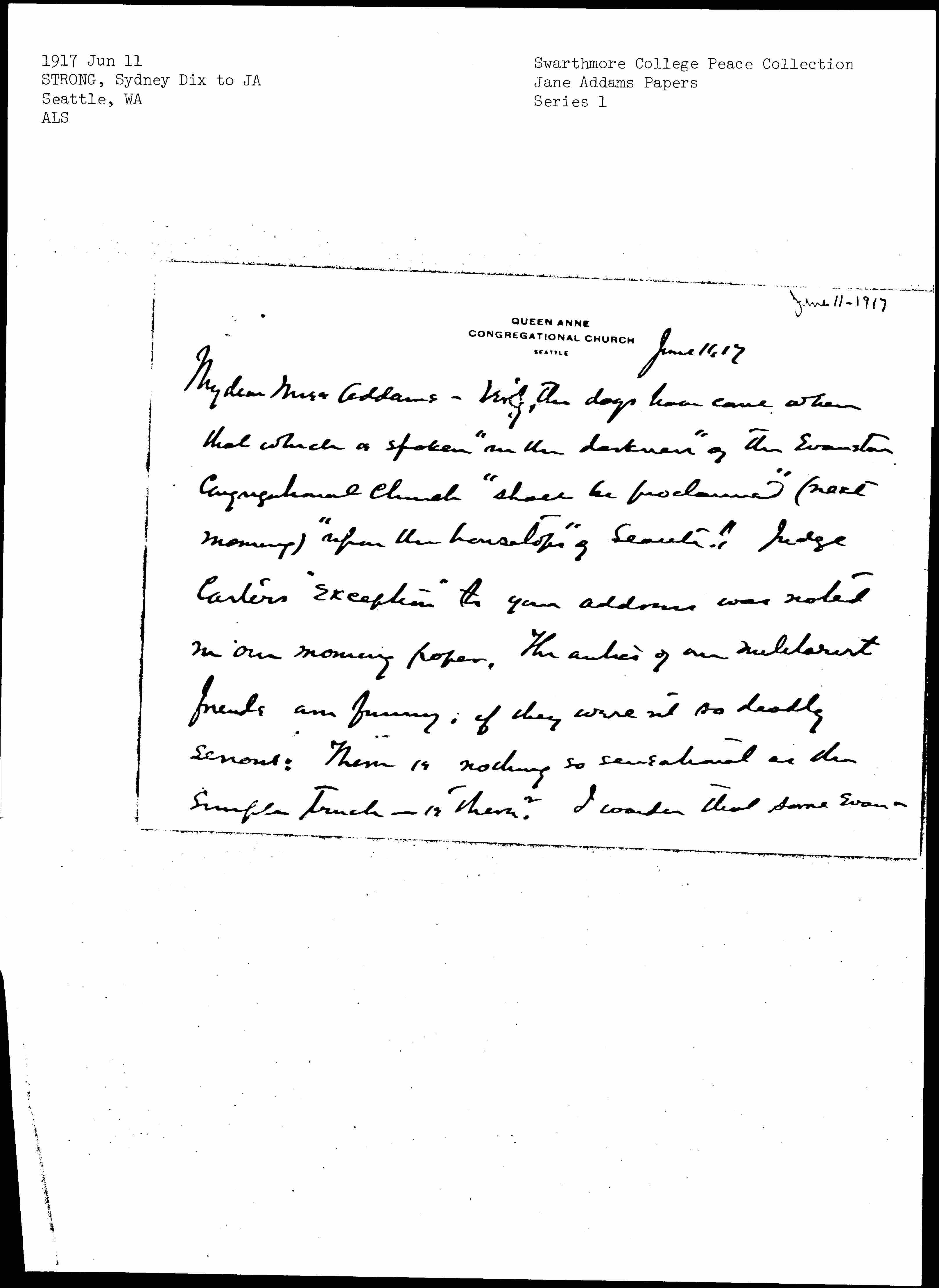 My dear Miss Addams -- [Verily], the days have come when that which is spoken "in the darkness" of the Evanston Congregational Church "shall be proclaimed" (next morning) "upon the housetops" of Seattle!! Judge Carters "exception" to your address was noted in our morning paper. The antics of our militarist friends are funny; if they weren't so deadly serious. There is nothing so sensational as the Simple Truth -- is there? I wonder that some Evangelist [page 2] has over-looked this. But Jesus saw it, faced it -- and "the result has gone with history."
