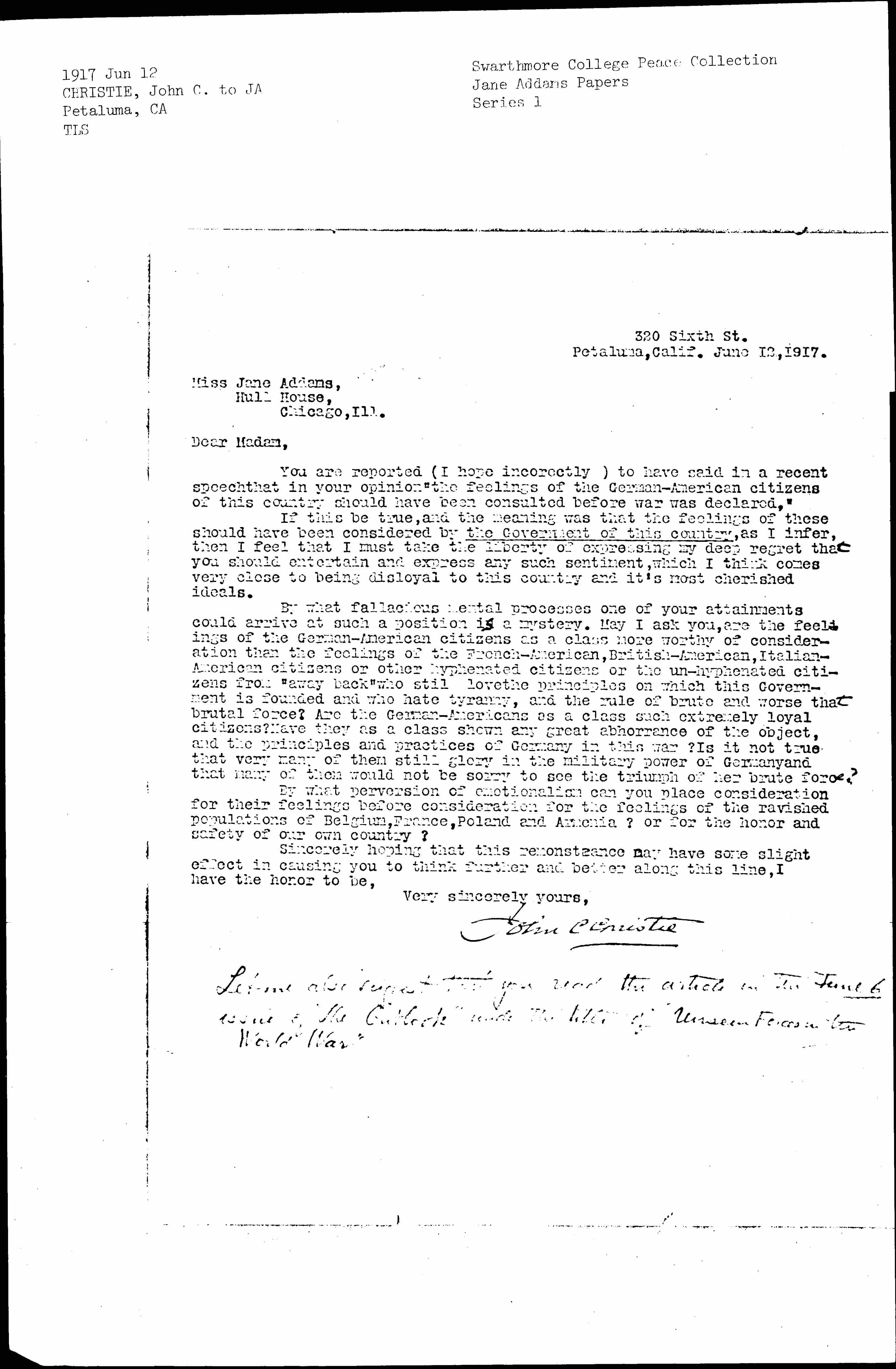 By what fallacious mental processes one of your attainments could arrive at such a position is a mystery. May I ask you, are the feelings of the German-American citizens as a class more worthy of consideration than the feelings of the French-American, British-American, Italian-American citizens or other hyphenated citizens or the [unhyphenated] citizens from "away back" who still love the principles on which this Government is founded and who hate tyranny, and the rule of brute and worse that brutal force? Are the German-Americans as a class such extremely loyal citizens? Have they as a class shown any great [abhorrence] of the object, and the principles and practices of Germany in this war? Is it not true that very many of them still glory in the military power of Germany and that many of them would not be sorry to see the triumph of her brute force?
