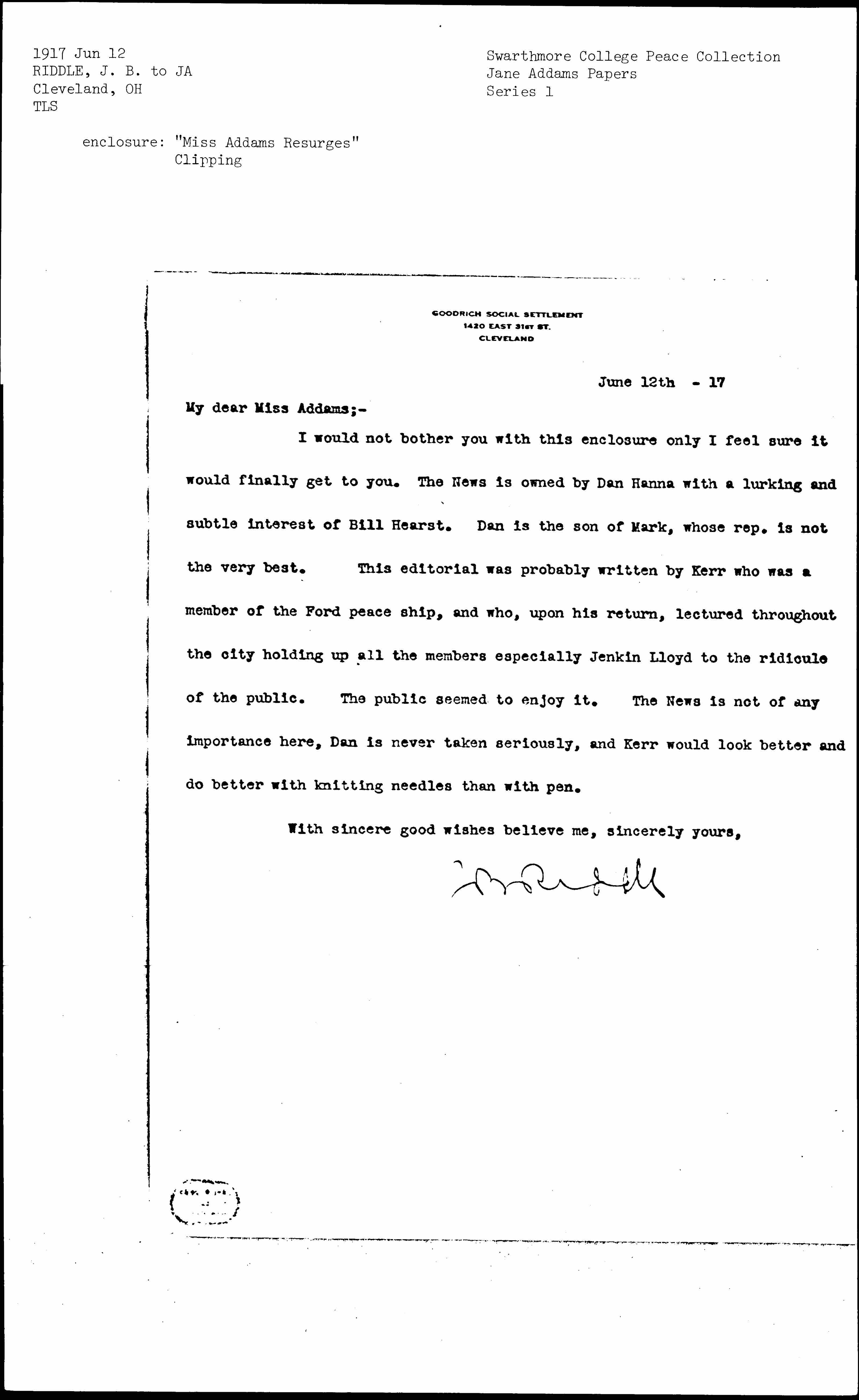 I would not bother you with this enclosure only I feel sure it would finally get to you. The News is owned by Dan Hanna with a lurking and subtle interest of Bill Hearst. Dan is the son of Mark, whose rep. is not the very best. This editorial was probably written by [Karr] who was a member of the Ford peace ship, and who, upon his return, lectured throughout the city holding up all the members especially Jenkin Lloyd to the ridicule of the public. The public seemed to enjoy it. The News is not of any importance here, Dan is never taken seriously, and [Karr] would look better and do better with knitting needles than with pen.