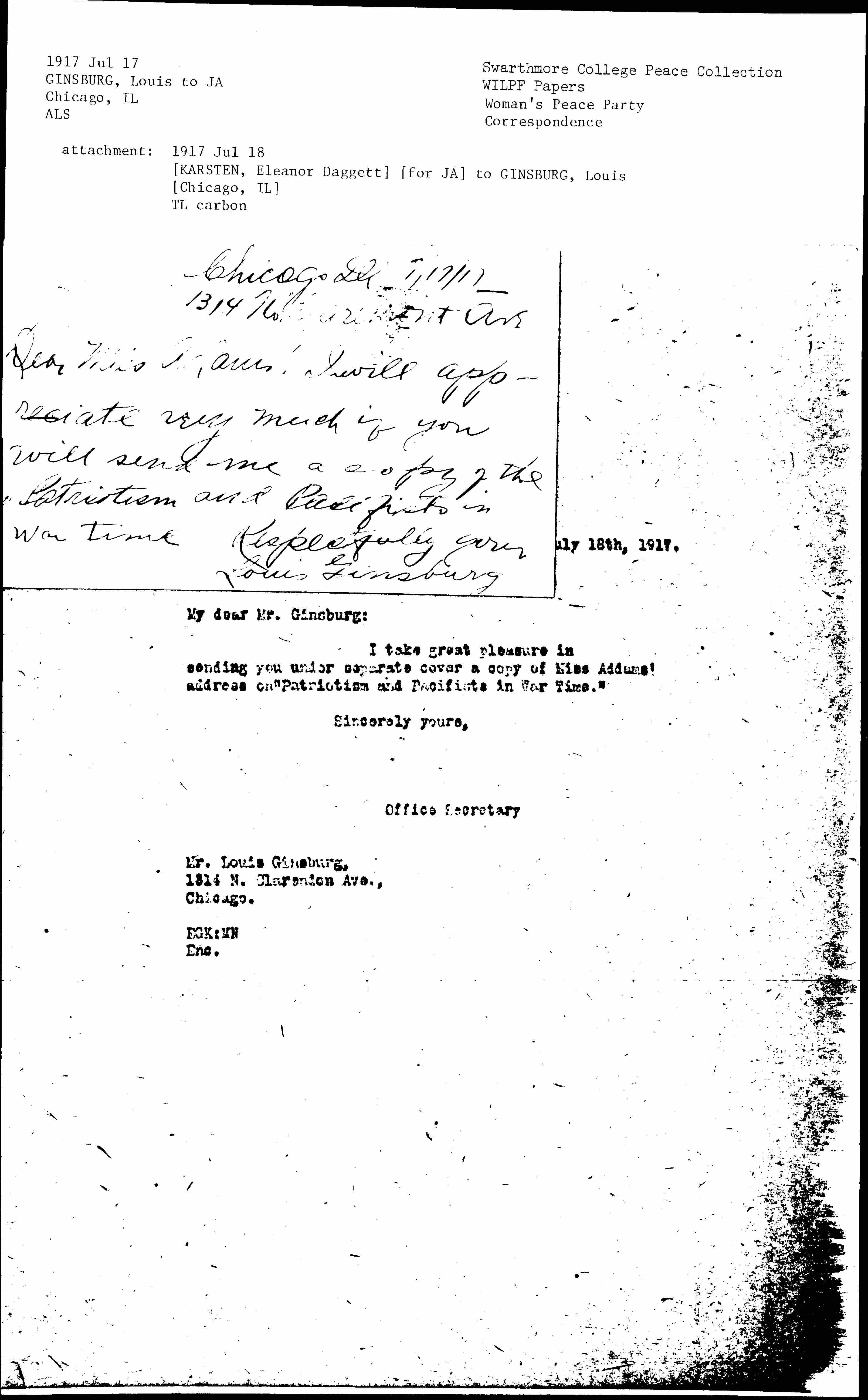 I take great pleasure in sending you under separate cover a copy of Miss Addams' address on "Patriotism and Pacifists in War Time."