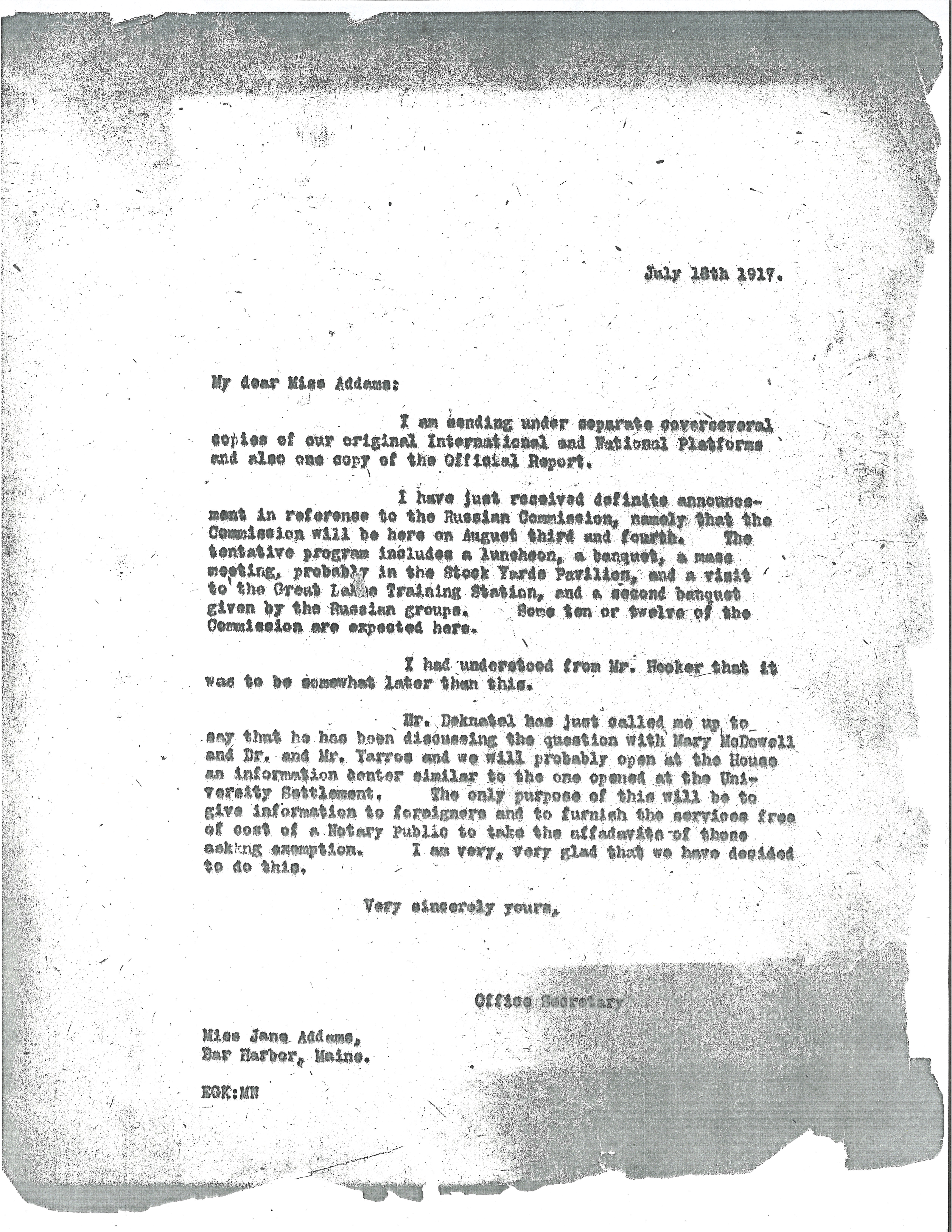 Mr. Deknatel has just called me up to say that he has been discussing the question with Mary McDowell and Dr. and Mr. Yarros and we will probably open at the House an information center similar to the one opened at the University Settlement. The only purpose of this will be to give information to foreigners and to furnish the services free of cost of a Notary Public to take the [affidavits] of those asking exemption. I am very, very glad that we have decided to do this.
