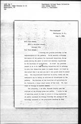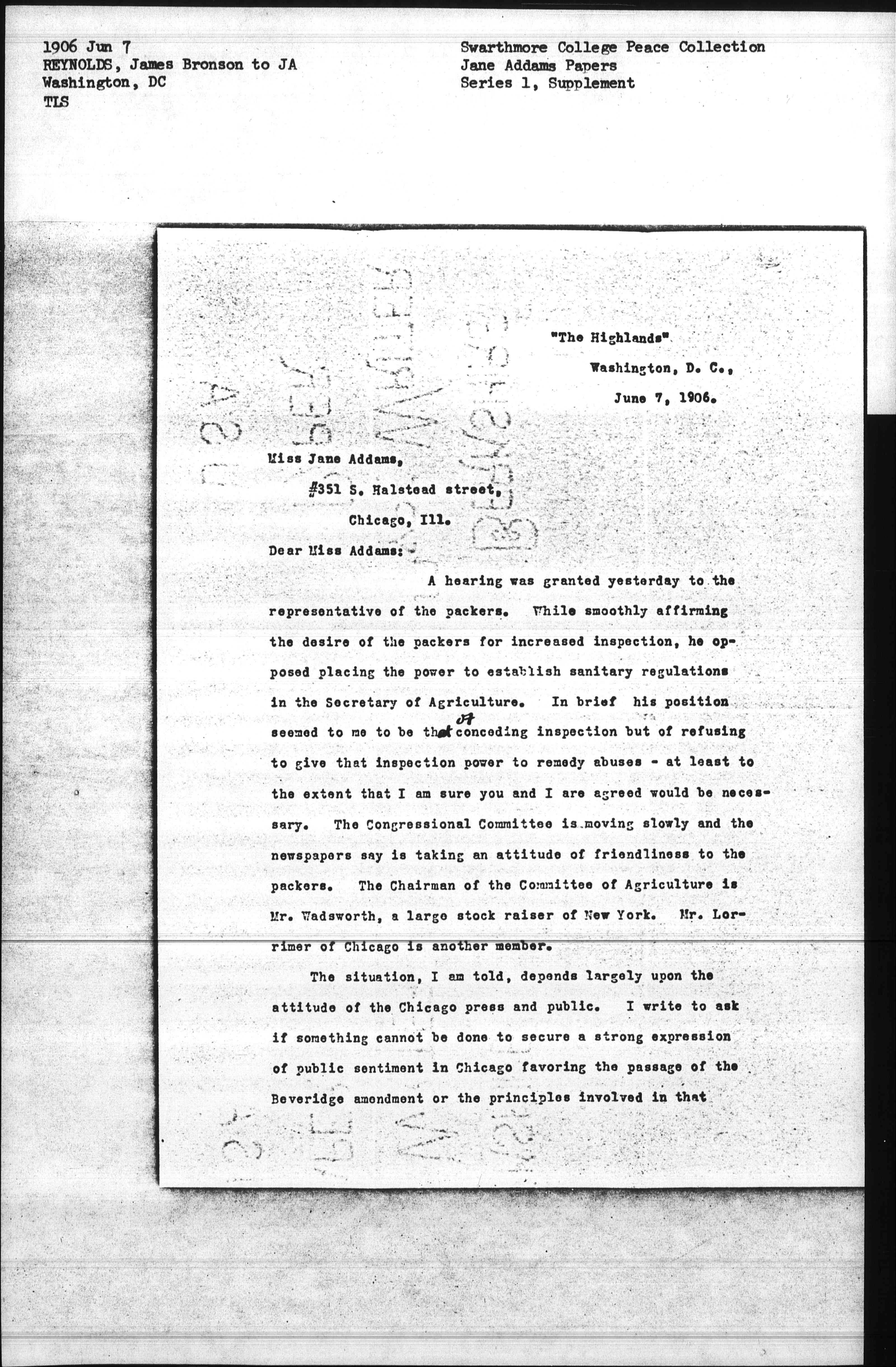 A hearing was granted yesterday to the representative of the packers. While smoothly affirming the desire of the packers for increased inspection, he opposed placing the power to establish sanitary regulations in the Secretary of Agriculture. In brief his position seemd to me to be ↑that of↓ conceding inspection but of refusing to give that inspection power to remedy abuses - at least to the extent that I am sure you and I are agreed would be necessary. The Congressional Committee is moving slowly and the newspapers say is taking an attitude of friendliness to the packers. The Chairman of the Committee of Agriculture is Mr. Wadsworth, a large stock raiser of New York. Mr. [Lorimer] of Chicago is another member.