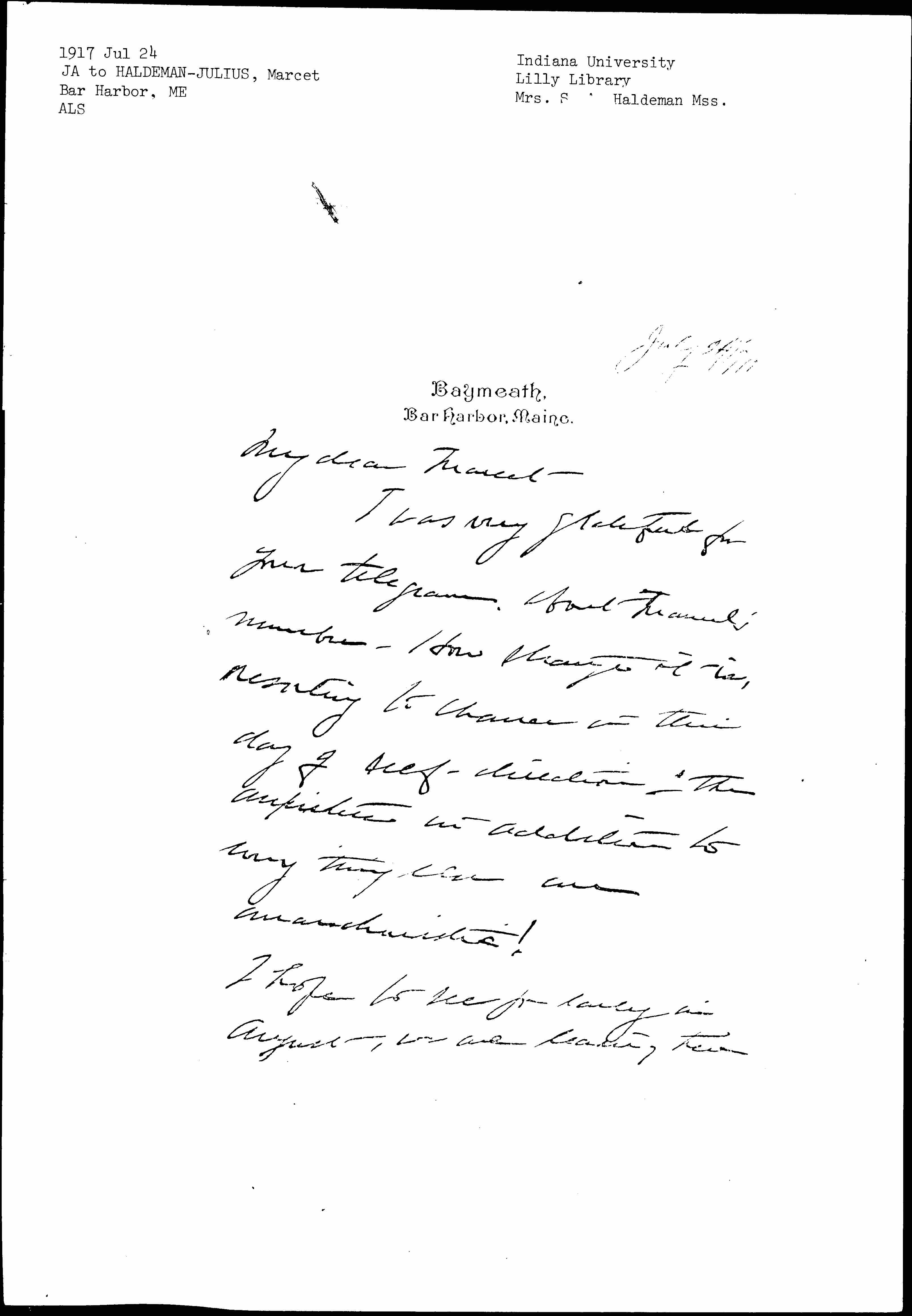 Bar Harbor is as beautiful as ever [although] misty and cold. My love to the household & to the mother of it -- Always your loving Aunt Jane Addams.