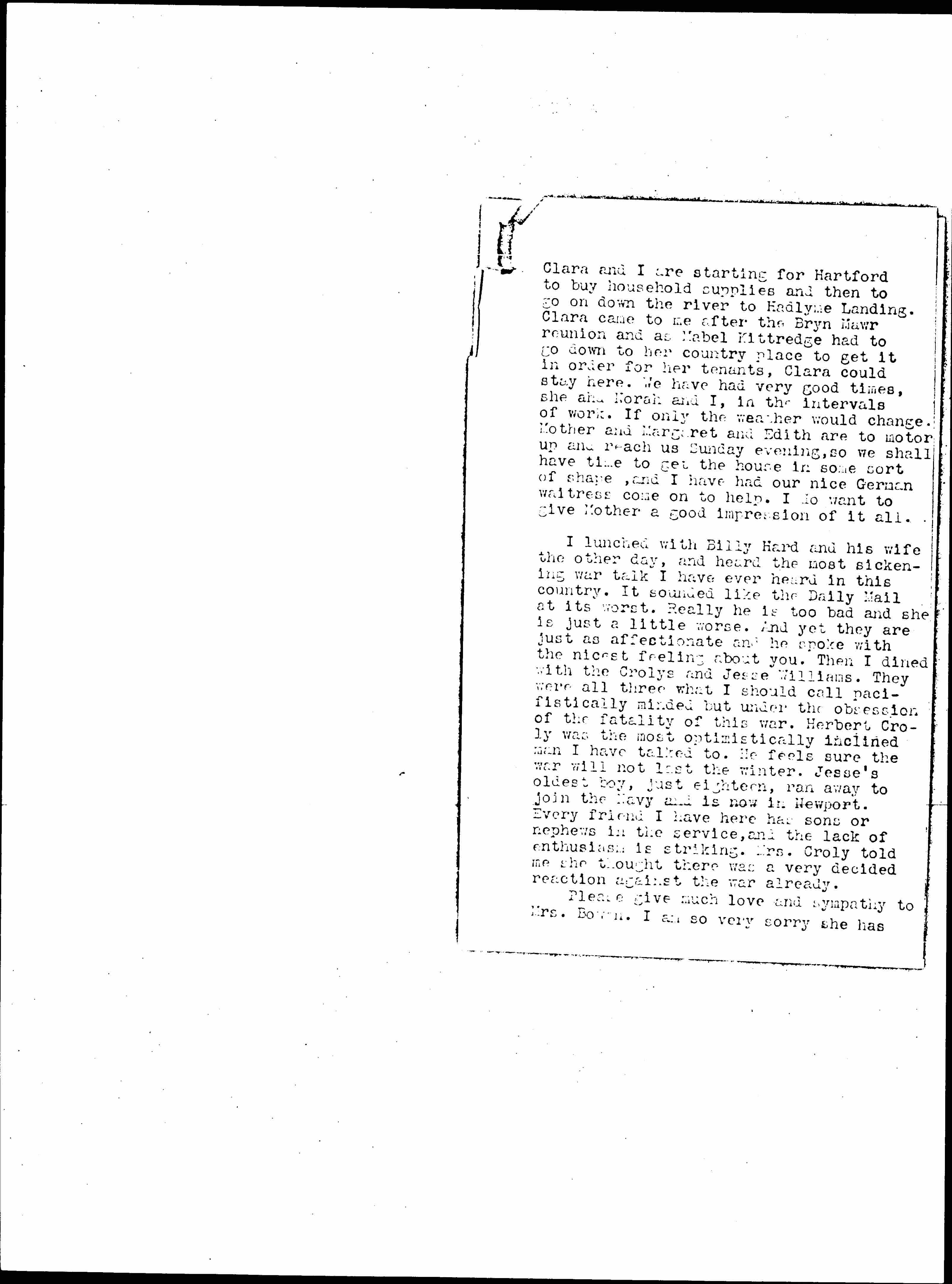 I have finished my New York part of the [airplane] inquiry and this morning [page 2] Clara and I are starting for Hartford to buy household supplies and then to go on down the river to Hadlyme Landing. Clara came to me after the Bryn Mawr reunion and as Mabel Kittredge had to go down to her country place to get it in order for her tenants, Clara could stay here. We have had very good times, she and Norah and I, in the intervals of work. If only the weather would change. Mother and Margaret and Edith are to motor up and reach us Sunday evening, so we shall have time to get the house in some sort of shape, and I have had our nice German waitress come on to help. I do want to give Mother a good impression of it all.