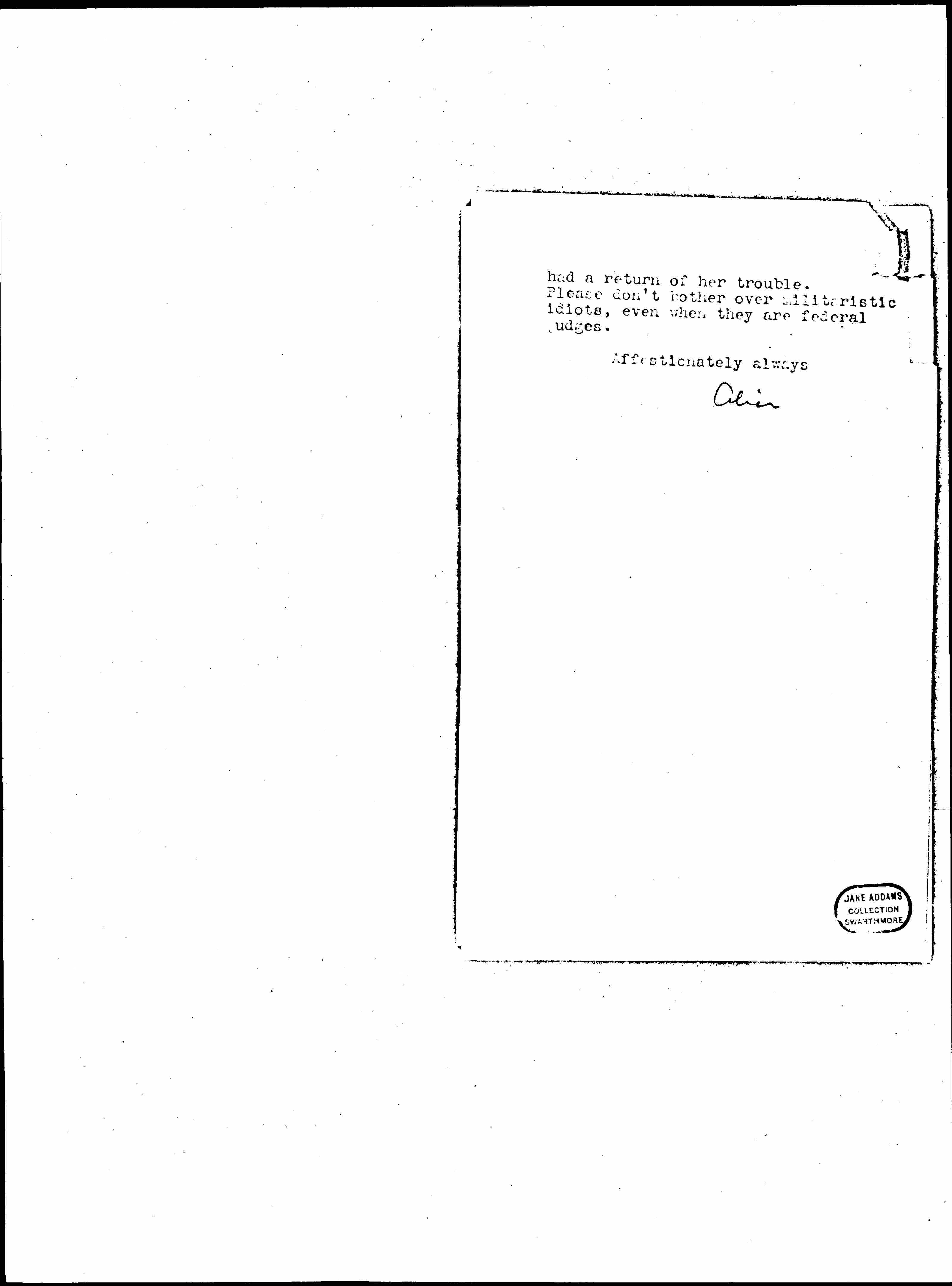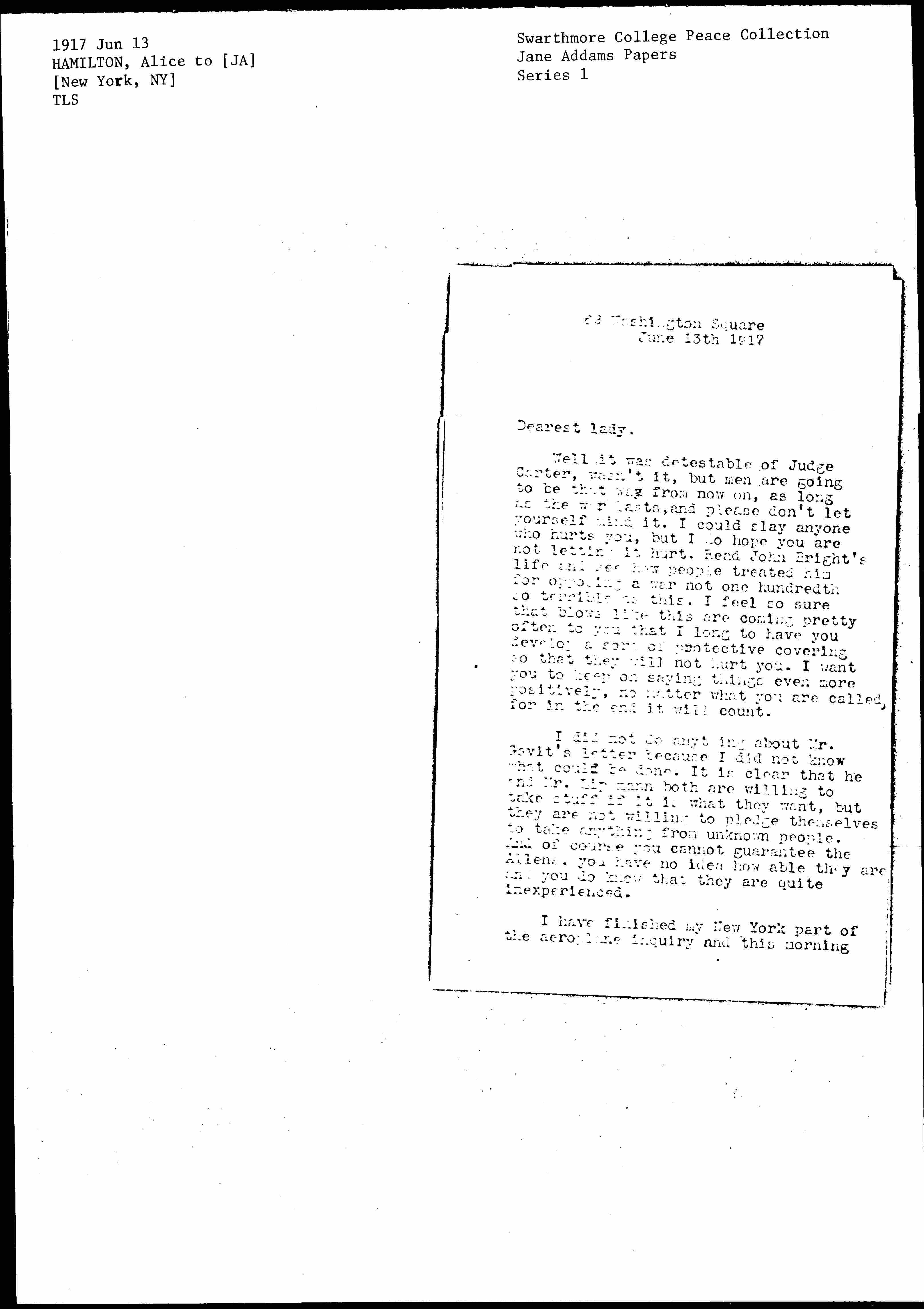 Well it was detestable of Judge Carter, wasn't it, but men are going to be that way from now on, as long as the war lasts, and please don't let yourself mind it. I could slay anyone who hurts you, but I do hope you are not letting it hurt. Read John Bright's life and see how people treated him for opposing a war not one hundredth so terrible as this. I feel so sure that blows like this are coming pretty often to you that I long to have you develop a sort of protective covering so that they will not hurt you. I want you to keep on saying things even more positively, no matter what you are called, for in the end it will count.