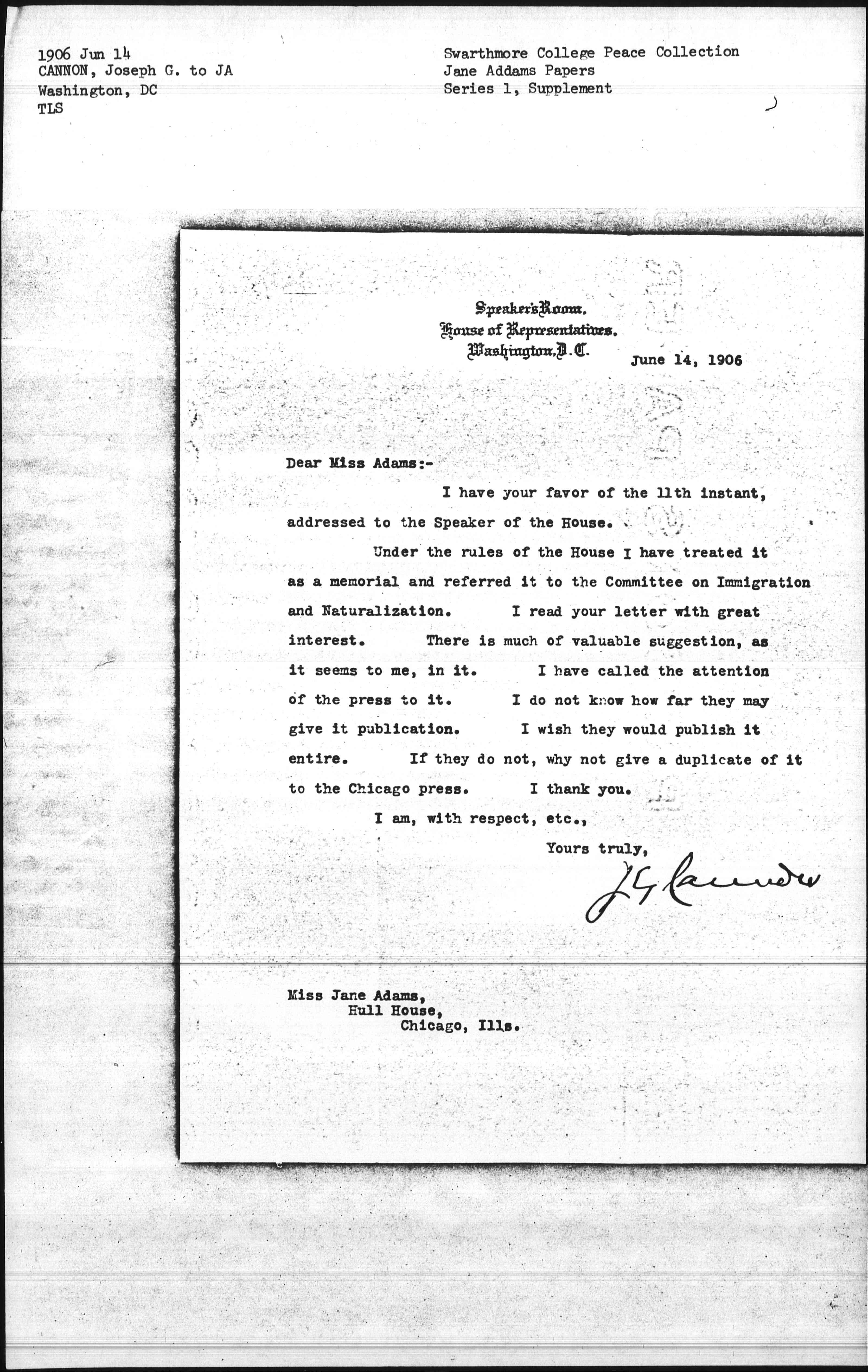 Under the rules of the House I have treated it as a memorial and referred it to the Committee on Immigration and Naturalization. I read your letter with great interest. There is much of valuable suggestion, as it seems to me, in it. I have called the attention of the press to it. I do not know how far they may give it publication. I wish they would publish it entire. If they do not, why not give a duplicate of it to the Chicago press. I thank you.